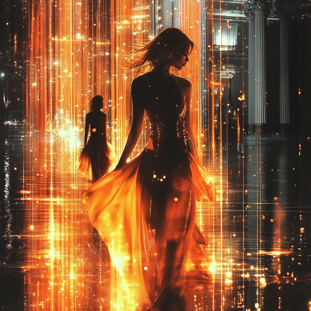 The lighting uses intense brightness to emphasize the fluidity and energy of orange tones, contrasted with deep black elements. Texture is captured through the luminous streams that impart a sense of movement, while the spatial arrangement is layered to allow the light to dominate.