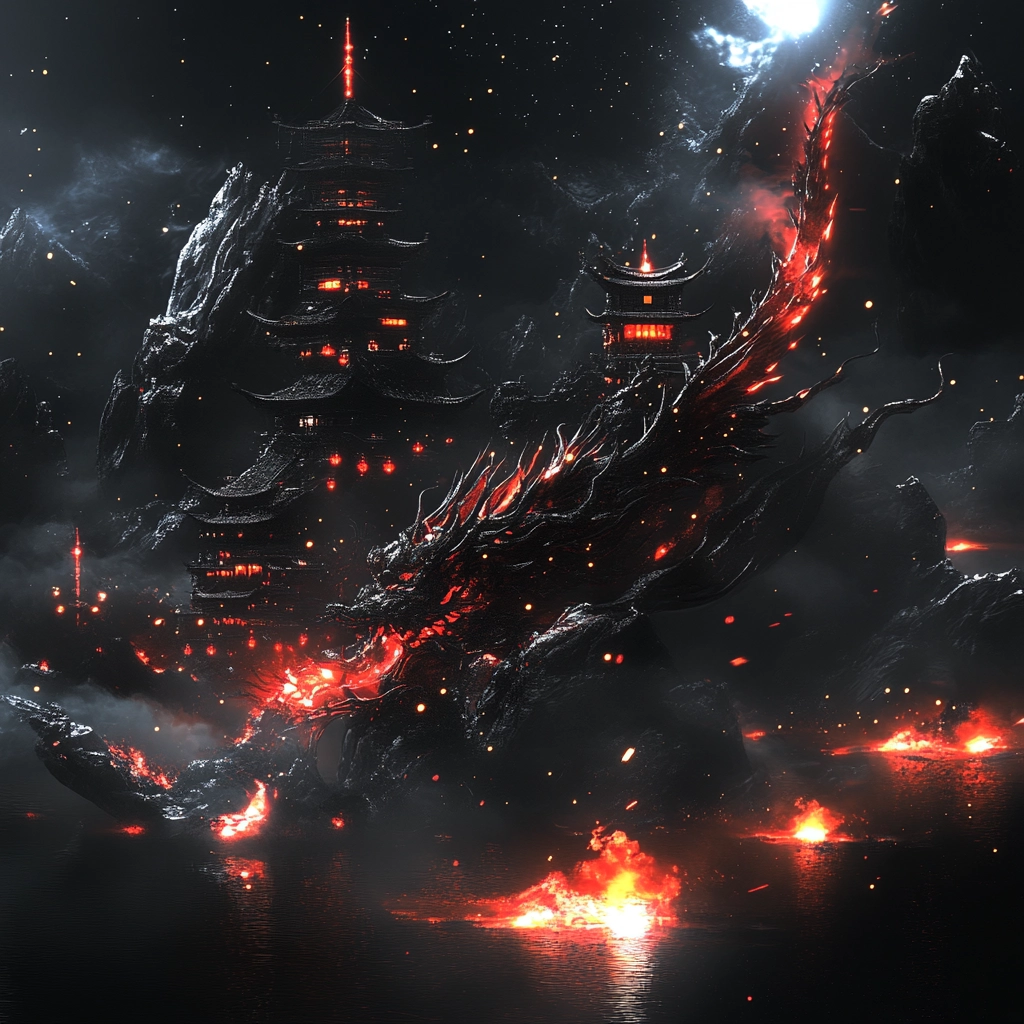 Intense contrasts with dynamic lighting and bold color effects.