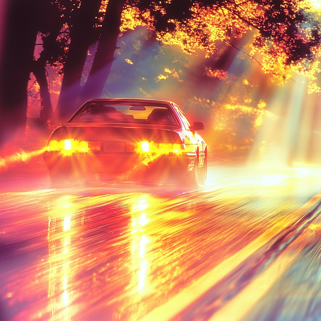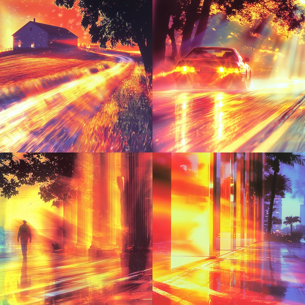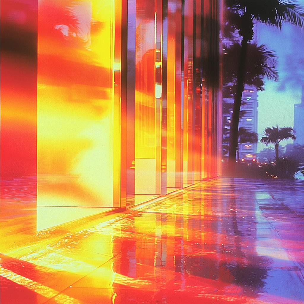 Intense light contrasts with vibrant colors on glossy surfaces.