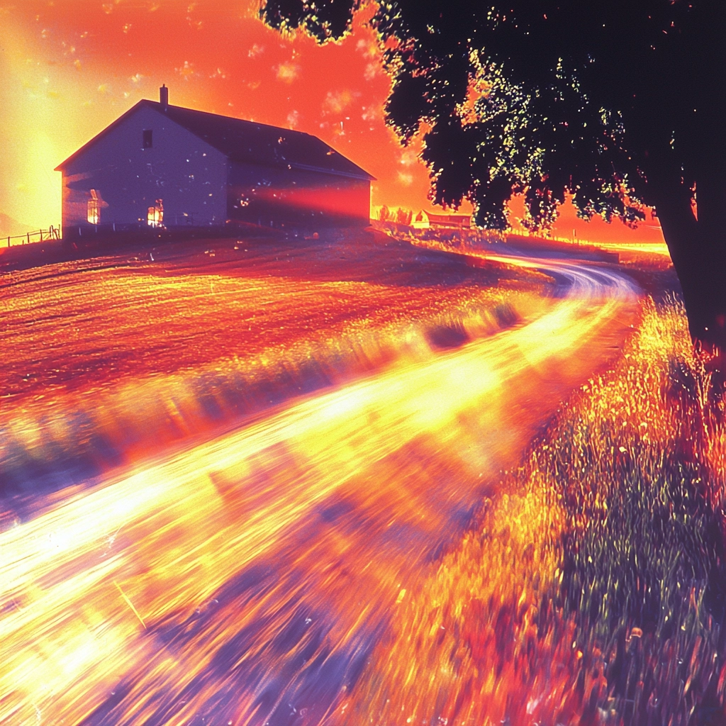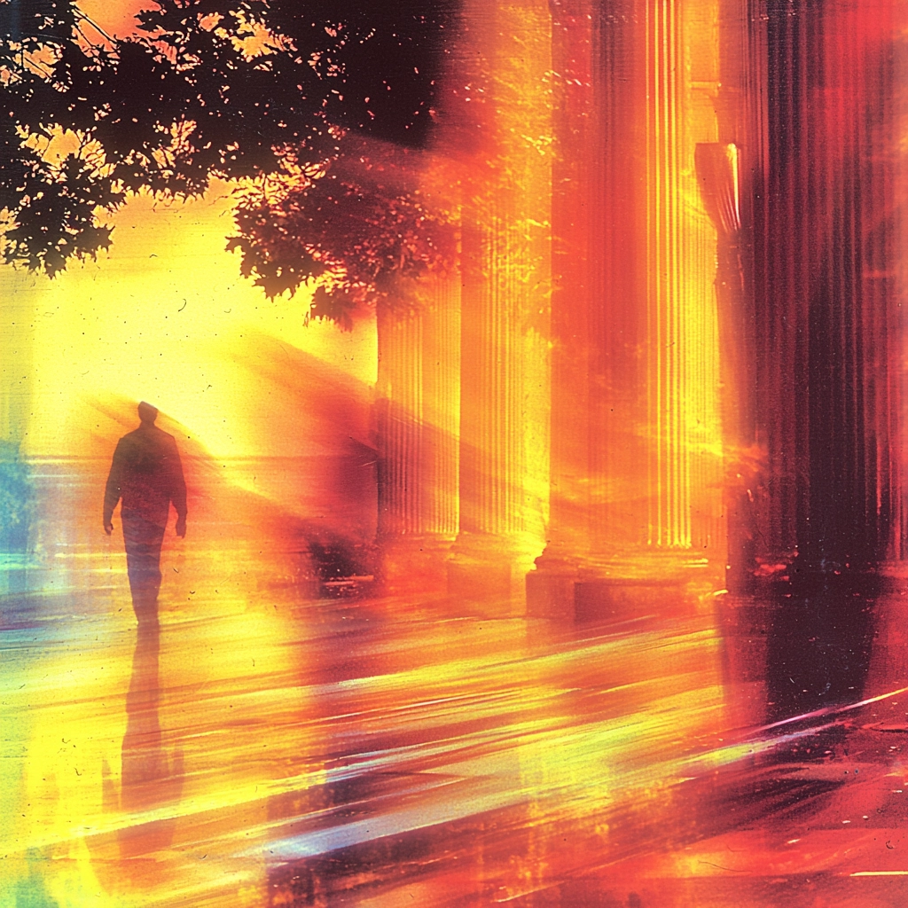 Dramatic lighting enhances bright yellows and oranges, creating vivid reflections on shiny textures. The spatial presentation incorporates deep perspectives and layered depths, within a vivid and defined environment.