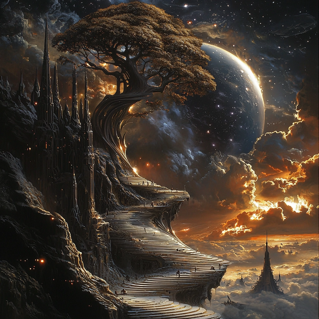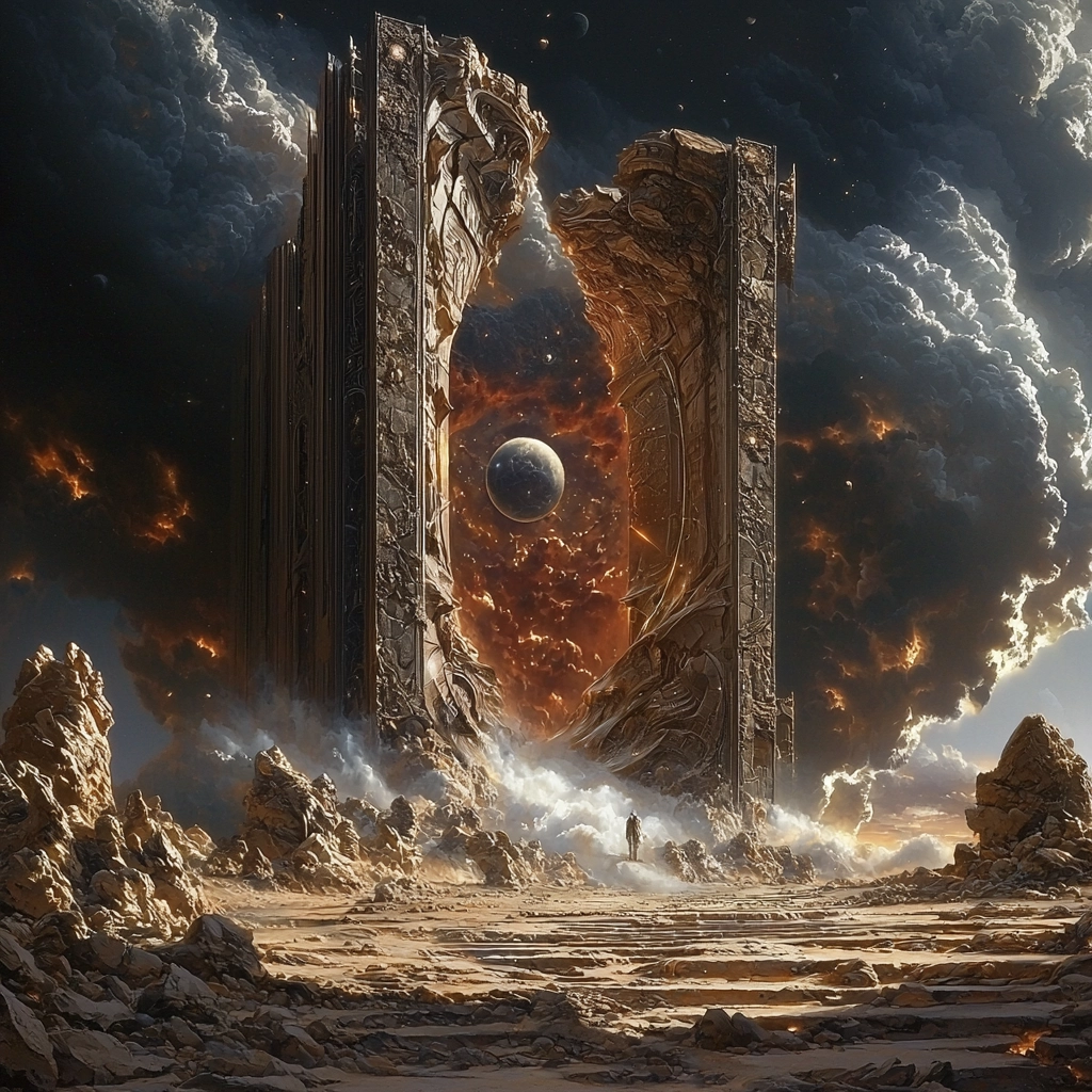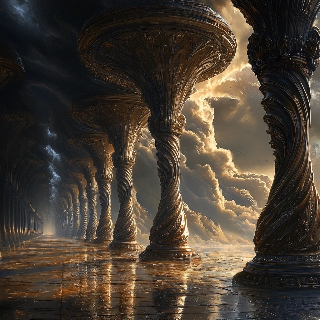 Dramatic lighting contrasts highlight the swirling textures and intricate details within the expansive compositions. The rich dark blue provides depth, complemented by lustrous gold and grounded shades of brown, effectively creating a complex spatial realm with meticulous texture modulation.
