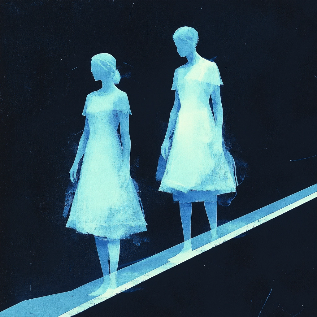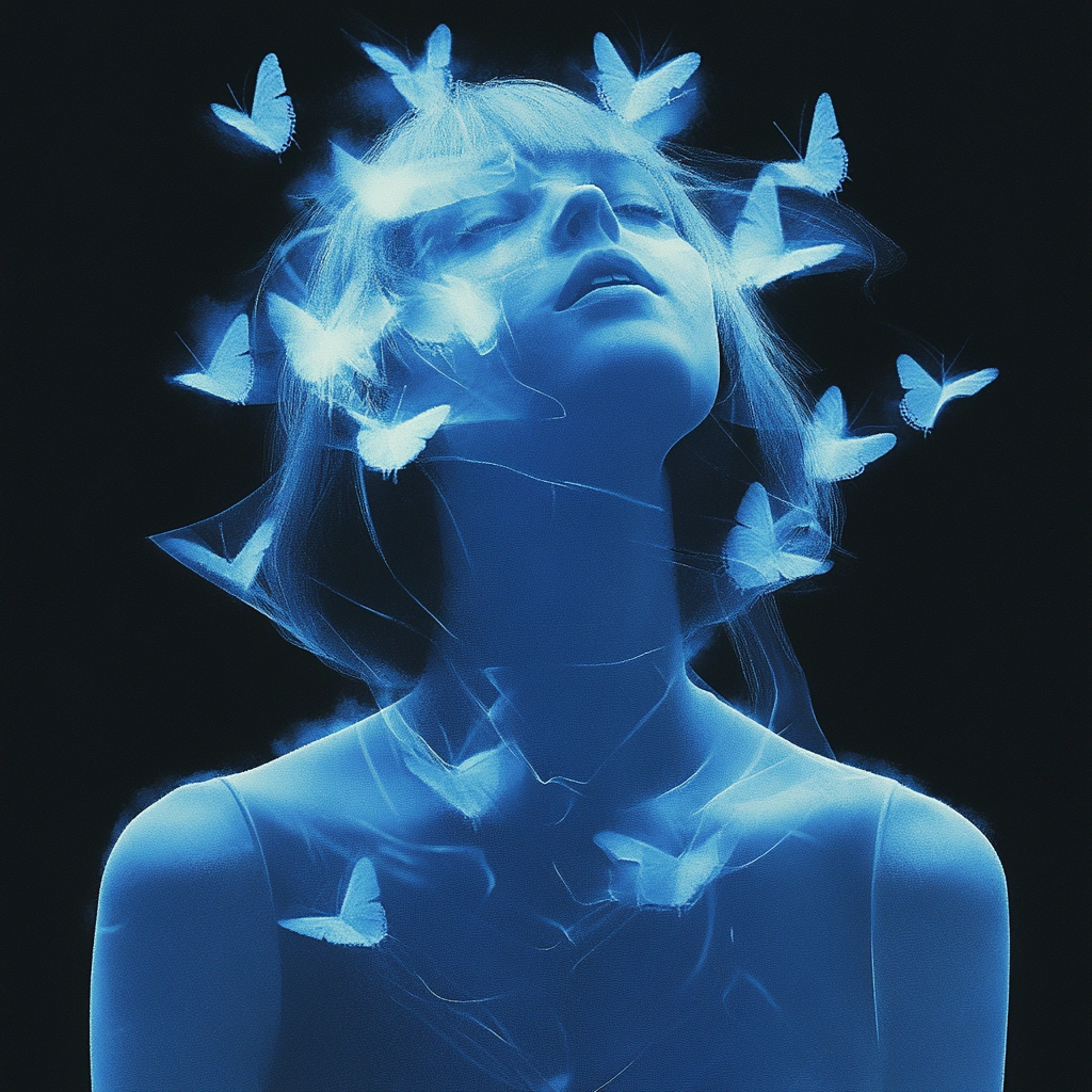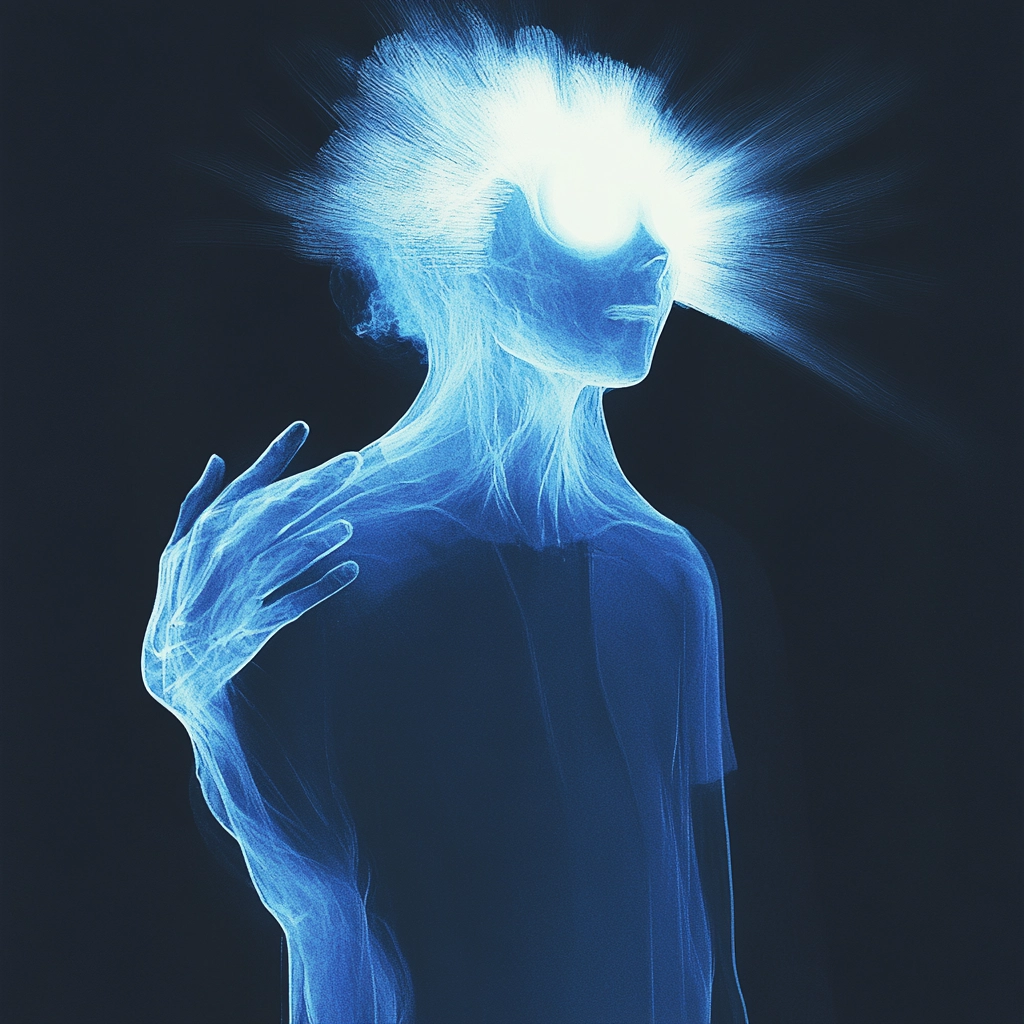 Soft, glowing blue lighting emphasizes the contours, creating an ethereal presence while maintaining sharp, well-defined lines. The use of contrast with the black background accentuates the luminous figures, adding depth and a dynamic spatial sense. The textures are portrayed smoothly, with light effects suggesting movement and energy.