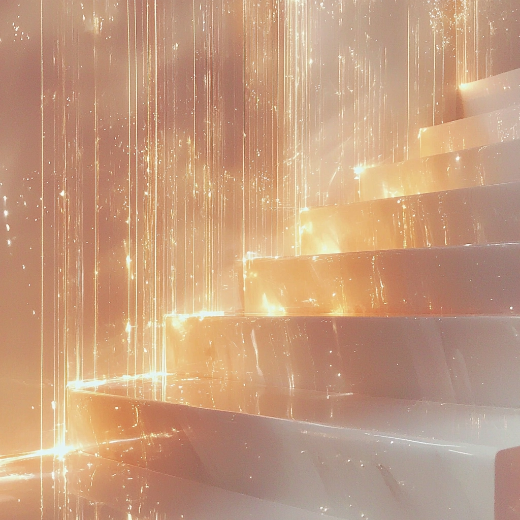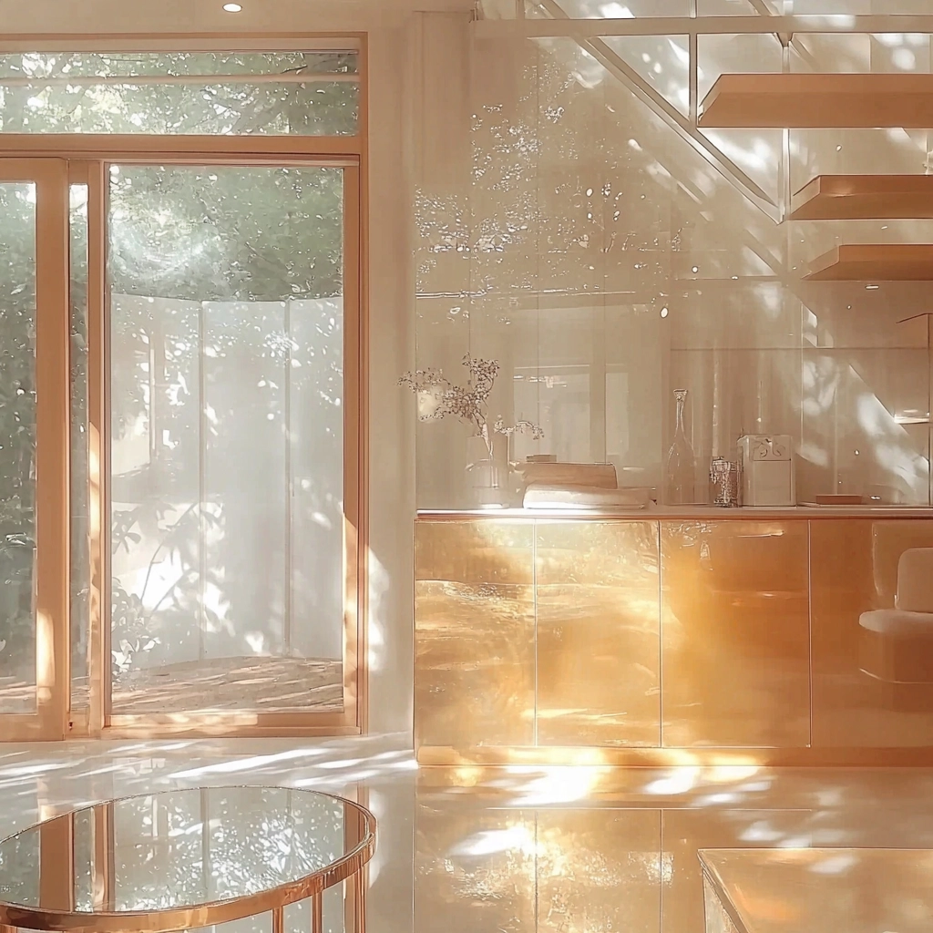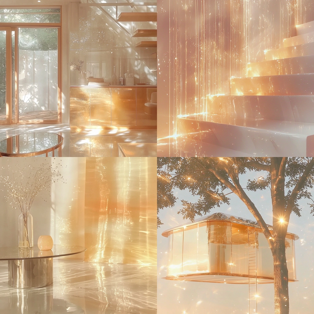 Gentle, diffused lighting softens the visual field, producing warm reflections and a glowing appearance. The gold tones partner with soft whites to create layers of shimmering textures, offering depth and an expansive sense of space.