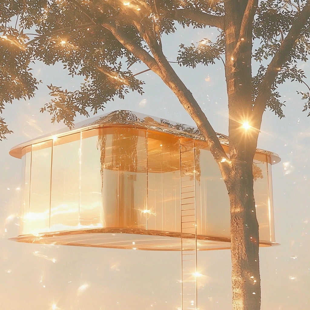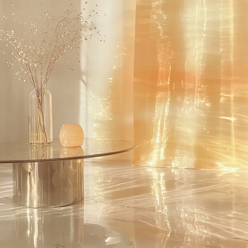 The composition uses a soft and diffused light effect highlighting gold hues creating radiant reflections paired with a warm, inviting tone.
