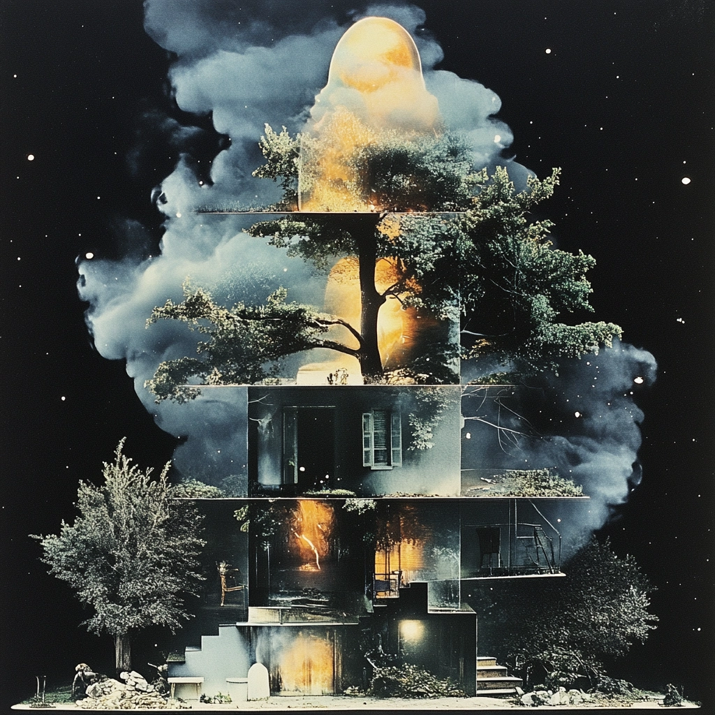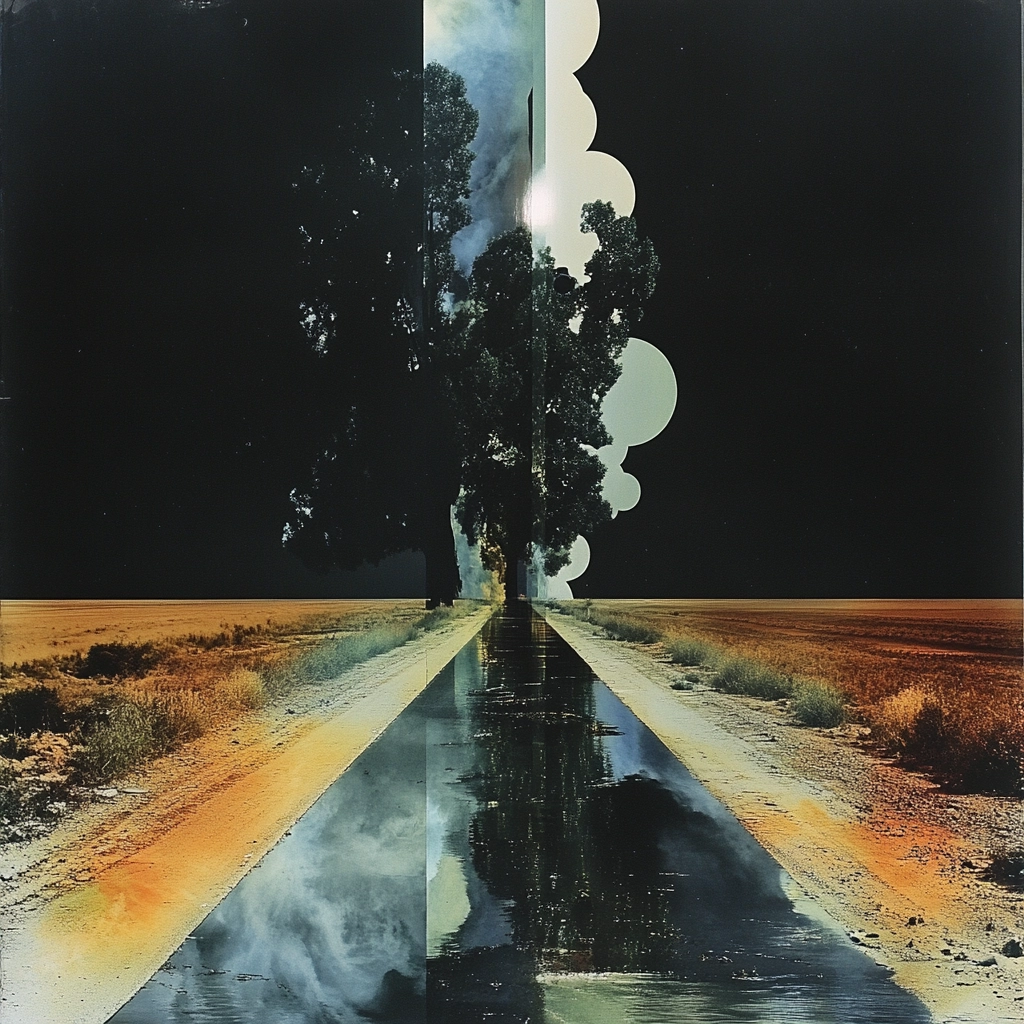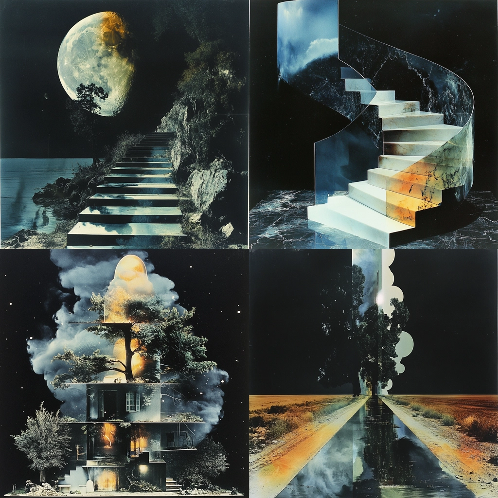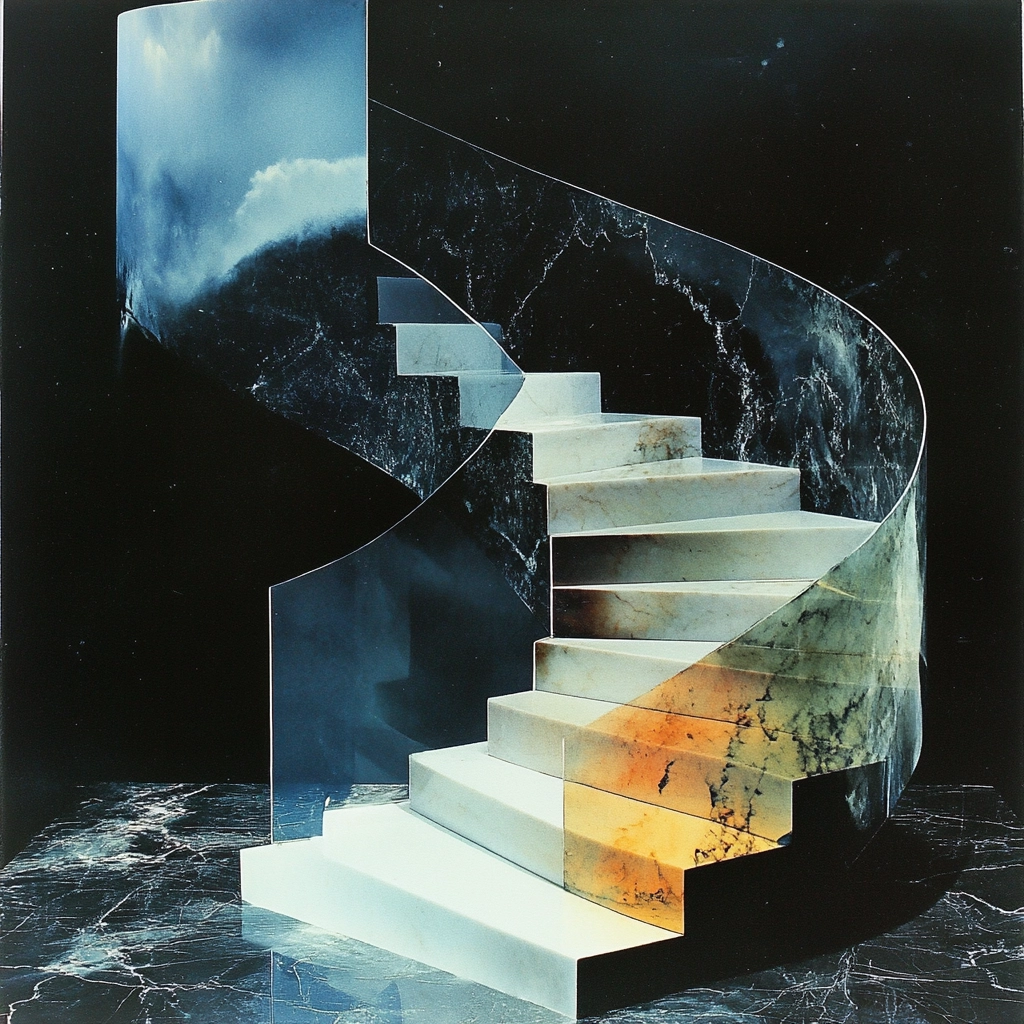 Lighting highlights contrasts, with dark blues accentuating bright surfaces. Stairs provide a spatial interplay, featuring textures mimicking natural stone and reflective water. The composition has a structured yet fluid spatial sense.