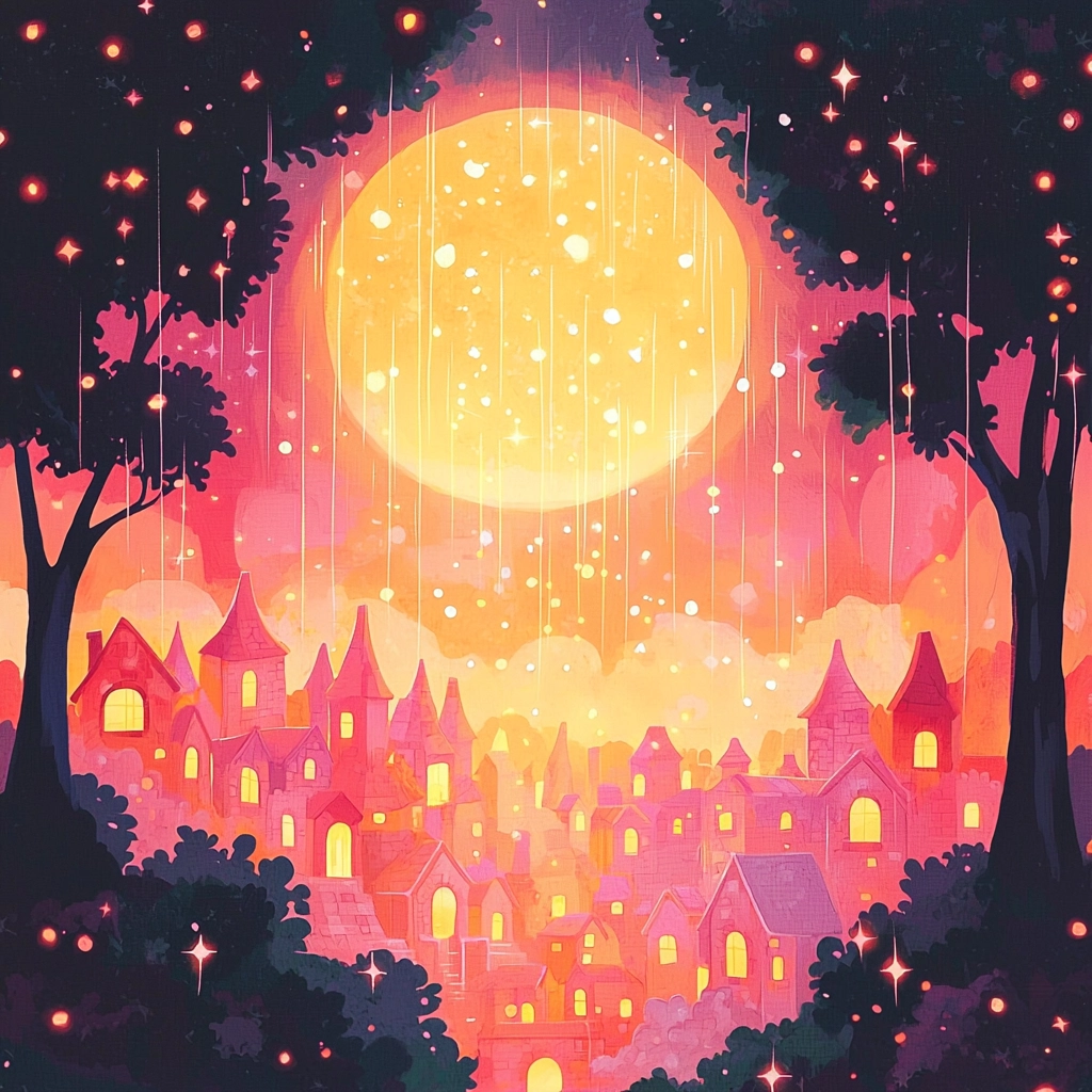 The use of vibrant orange and pink hues evokes warmth, with shimmering light effects enhancing the fantastical theme. The dynamic interplay of light and shadow creates a vivid spatial depth.