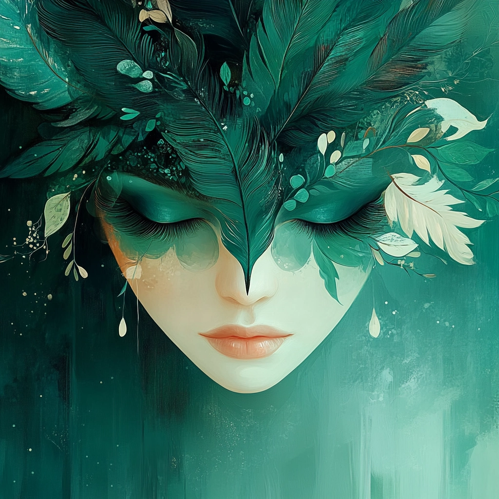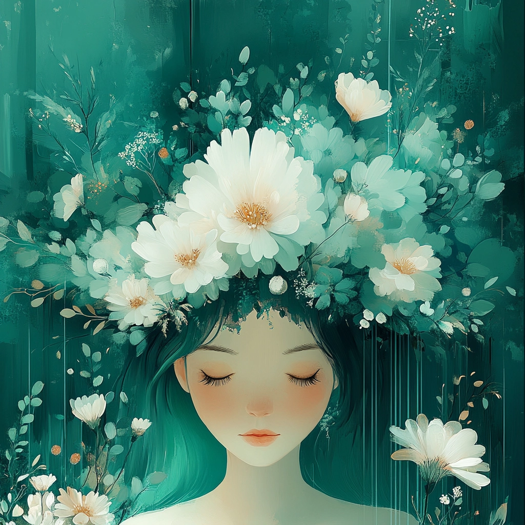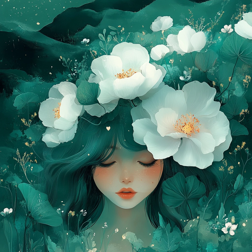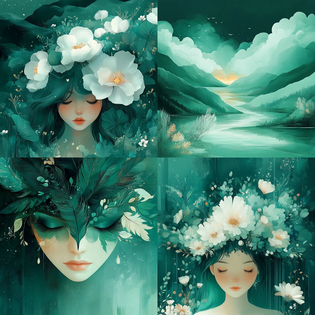 The scene highlights vivid greens with soft whites and dark hues, creating a tranquil yet vibrant balance.