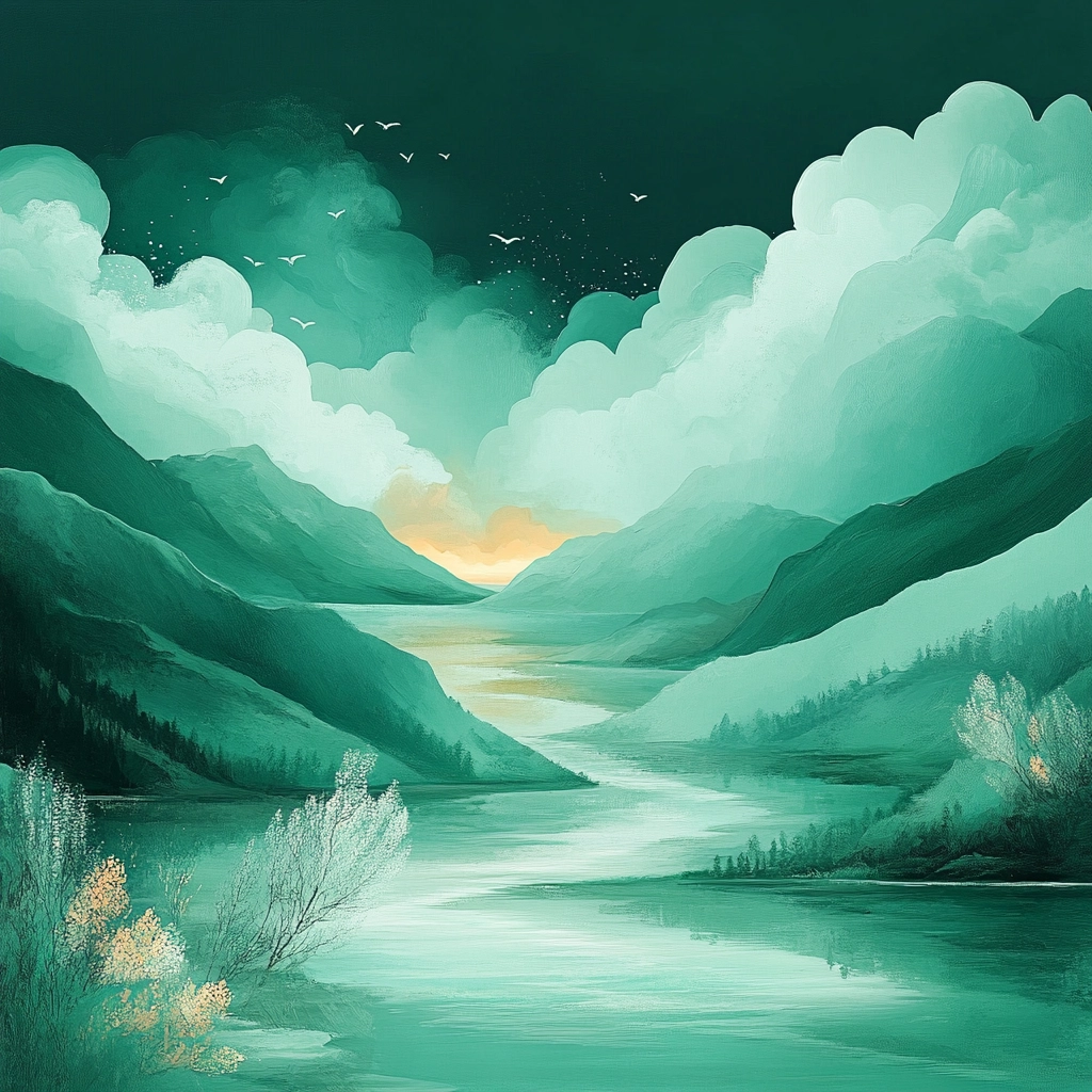 The lighting offers a gentle glow, suffusing the scene with a tranquil softness. Deep greens dominate the palette, contrasted by lighter tones. The depiction varies in texture from smooth expanses to detailed patterns, enhancing depth.
