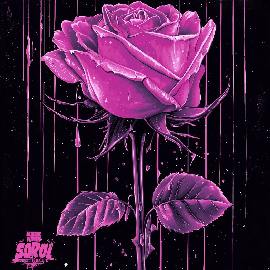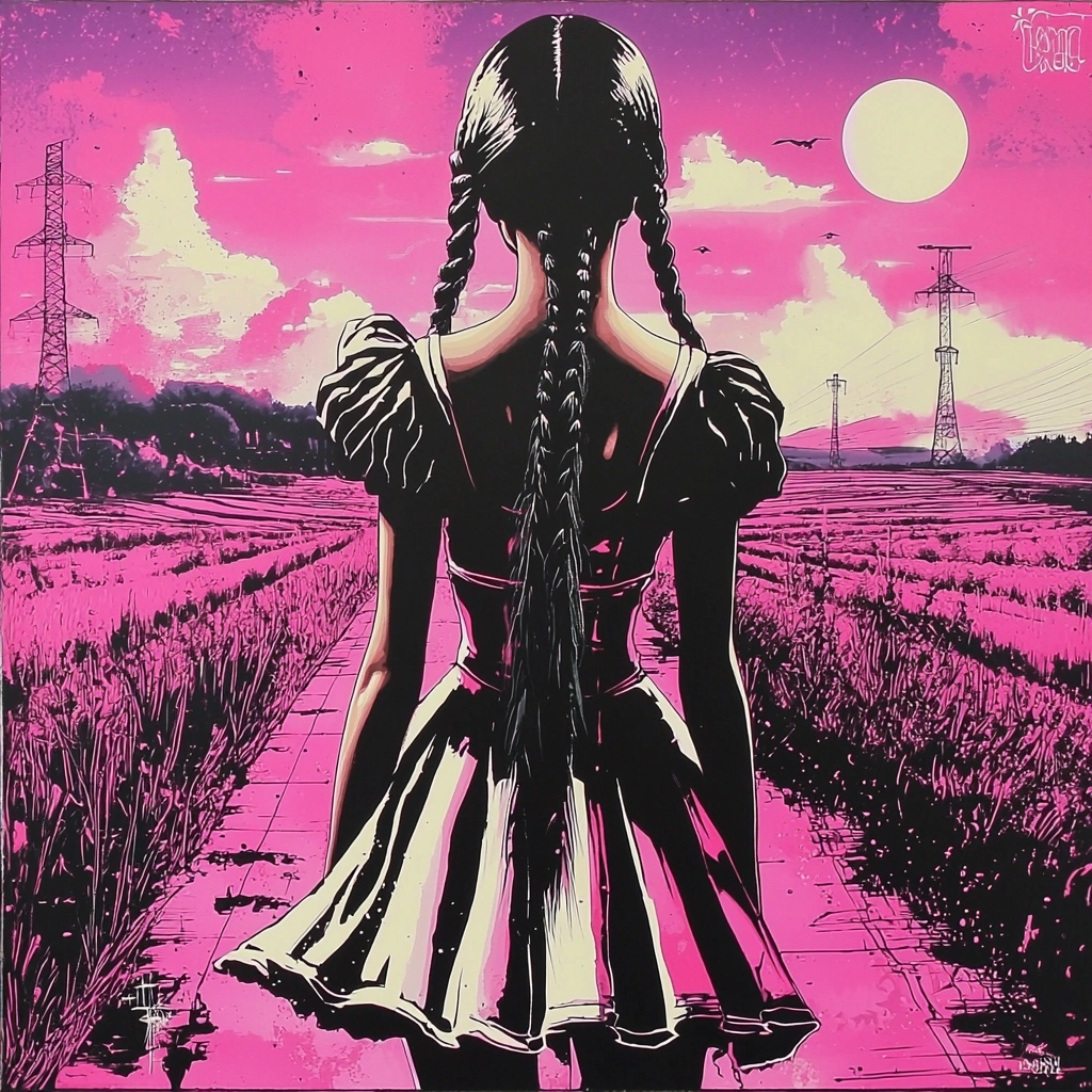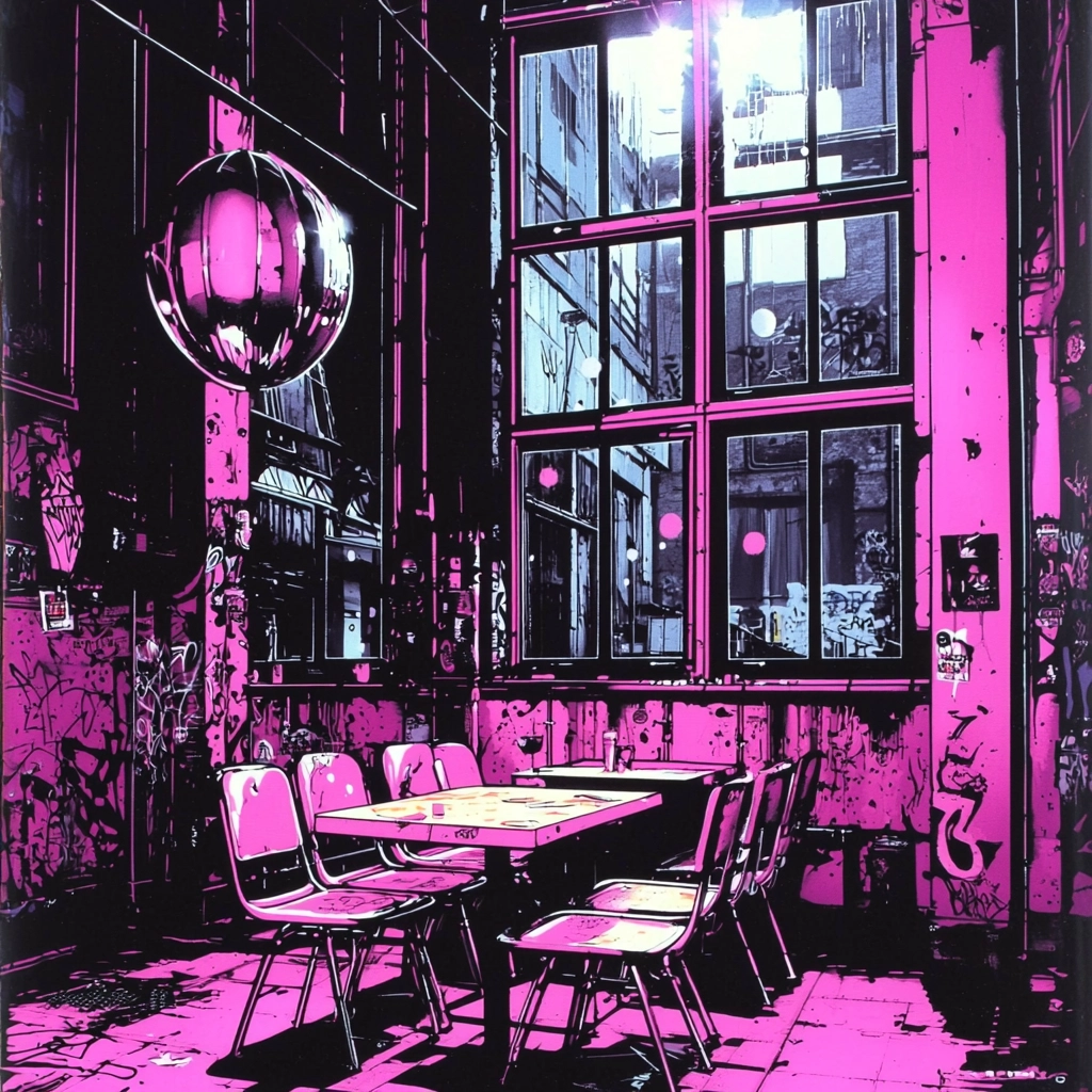 Bold contrast between neon pink highlights and deep black shadows creates a graphic and intense visual impact.