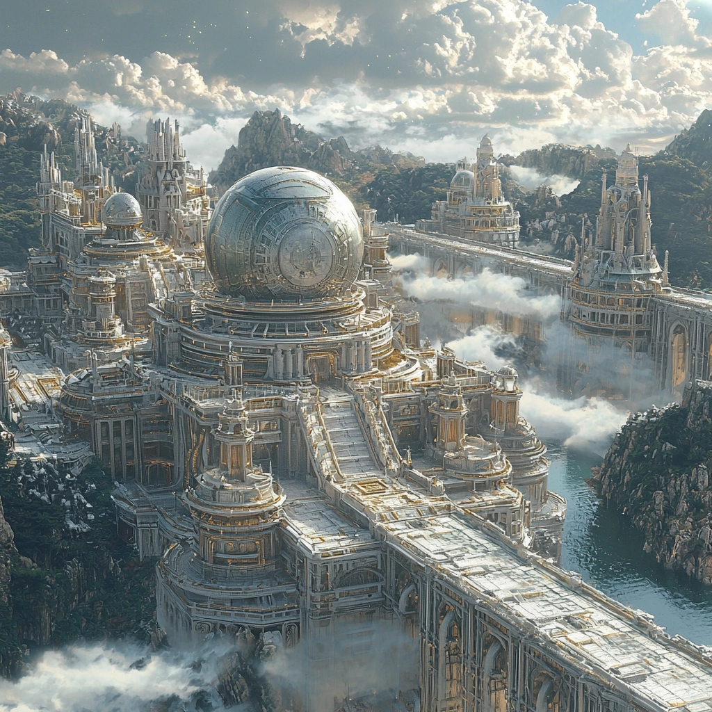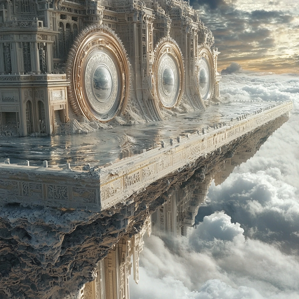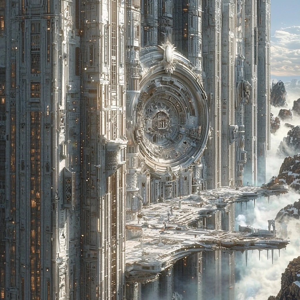 A sophisticated interplay between light and shadow enhances the intricate architectural surfaces, while the cool gray and blue hues contrast with gentle golden highlights, yielding a vast visual expanse with refined texture details.