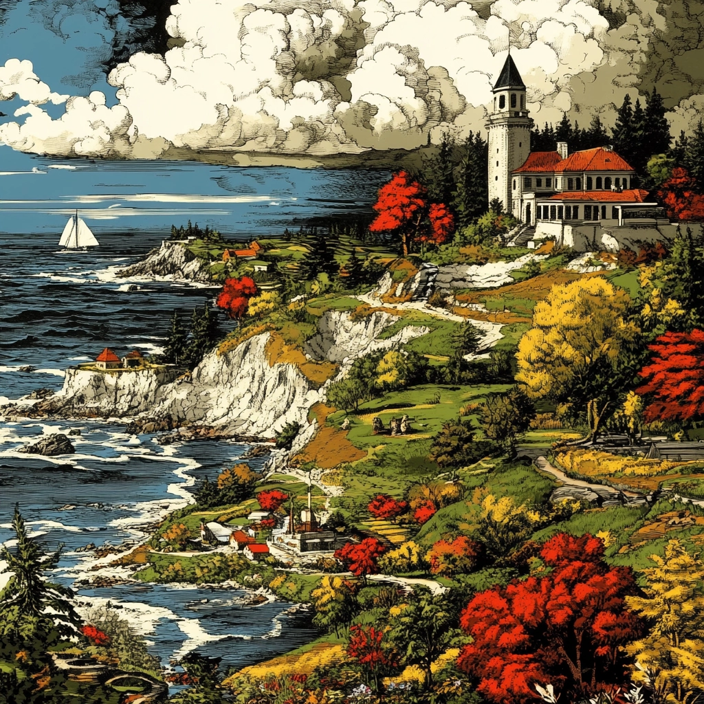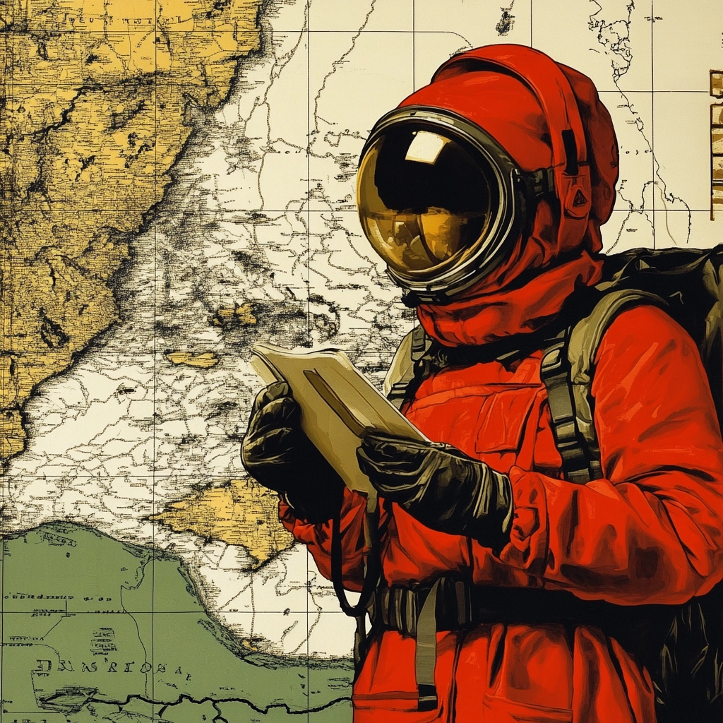 Bold lighting accentuates contrasting, saturated color patches against a backdrop of muted maps. The varied spatial layering creates an intriguing push-pull effect. Smooth textural detail enhances both the fine linework of maps and the bold color areas.