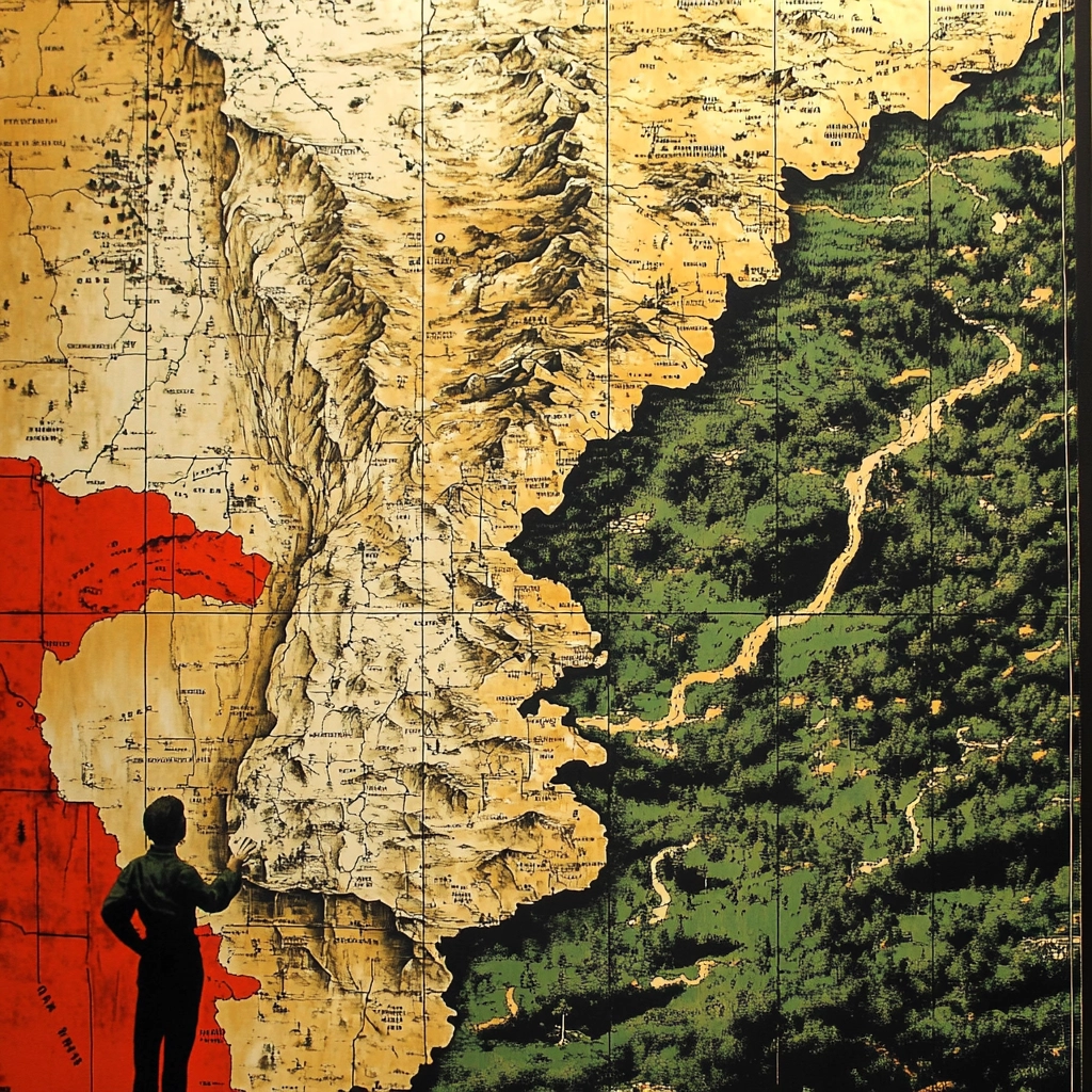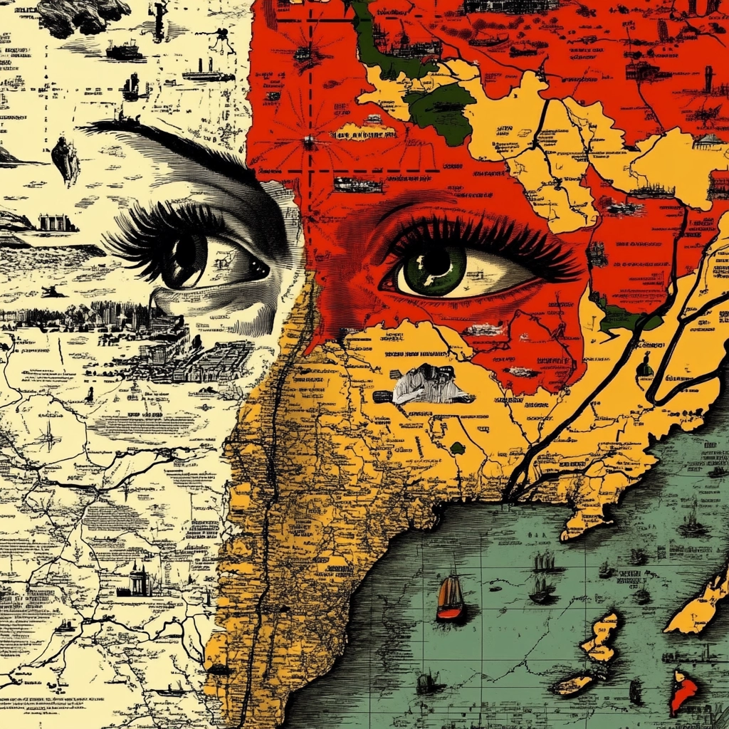 The composition integrates illustrative maps with vivid, contrasting patches.
