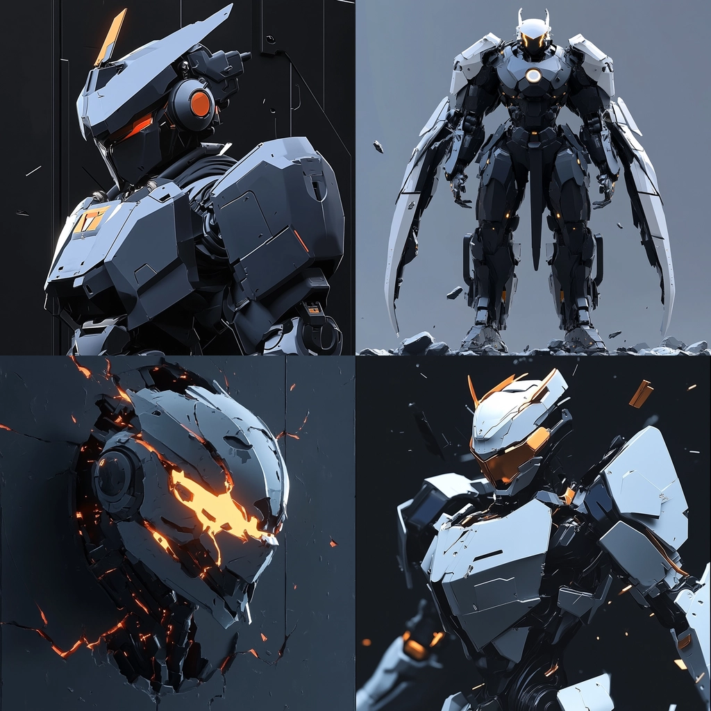 Lighting emphasizes reflective surfaces and edges, using stark contrasts between dark matte and bright glossy materials; glowing orange elements punctuate the cold gray base, enhancing depth and spatial separation; textures simulate metal hardness with smooth to fractured surfaces, while scattered fragments suggest dynamic decay or impact.