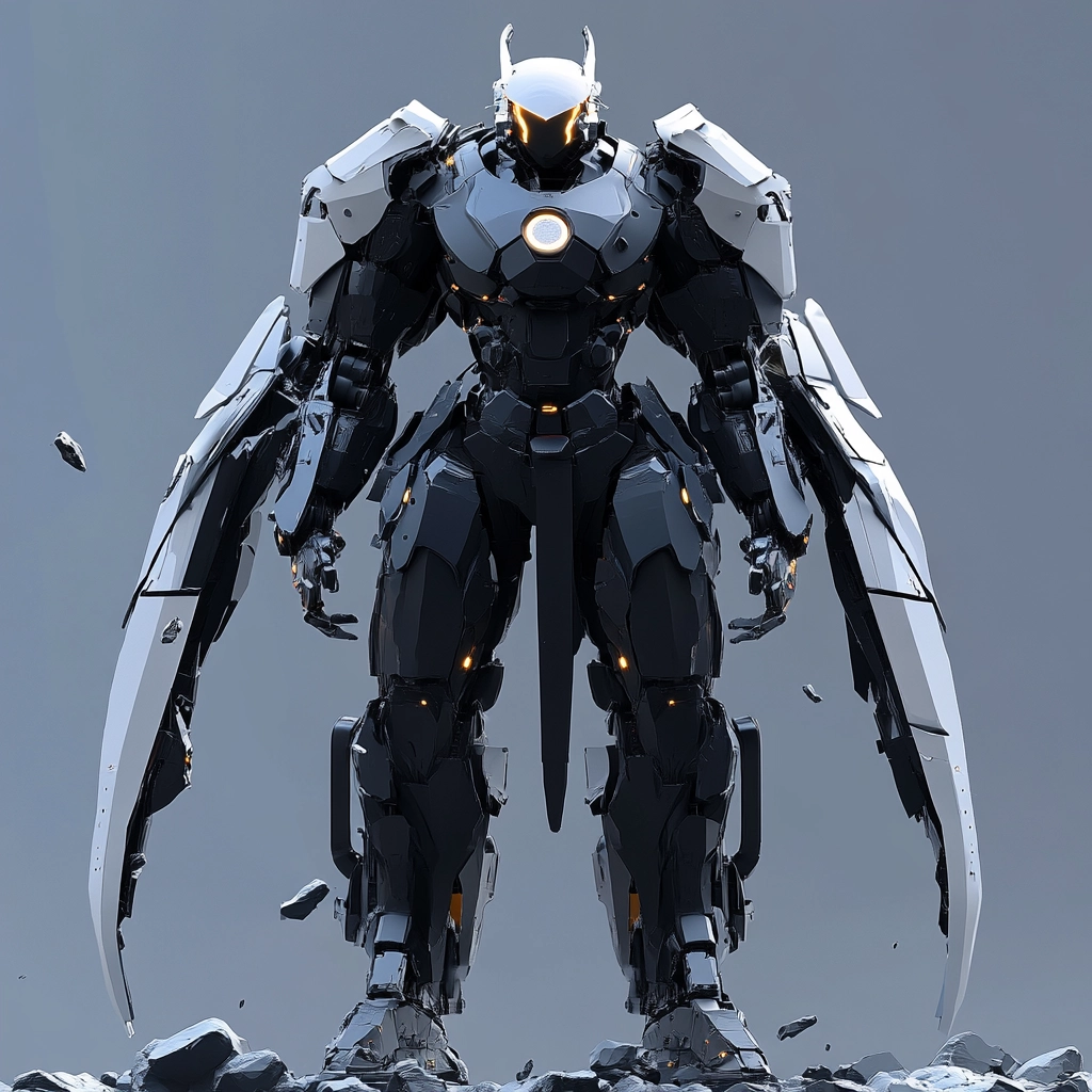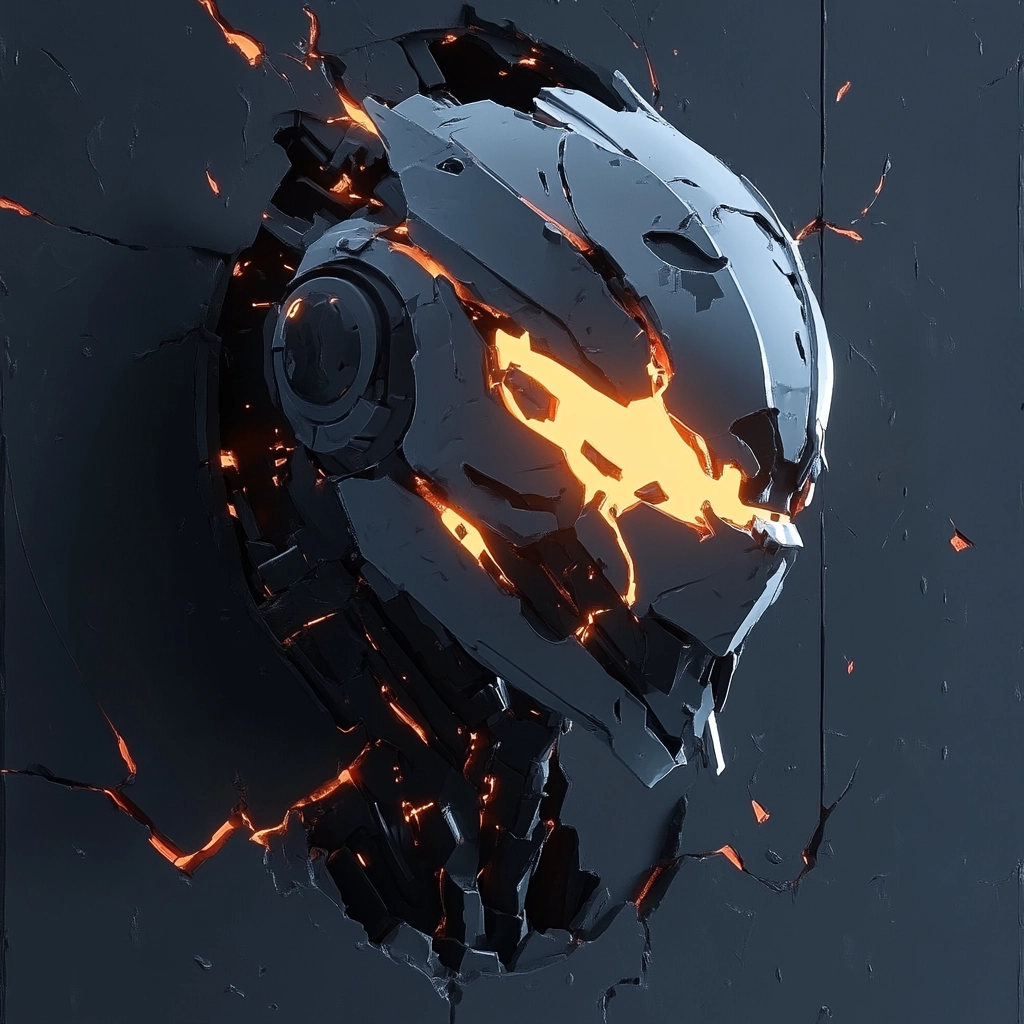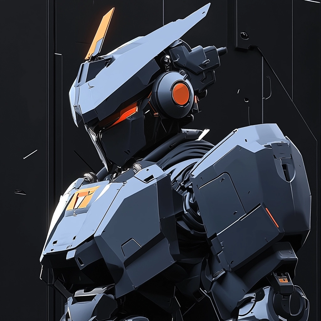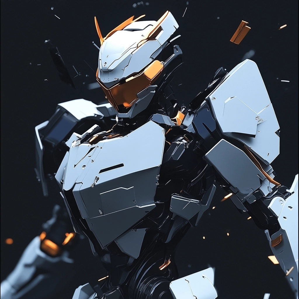 Sharp geometric shapes and layered plating contrasted by glowing orange highlights create a focused, high-tech composition with strong vertical and diagonal alignments.