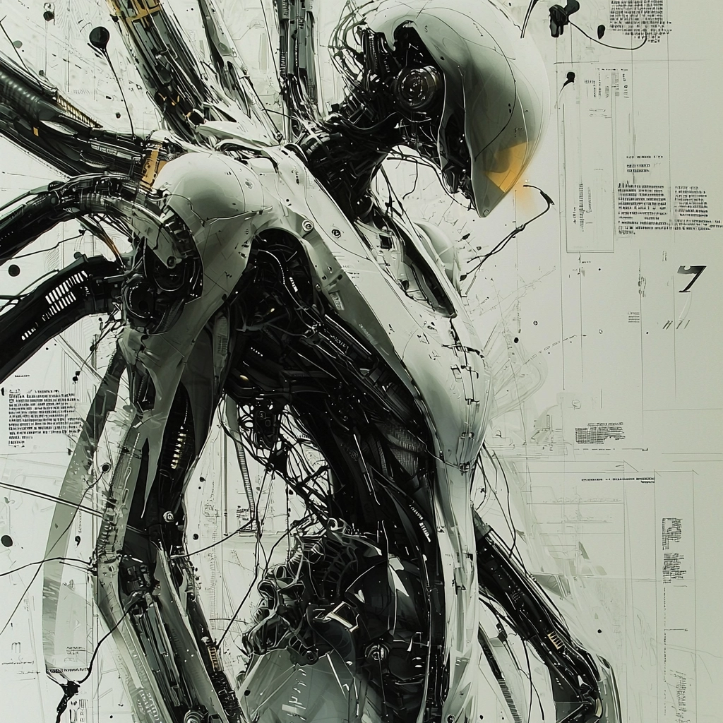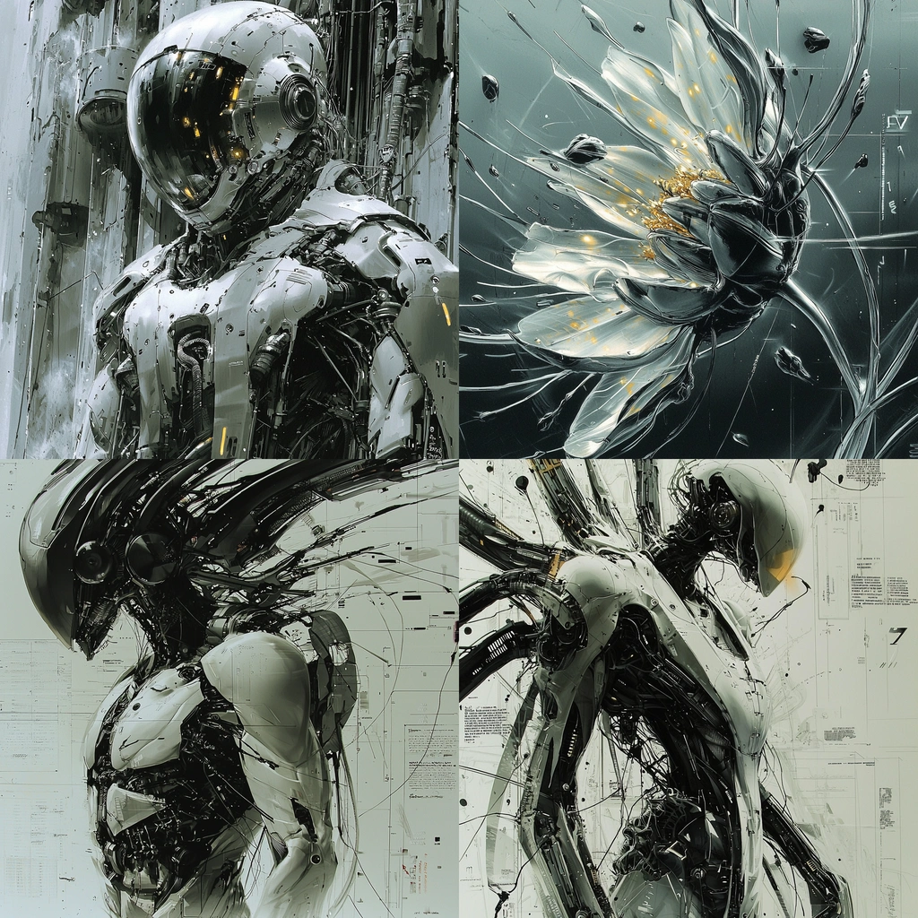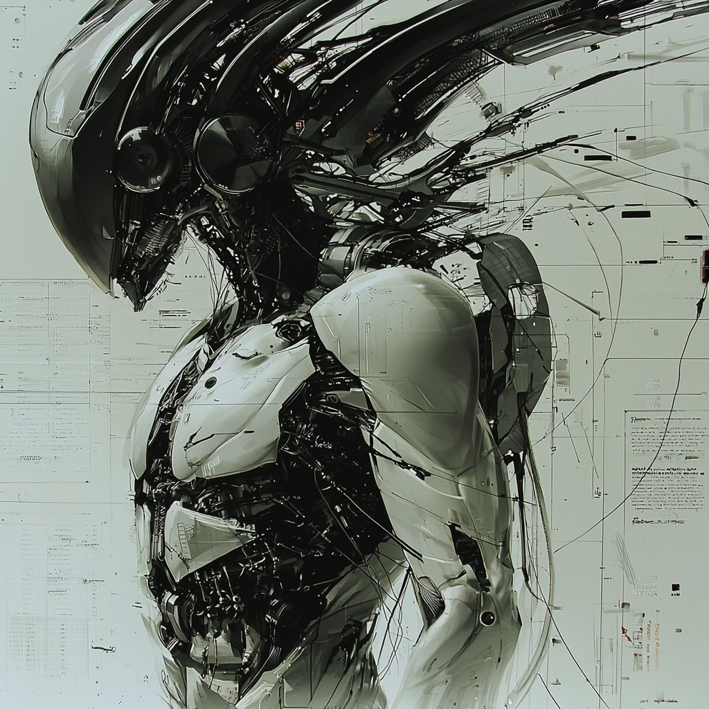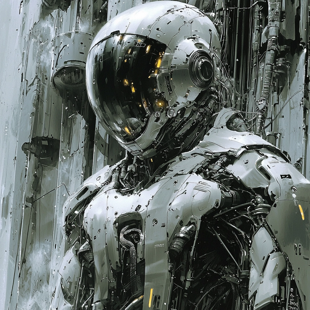 There is a polished metallic sheen on sculpted surfaces amidst darker shades that highlight form and structure. Illuminations are used strategically to emphasize contours and convey a sense of depth.