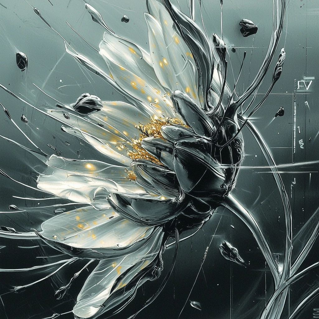 The composition features a sleek amalgamation of metallic hues and dark undertones.