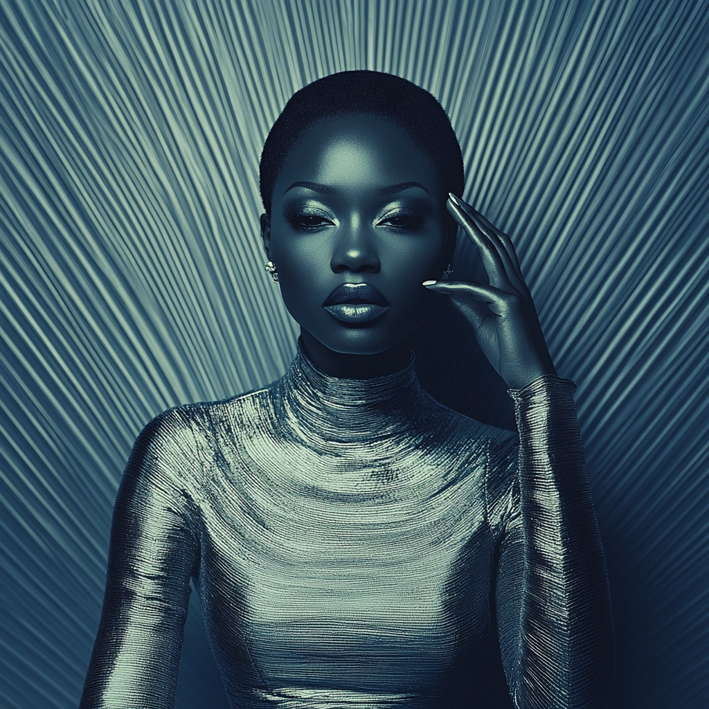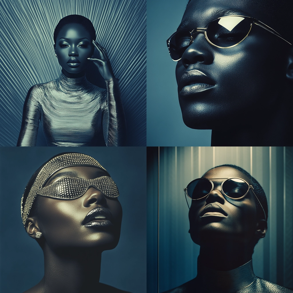 Silver skin highlighted with blue-toned lighting against simple backgrounds.