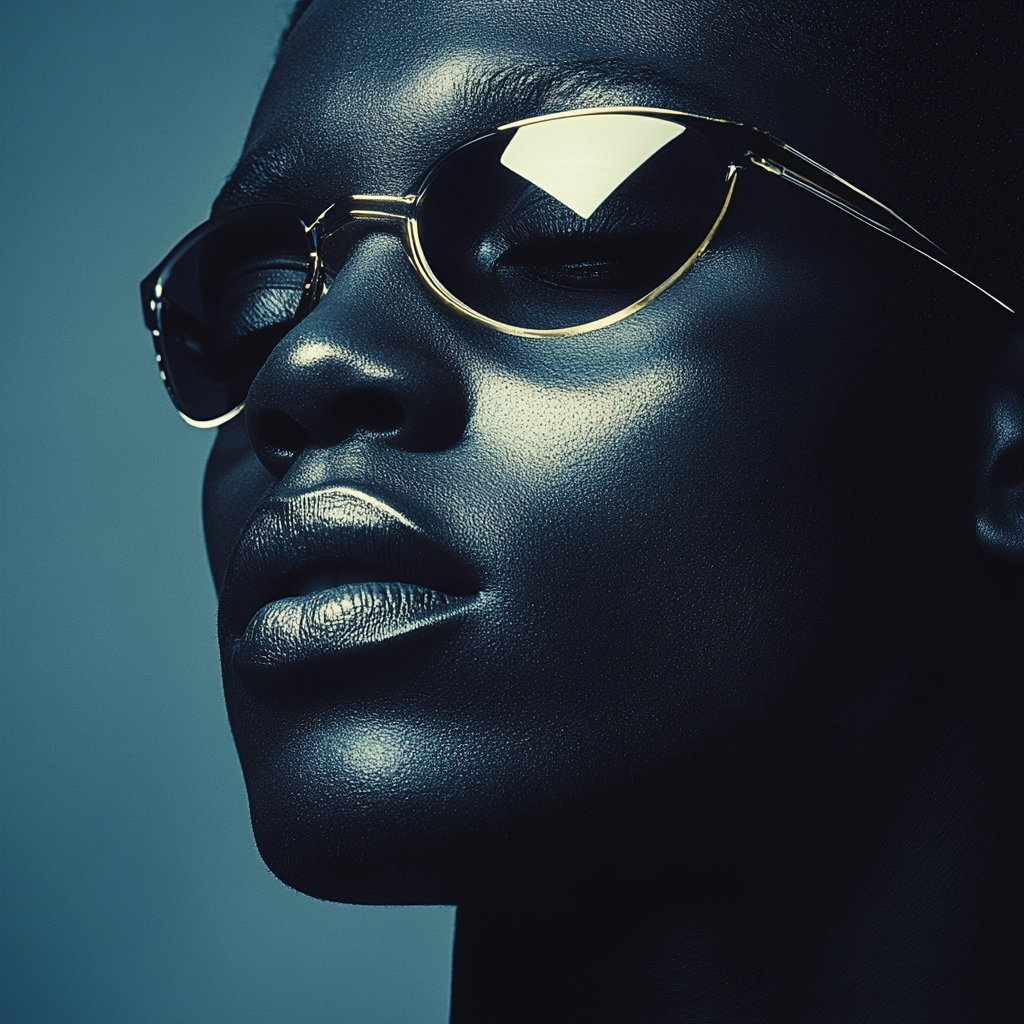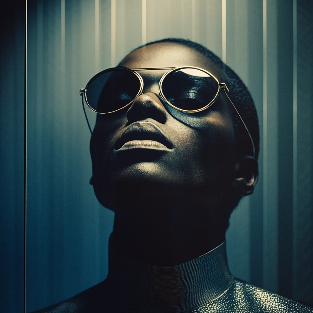 The metallic texture of the skin is accentuated by the cool, directional lighting, creating a reflective and smooth surface that contrasts with the dark, shadowed areas. The spatial depth is enhanced by the interplay of light and shadow, providing a sense of three-dimensionality.