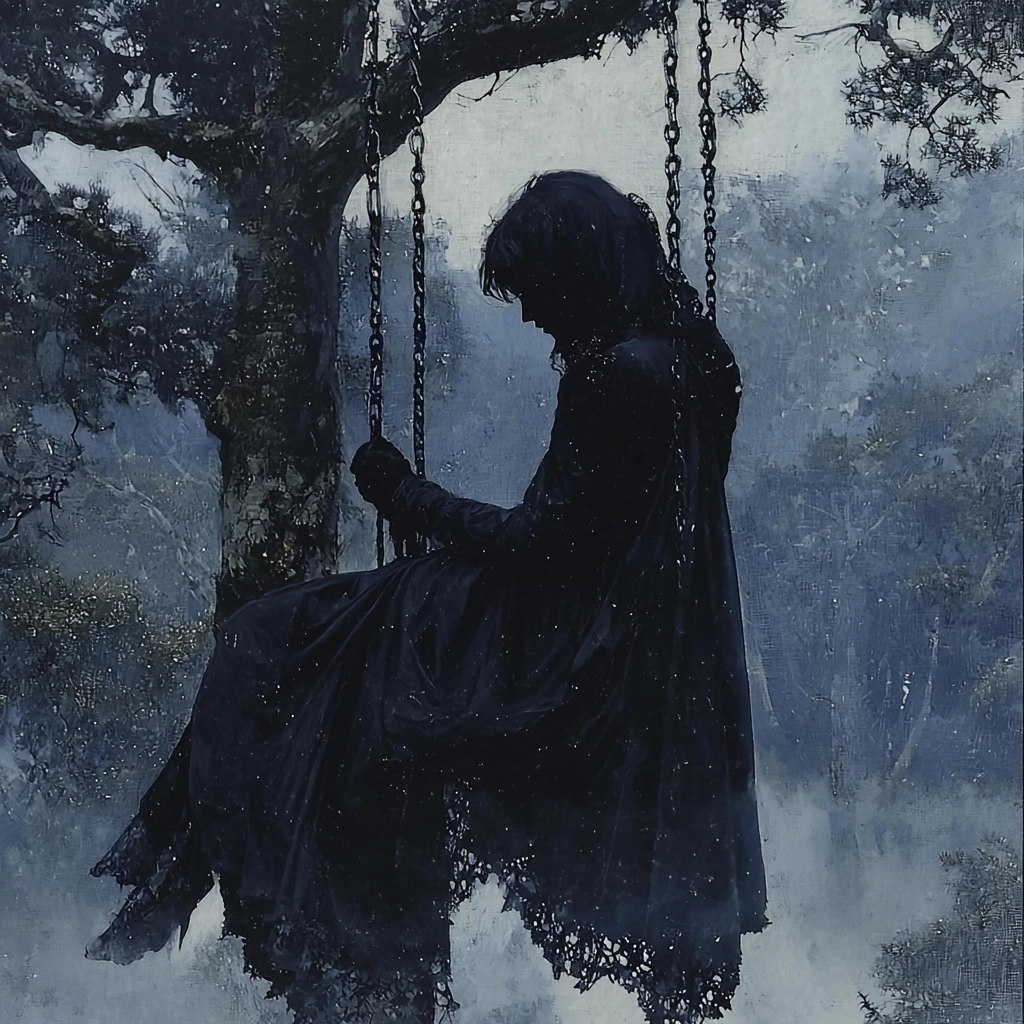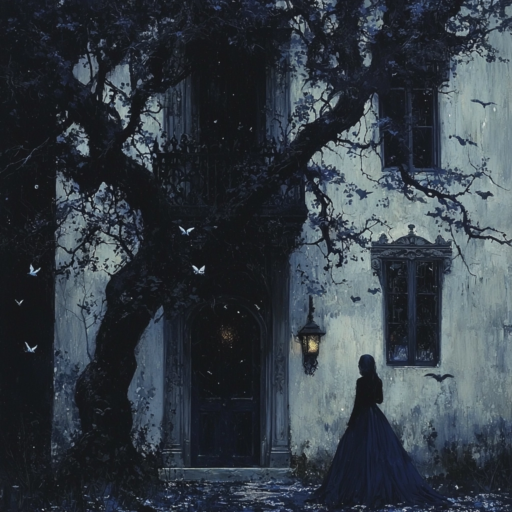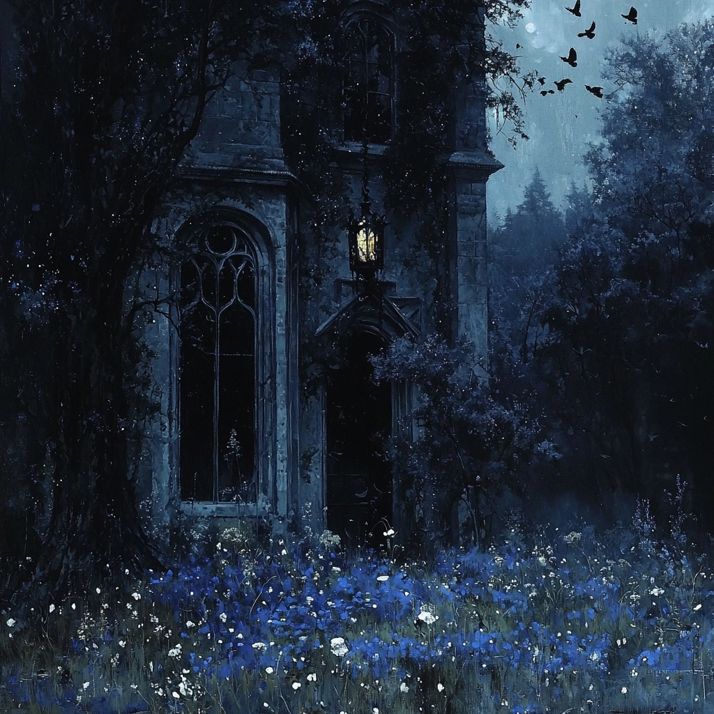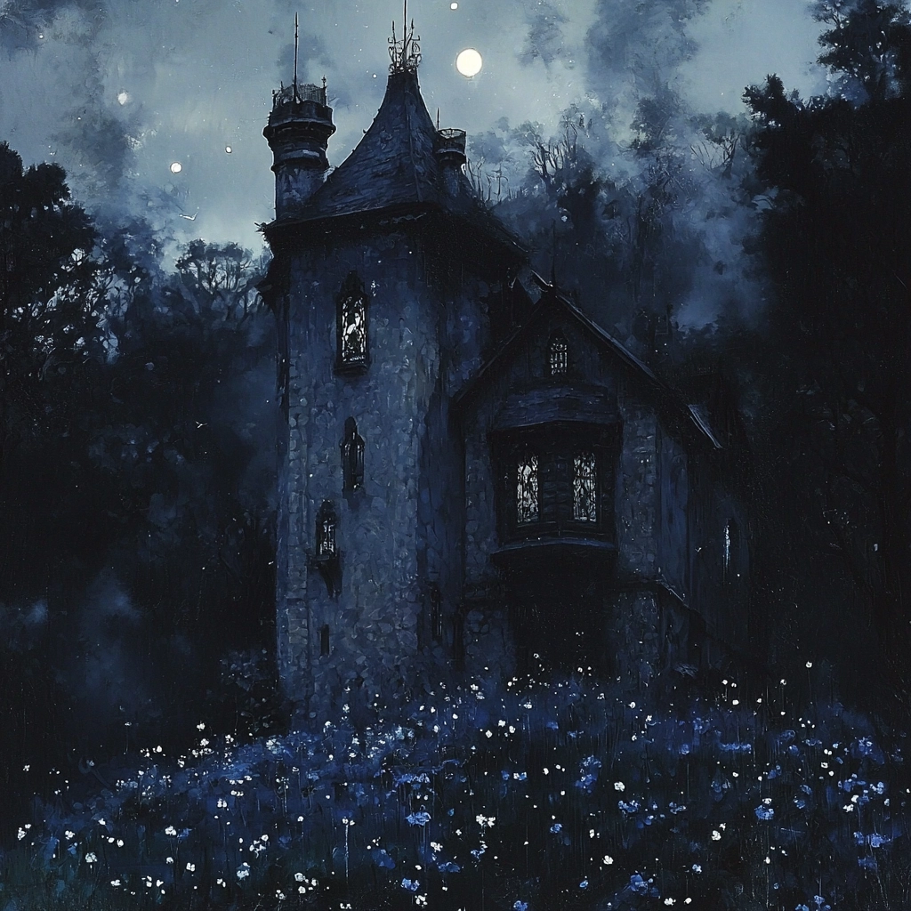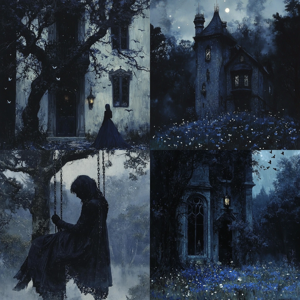 Dim lighting casts deep shadows, enhancing the depth. The color palette stays cool and muted, relying on dark blues and blacks for emphasis. Textures convey a smooth yet rugged appearance, adding interest.