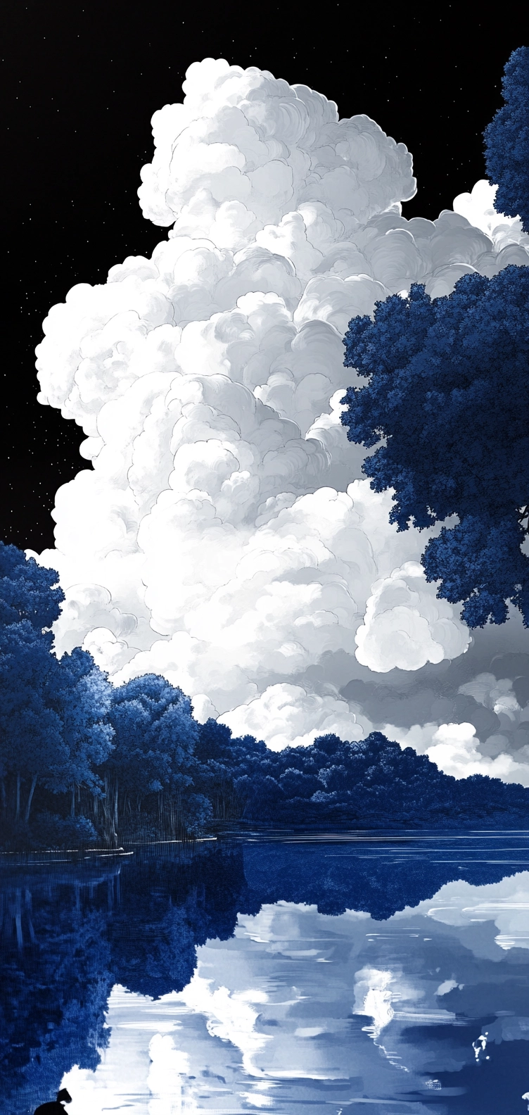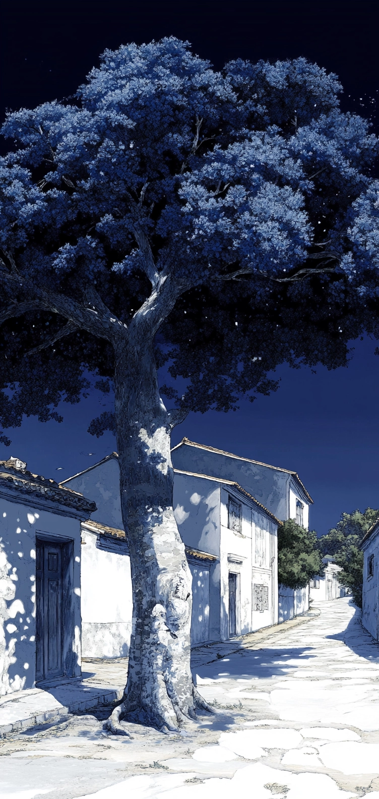 The lighting emphasizes high contrast between dark blue and white, casting deep shadows and bright highlights. The textures are detailed, enhancing the vividness of surfaces and volumes, while the spatial sense is palpable, creating layers of depth and perspective.