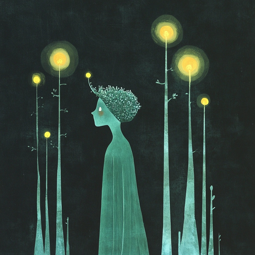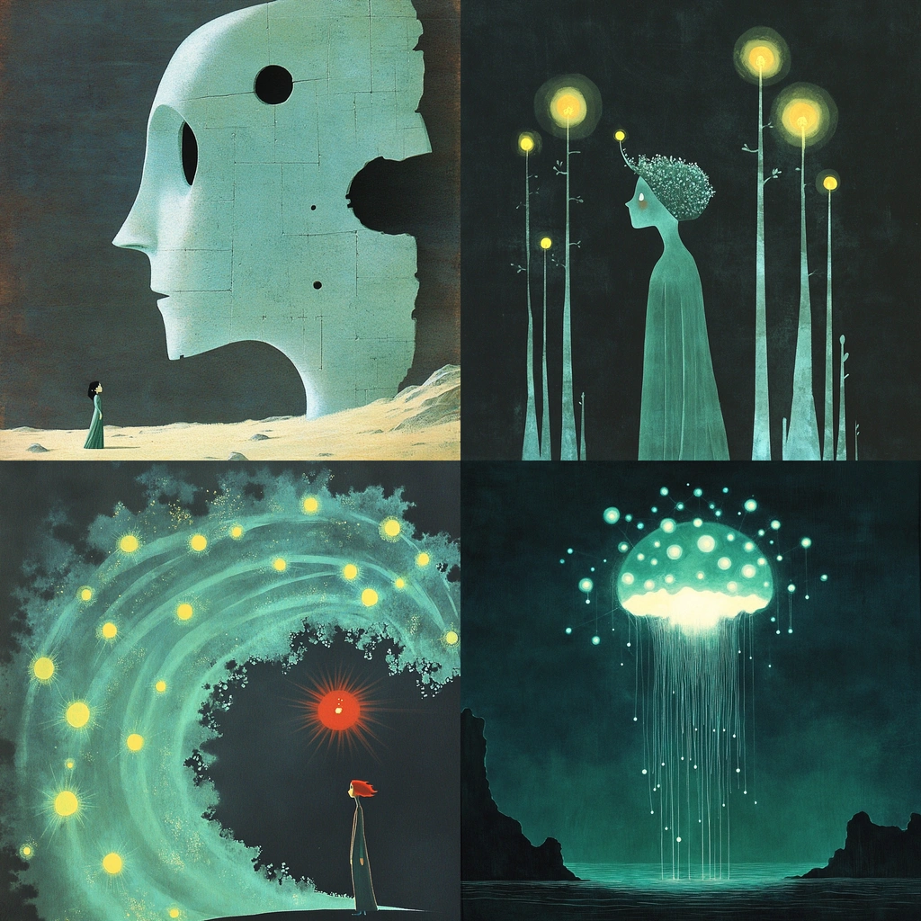 Minimal silhouettes against cyan glow set on dark backgrounds.