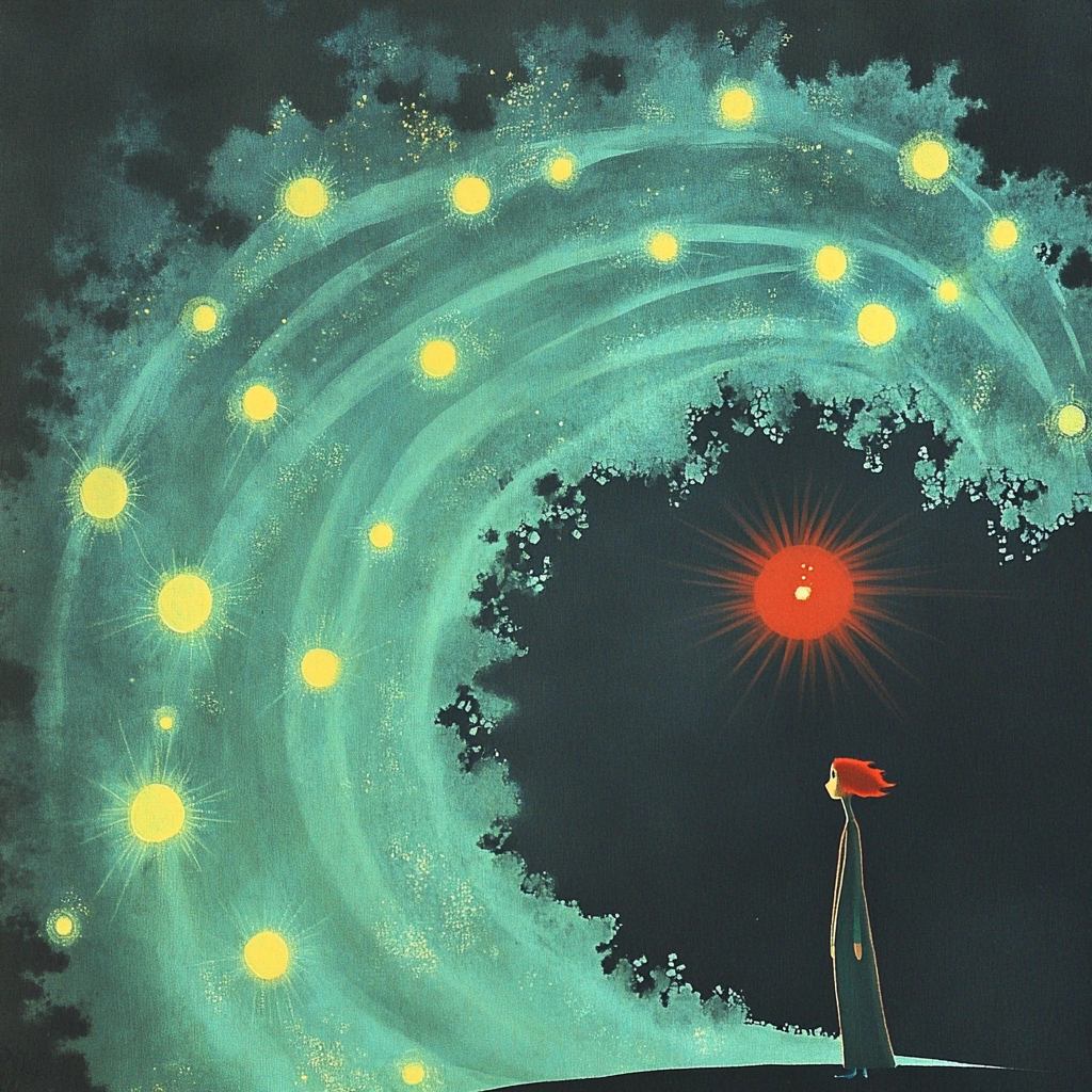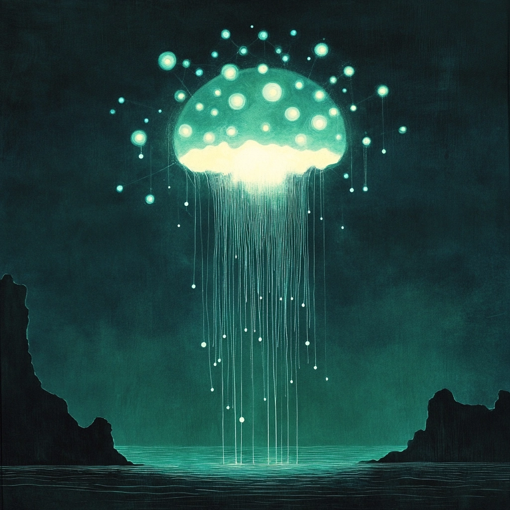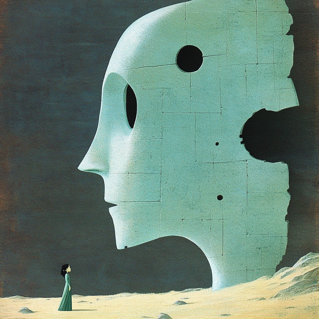 Nuanced lighting highlights the central forms, with filtered cyan hues and deep blacks creating a sparse spatial depth. The smooth textures offer understated elegance amidst pointed contrasts.