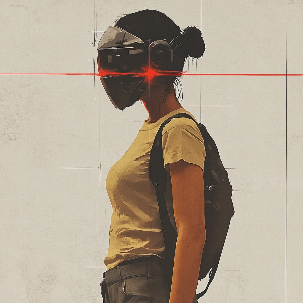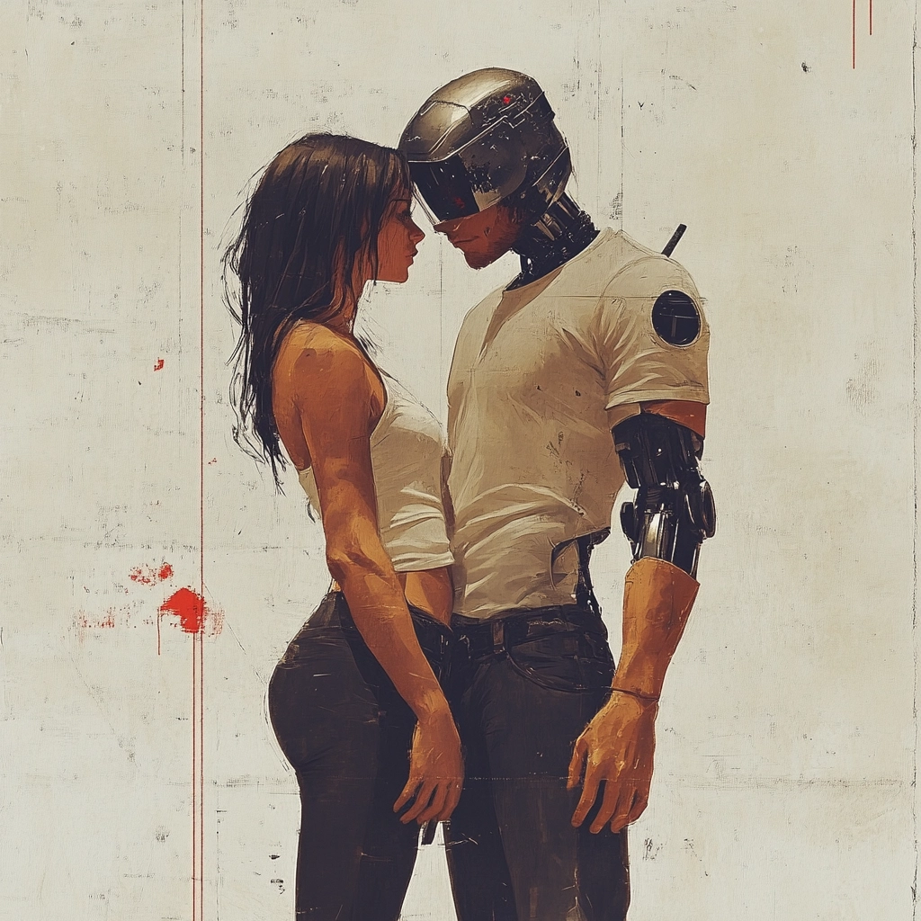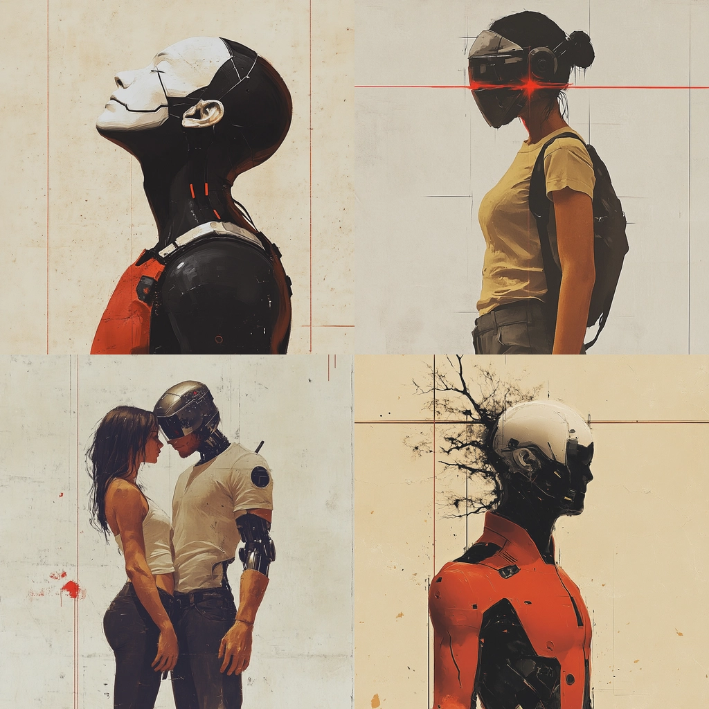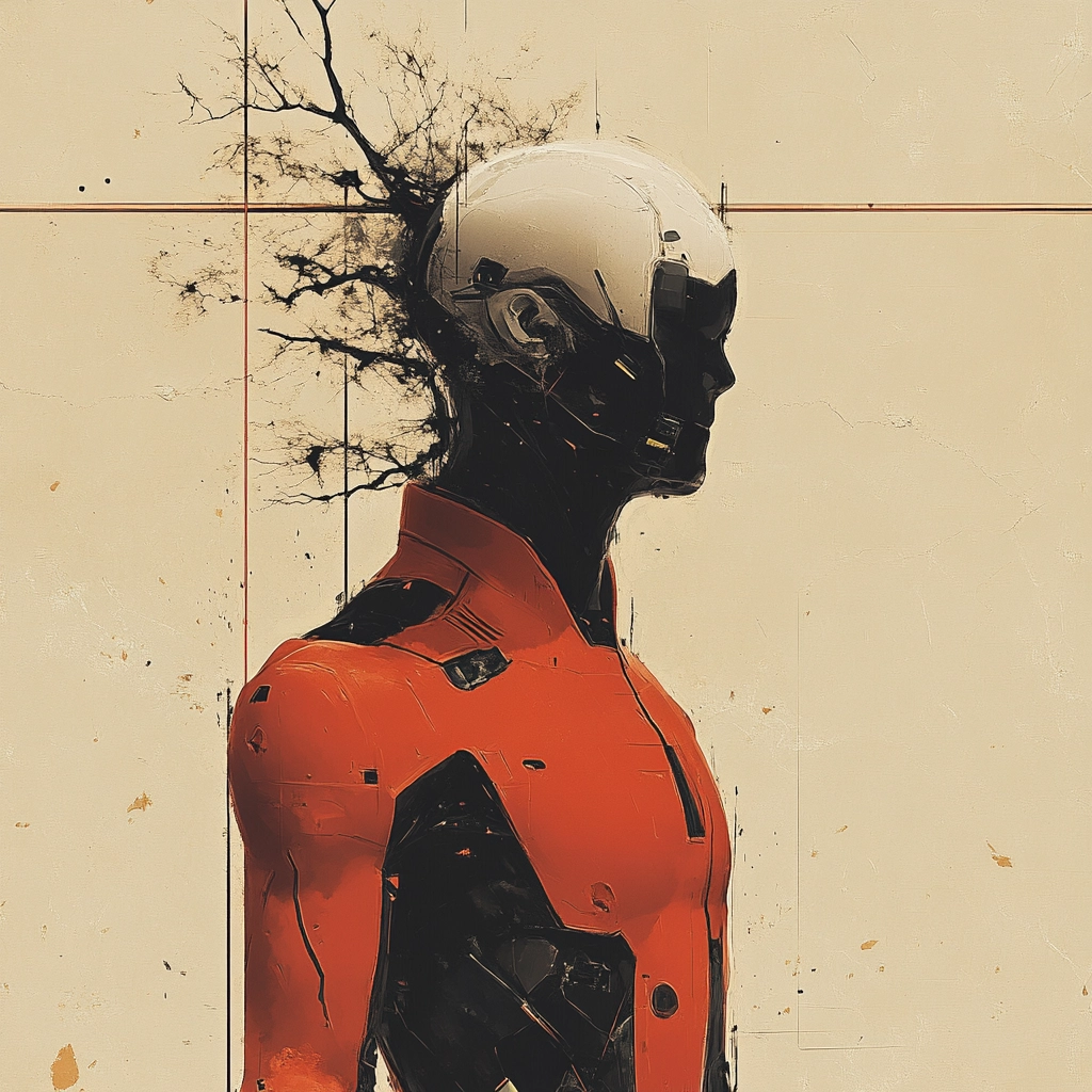 Dominated by stark contrasts and geometric forms, the colors emphasize a robotic aesthetic featuring black, red, and beige.