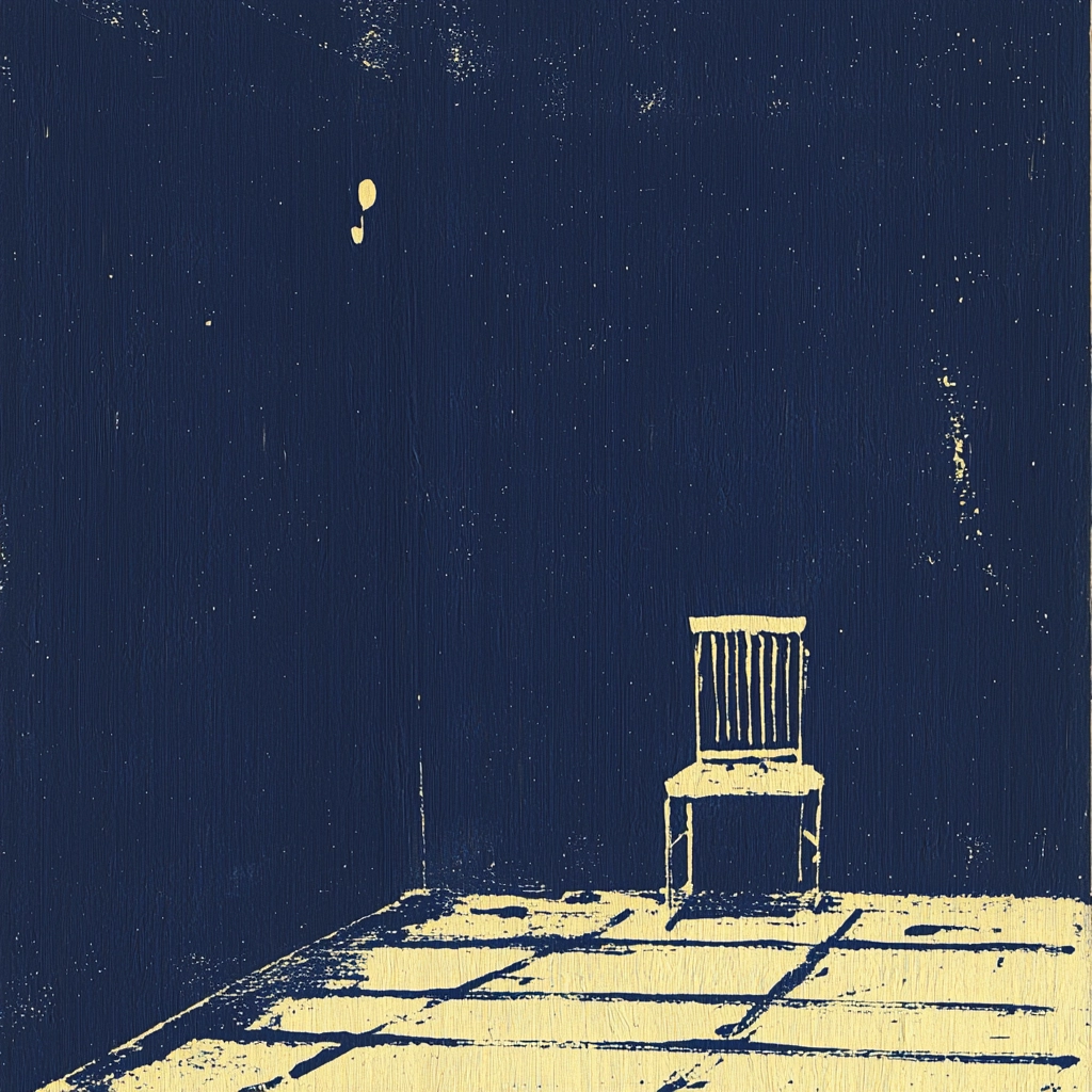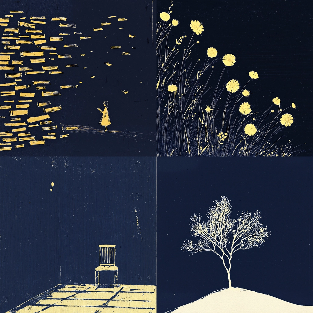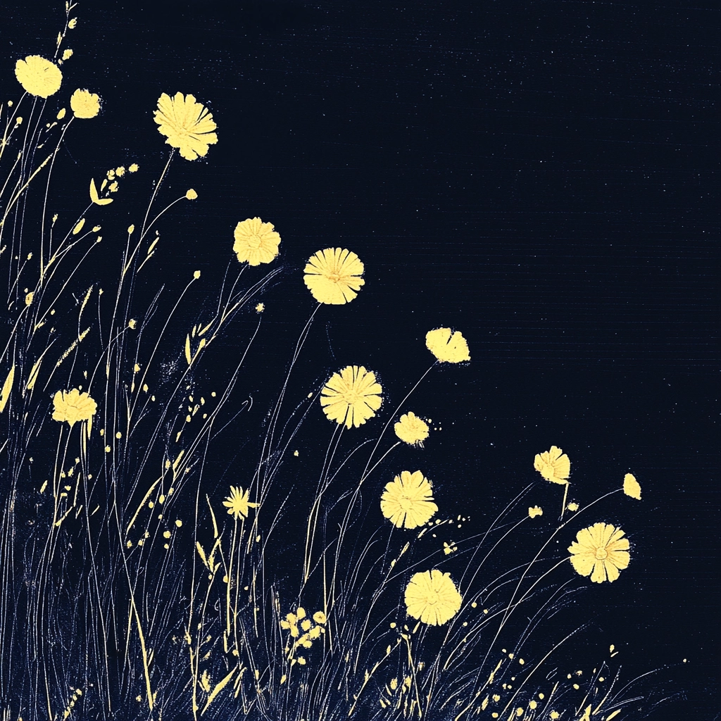 The use of gold creates a striking contrast against the black background, utilizing minimalist textures to emphasize simple forms. Light appears to cascade, accentuating spatial depth with deliberate and pronounced brushstrokes.