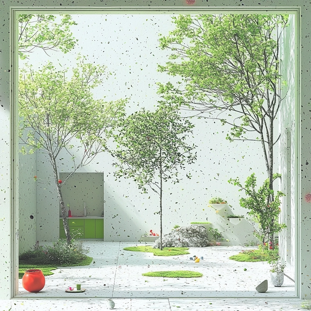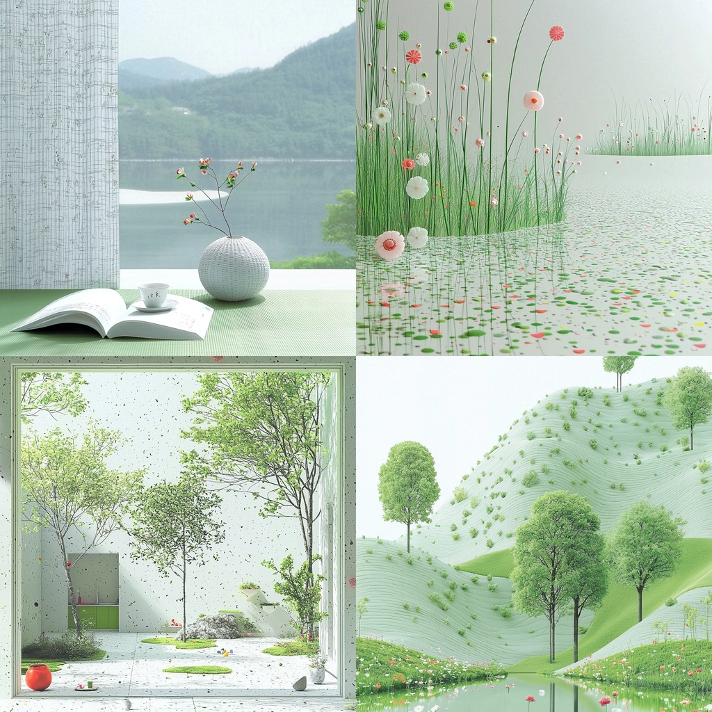Subdued lighting enhances the cool color palette, emphasizing spatial openness. The textures are smooth and subtle, reflecting a sense of precision and clarity. The restrained use of color amplifies spatial perception and cultivates an essence of gentle sophistication.