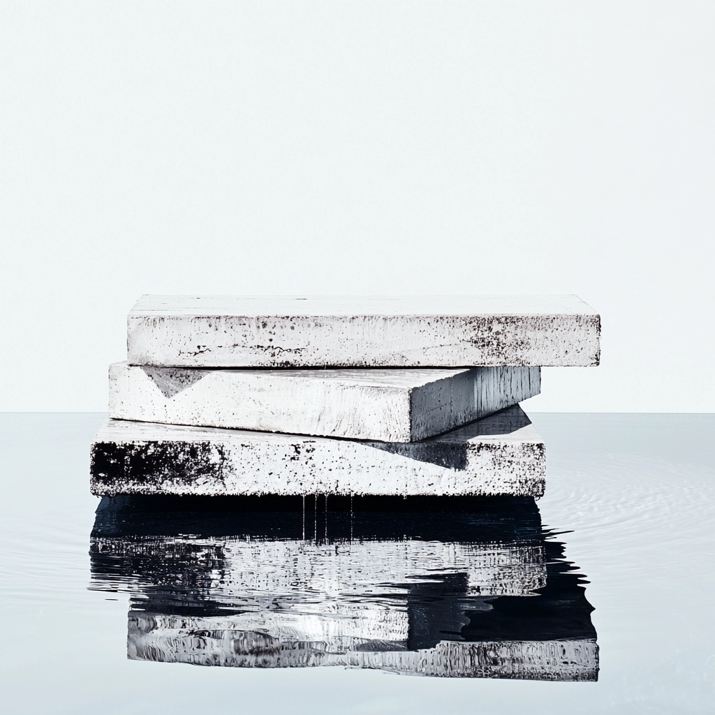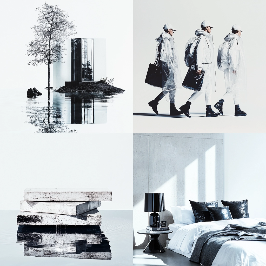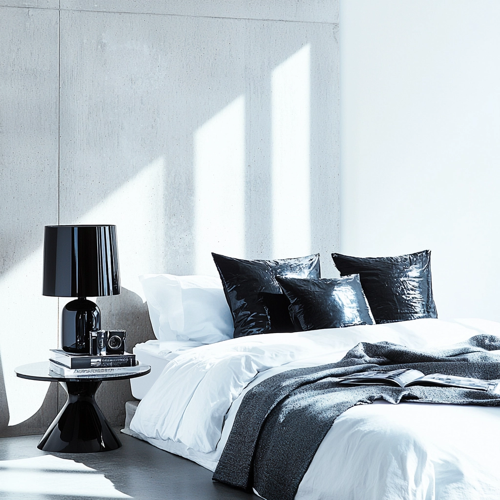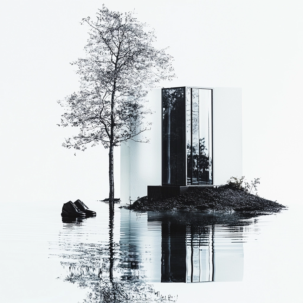 Lighting creates bold contrasts with distinct reflections enhancing depth. The use of monochrome colors conveys a clean, precise aesthetic. Textures in the grayscale highlight refined details and simplicity, giving a modern and polished finish.