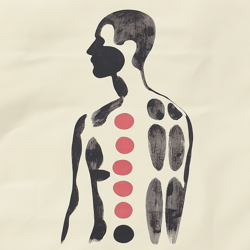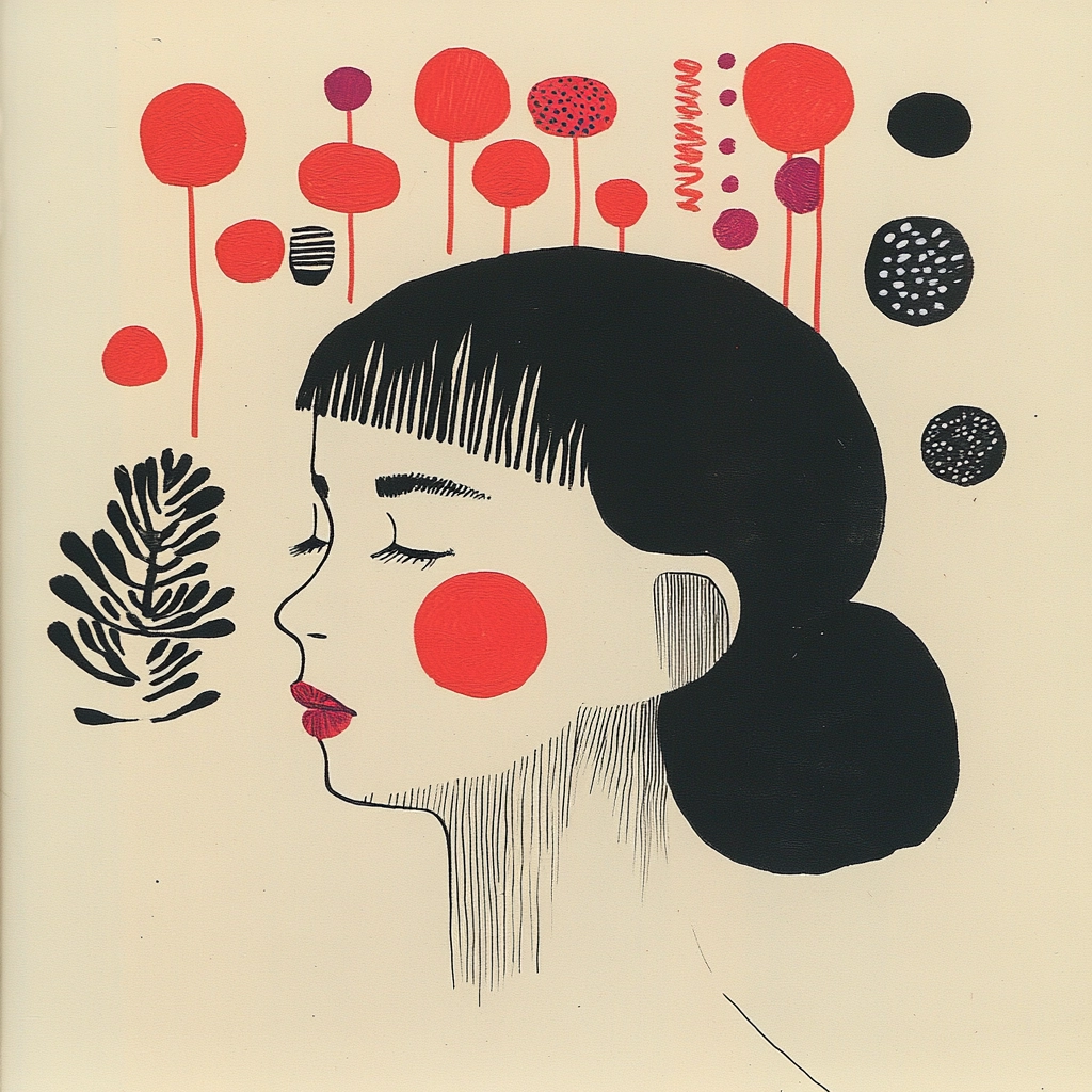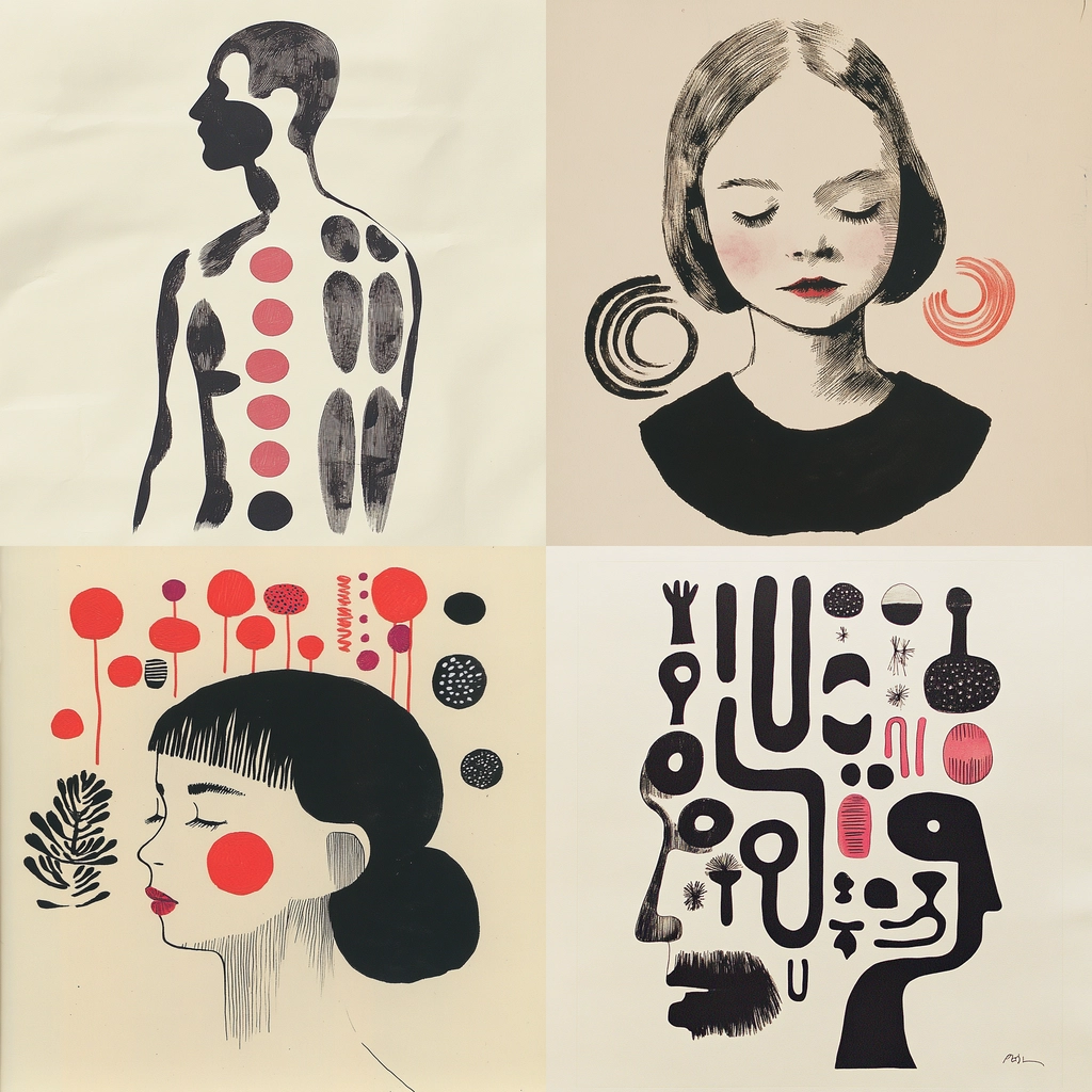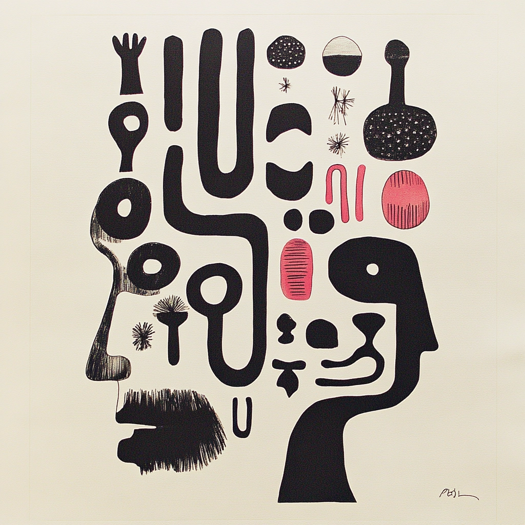 The use of deep black ink provides bold outlines and fills, with red punctuating the composition in circular and linear forms. Beige backgrounds offer subtle warmth. The space is equally distributed, creating a balanced and engaging visual environment.