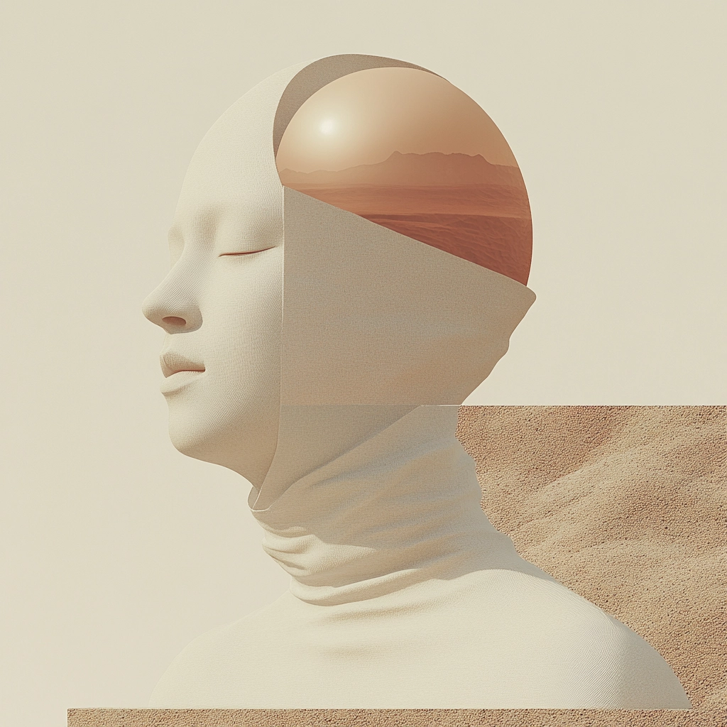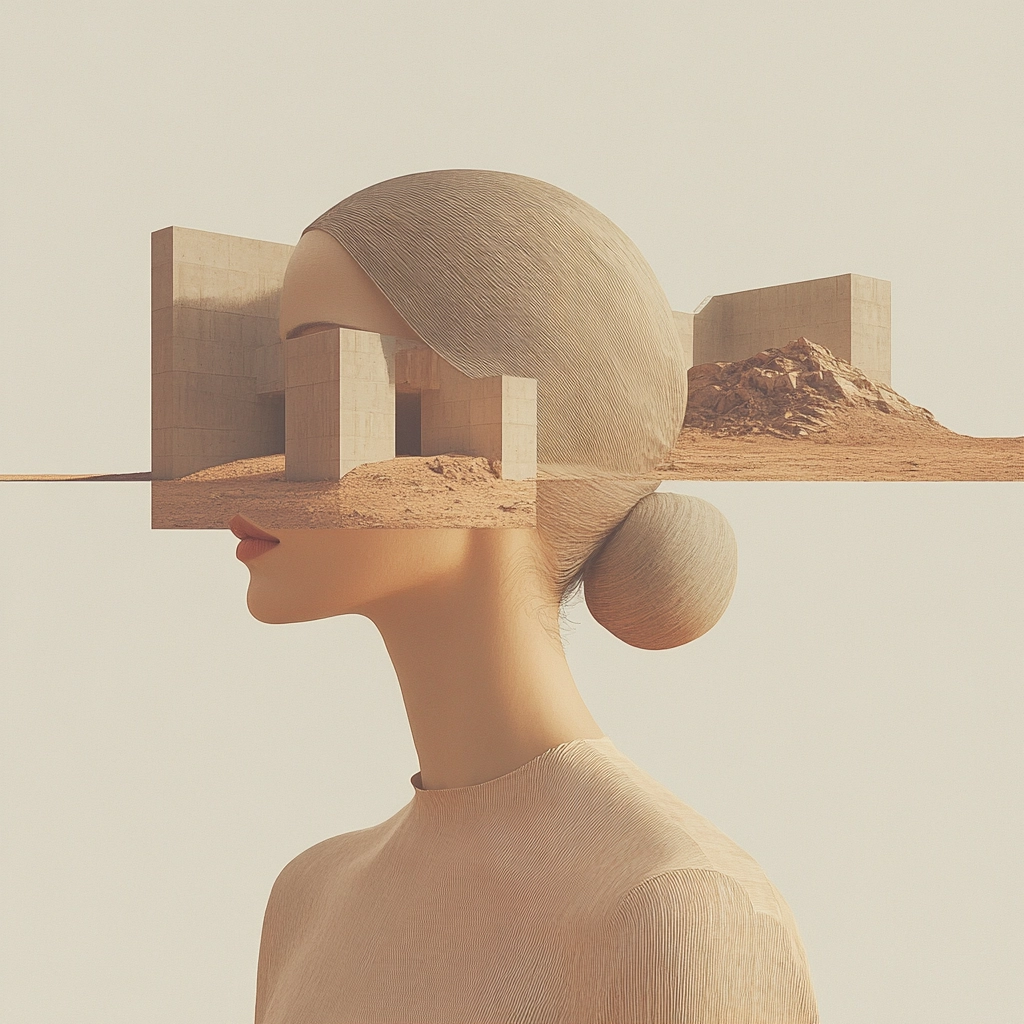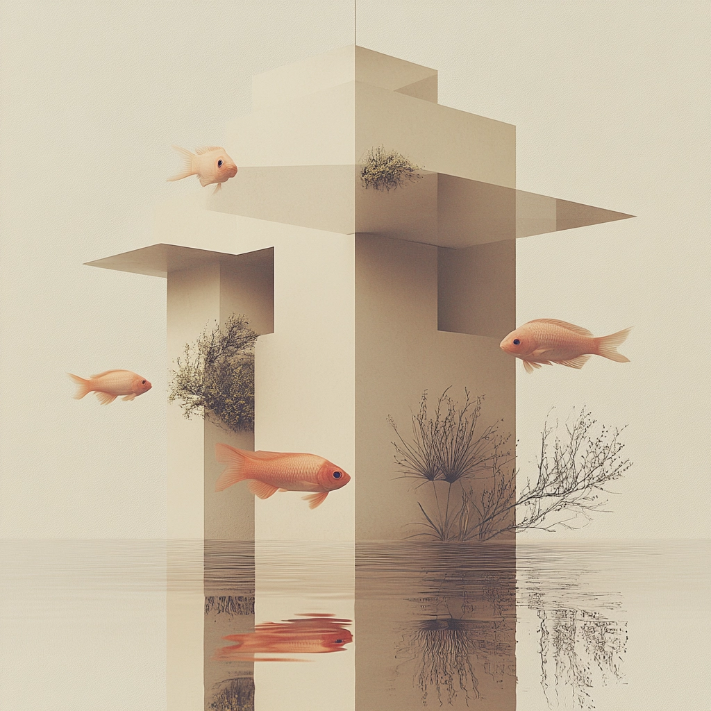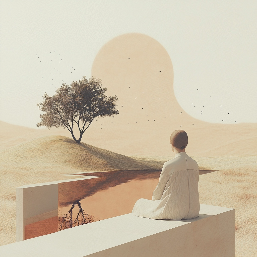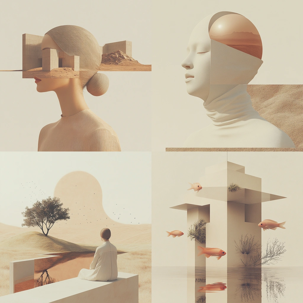 Serene landscapes with surreal elements in muted tones.