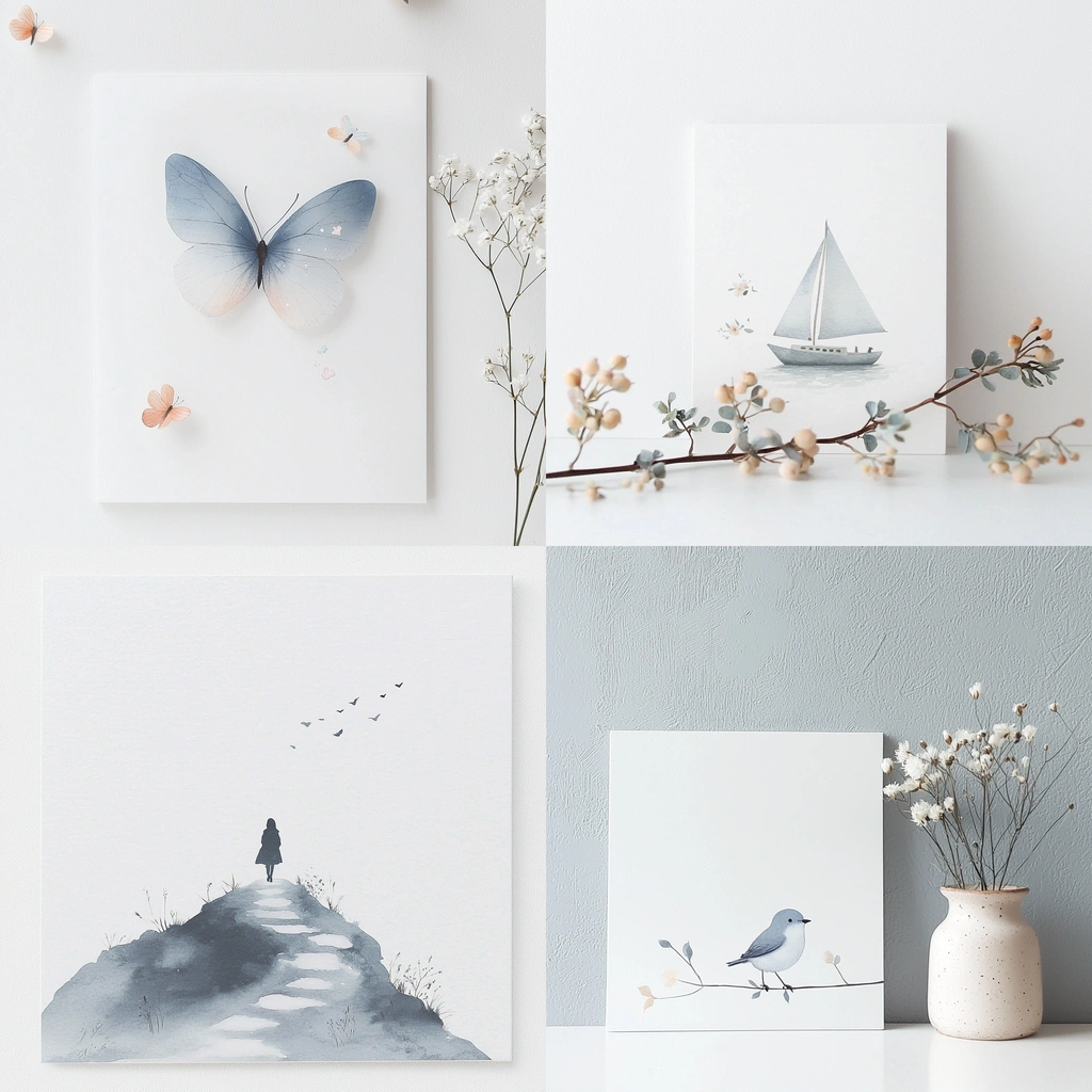 Light and delicate use of subdued colors form soft, fluid transitions against stark white backgrounds, enhancing the visuals' airy quality. Subtle gradients and gentle overlays create a sense of calm spatial depth.