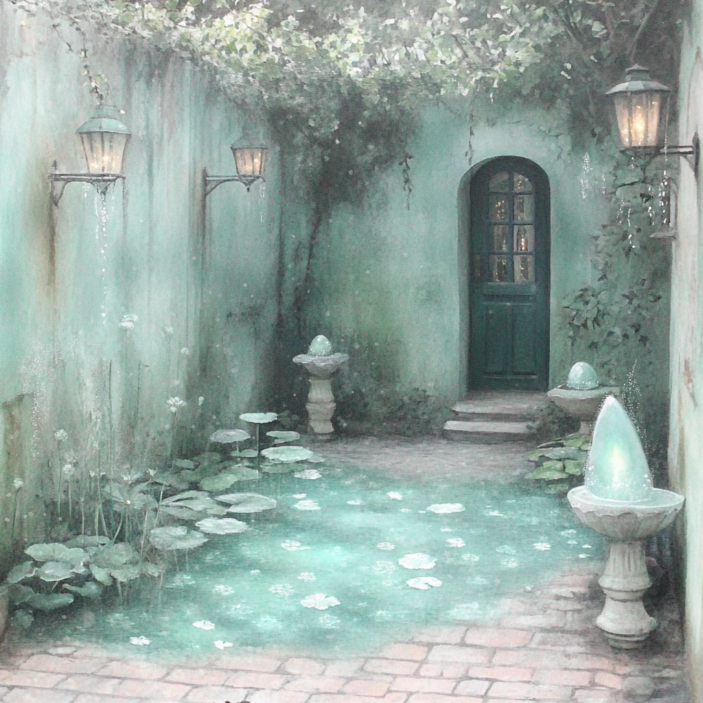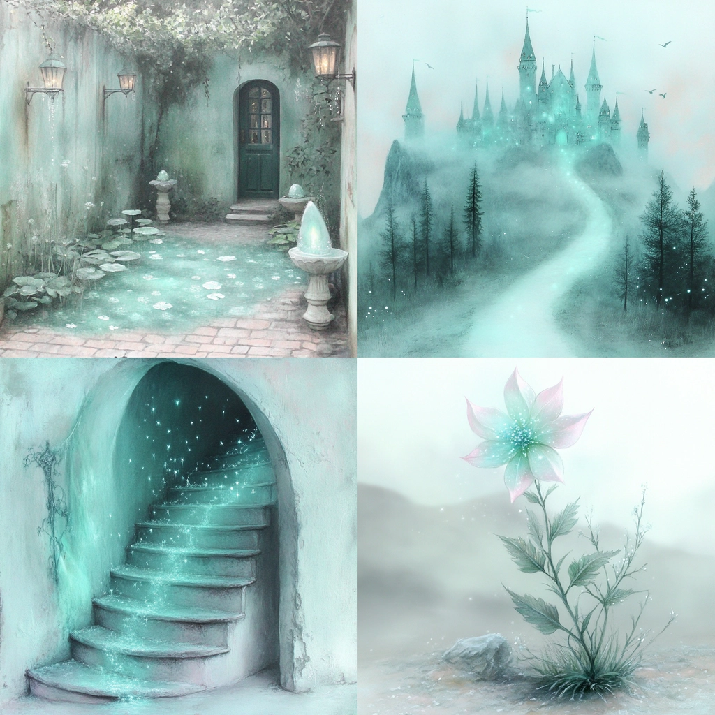 Gentle lighting softly illuminates structures and nature, providing depth through delicate layers. Mint green tones are dominant, adding subtle vibrancy. Textured surfaces suggest a dreamlike quality with gradient transitions and ethereal glow effects.