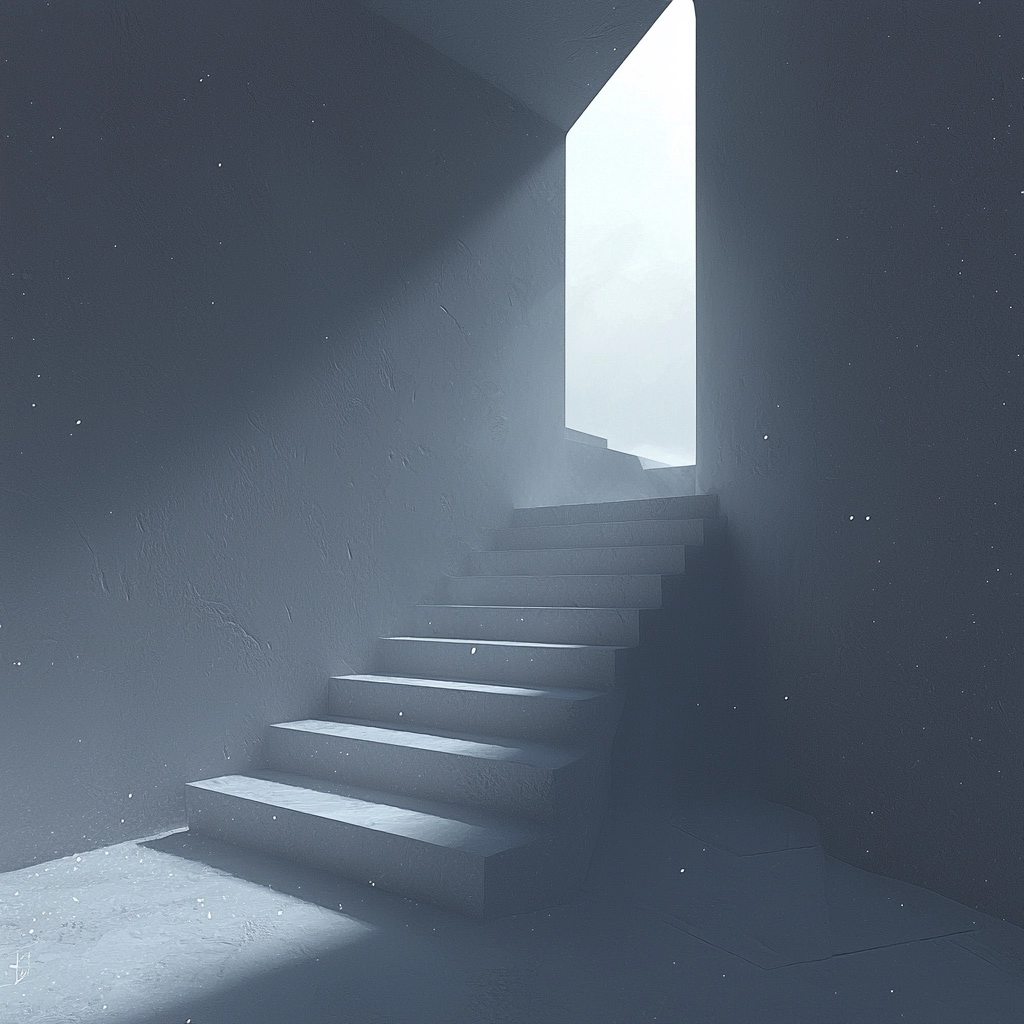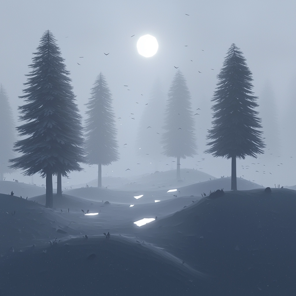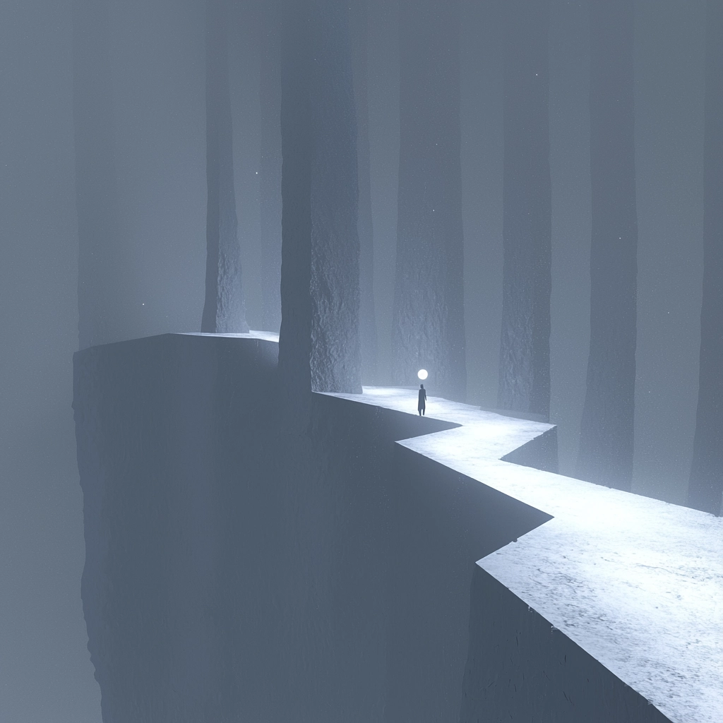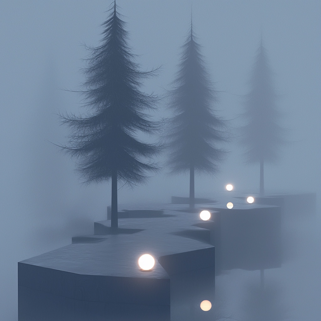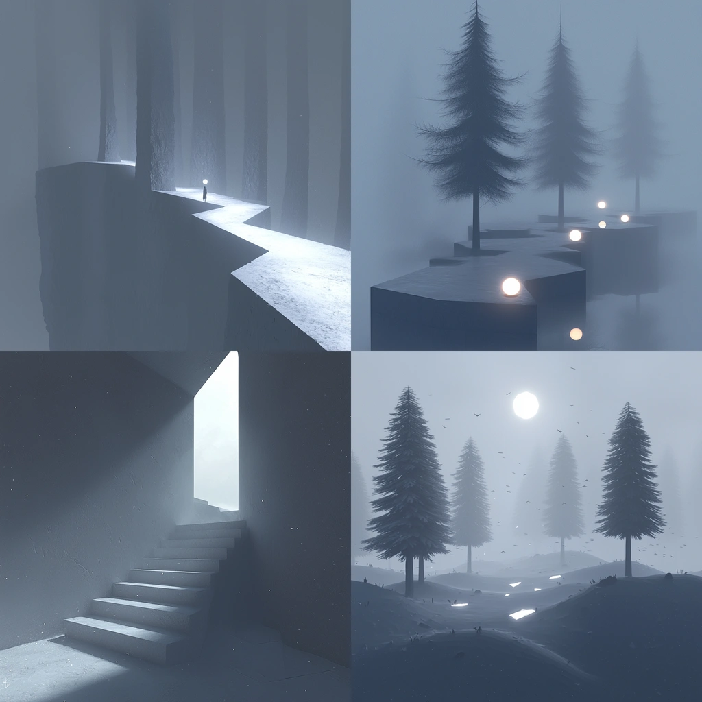 Subdued lighting creates muted shadows, enhancing spatial perception. The cool tones dominate the composition, with soft textures serving as gentle transitions between elements. Atmospheric depth relies on the interplay of light and shade.