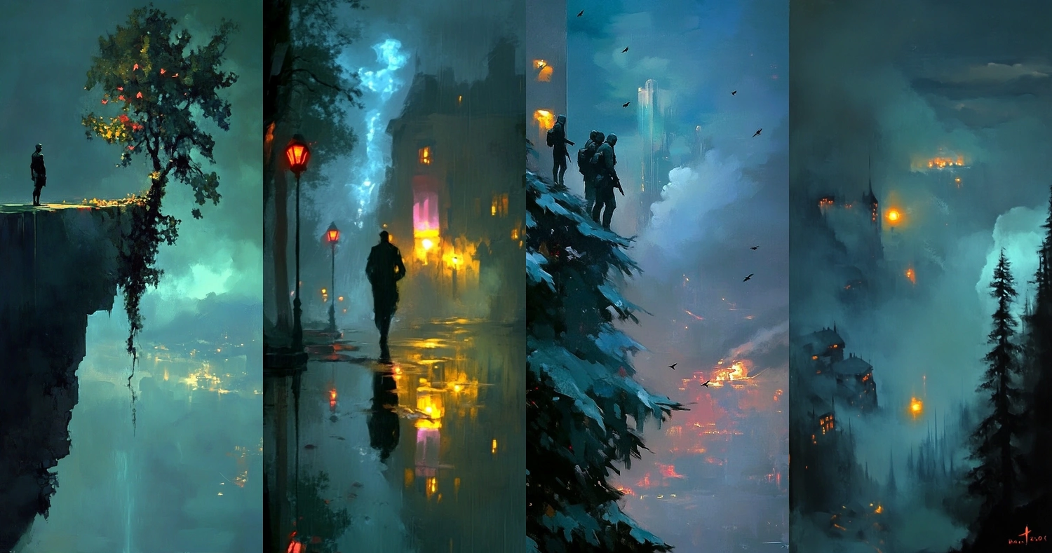 Subtle, diffused lighting contrasts sharp points of illumination, creating a dynamic spatial awareness. Colors blend seamlessly with textured overlays that highlight light versus dark elements.
