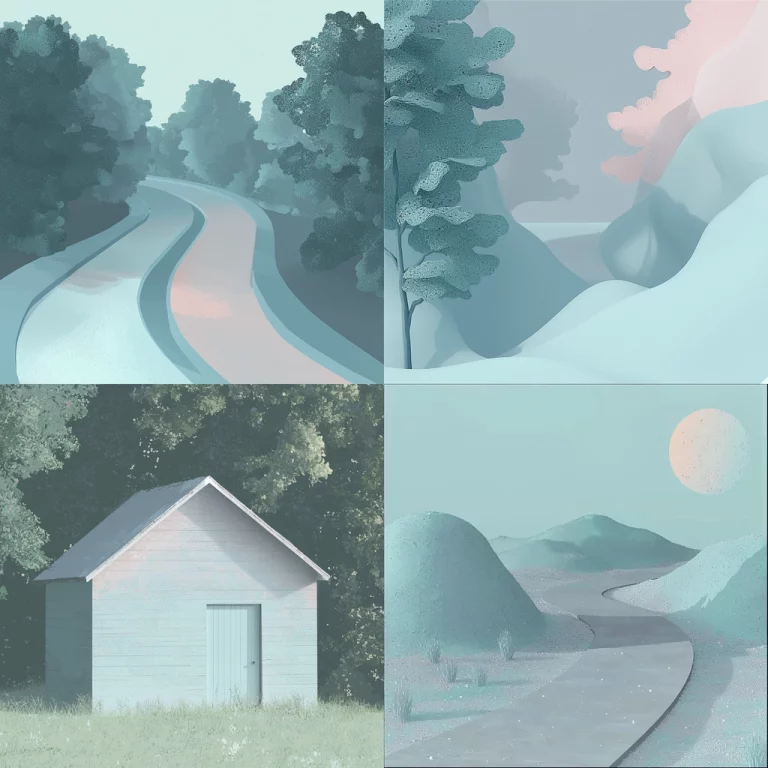 The lighting is natural and diffused, creating soft silhouettes and enhancing the textures of both natural and man-made materials. Gray tones dominate the palette, complemented by strategic use of green and brown for a subdued, earthy quality. Spatial depth is achieved through the meticulous detailing of foreground and background elements.