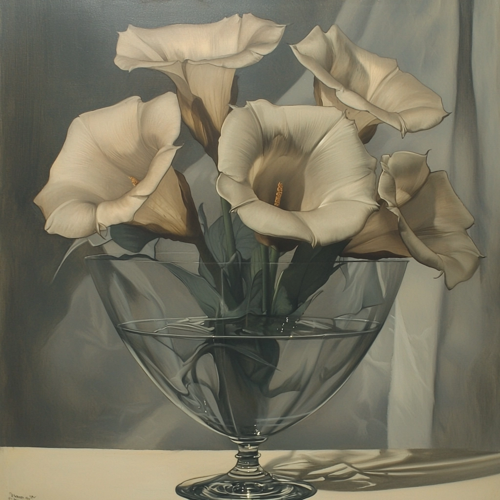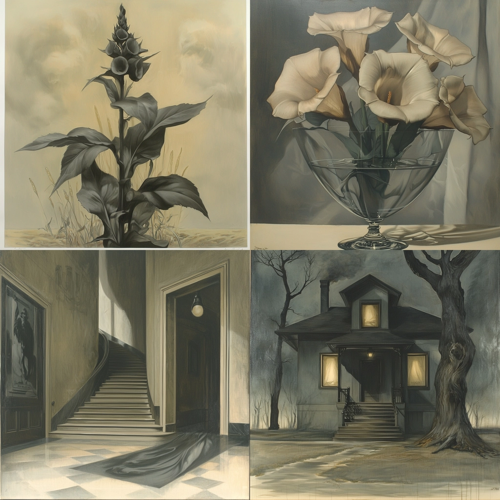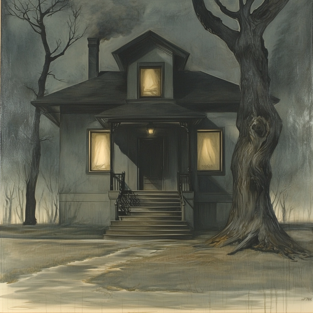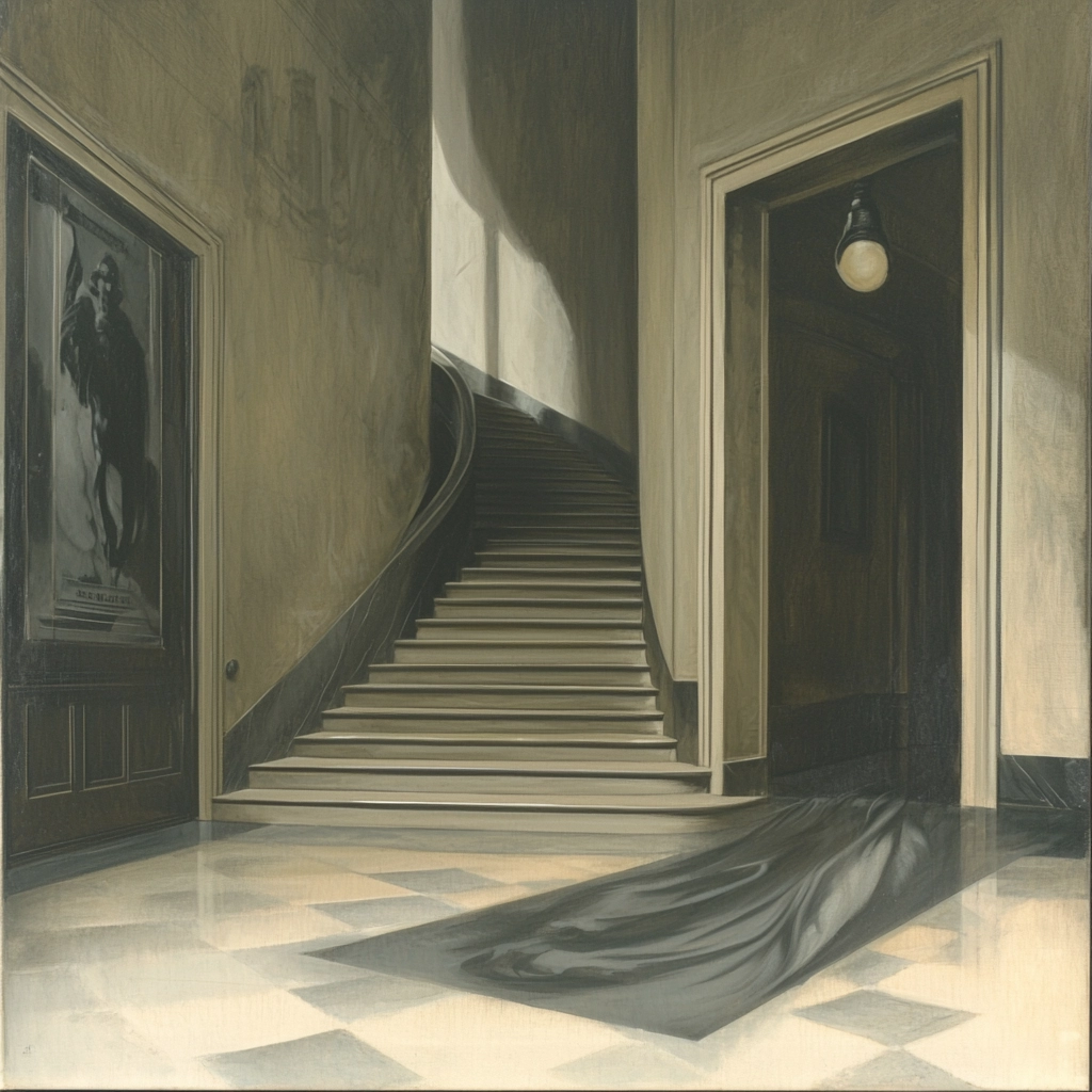 The lighting emphasizes contrast, casting defined shadows that accentuate the figures within the scene. Colors are muted, with gray and beige tones enhancing the realistic textures and spatial clarity. The depth is achieved through careful shading and perspective, drawing attention to both foreground and background elements.