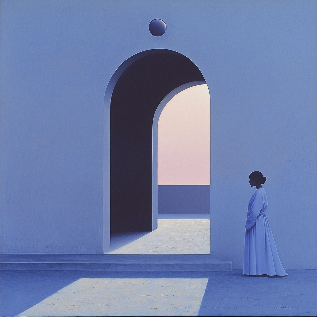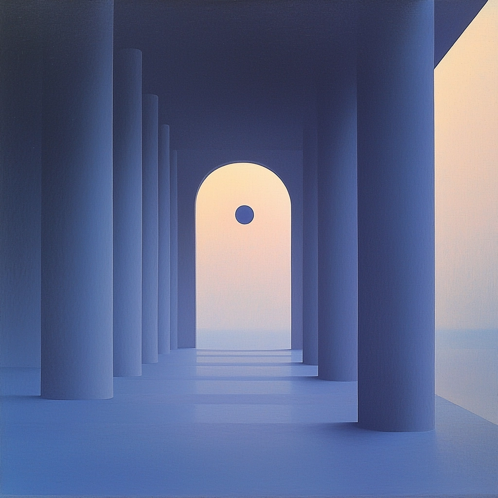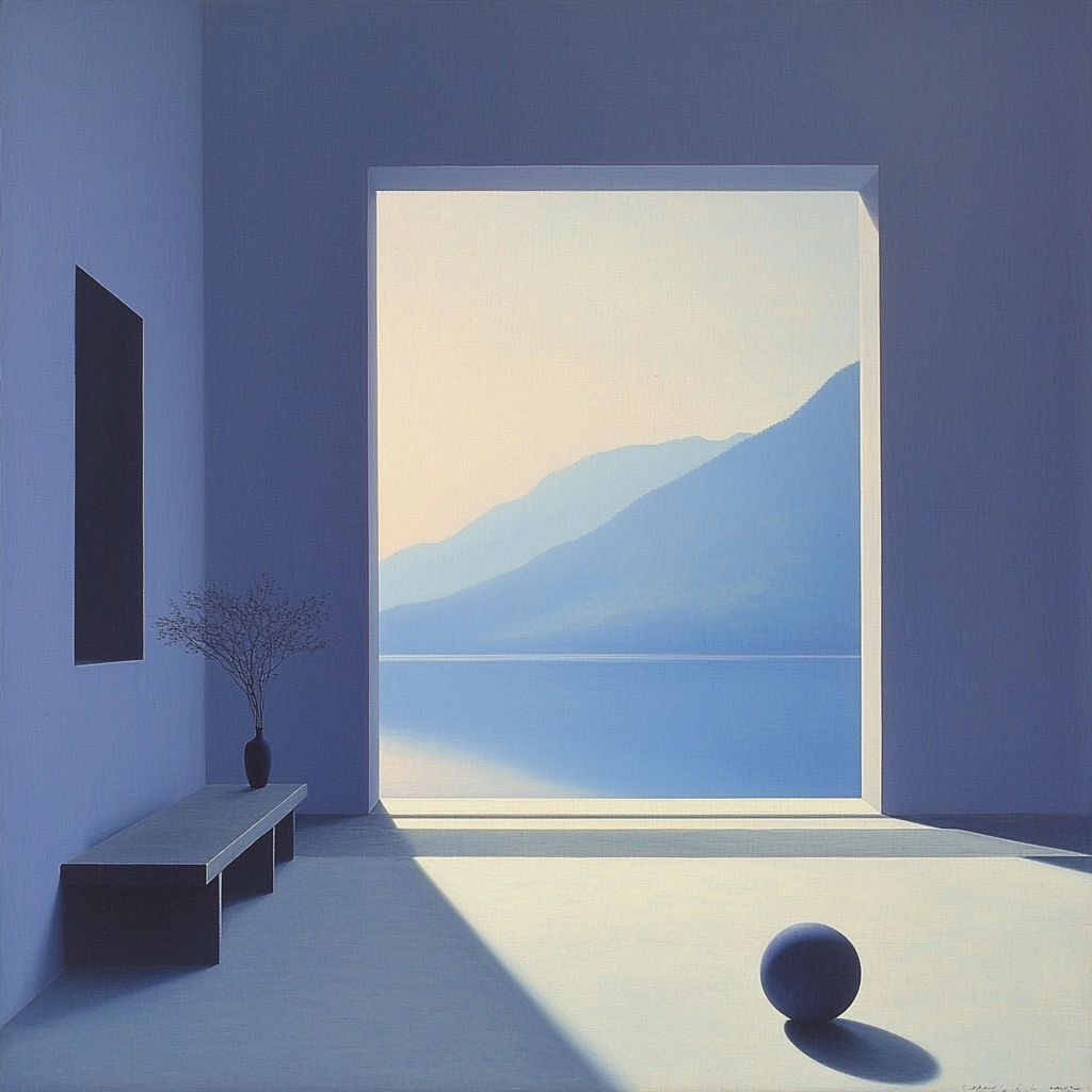 Emphasizes a serene interplay between geometry and light using cool blue tones with subtle beige accents.