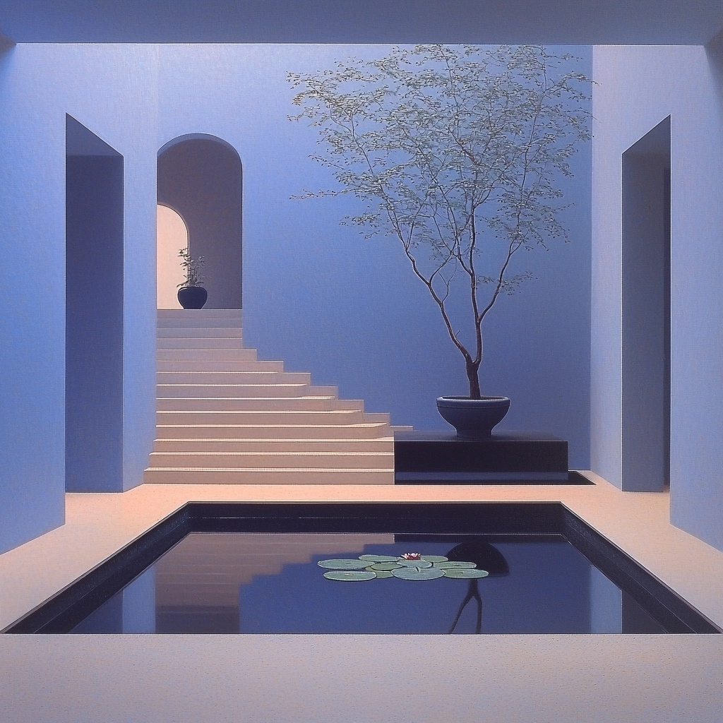 The lighting highlights architectural forms, creating a sense of depth and tranquility. Blue dominates, offering a calming backdrop where light interacts with space, casting soft shadows and reflections. The texture is smooth, enhancing clean, defined structures.