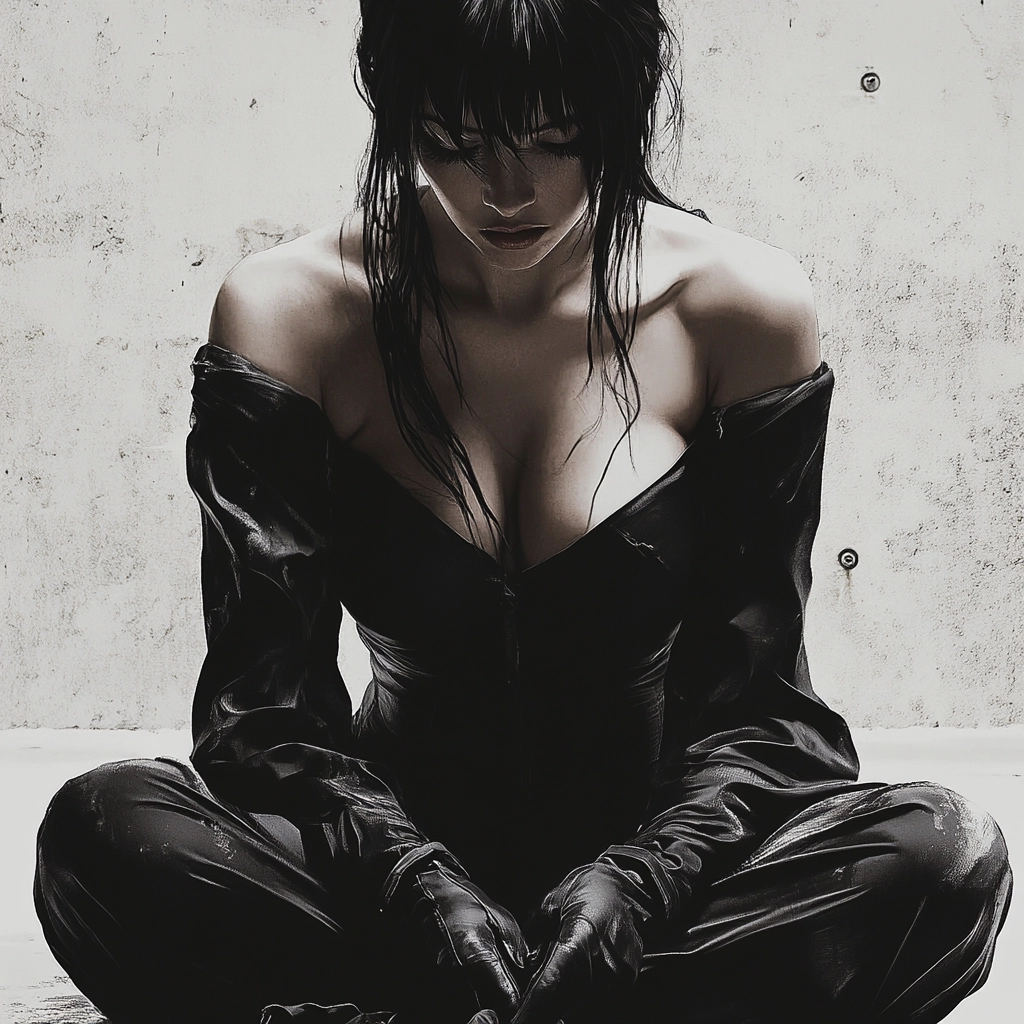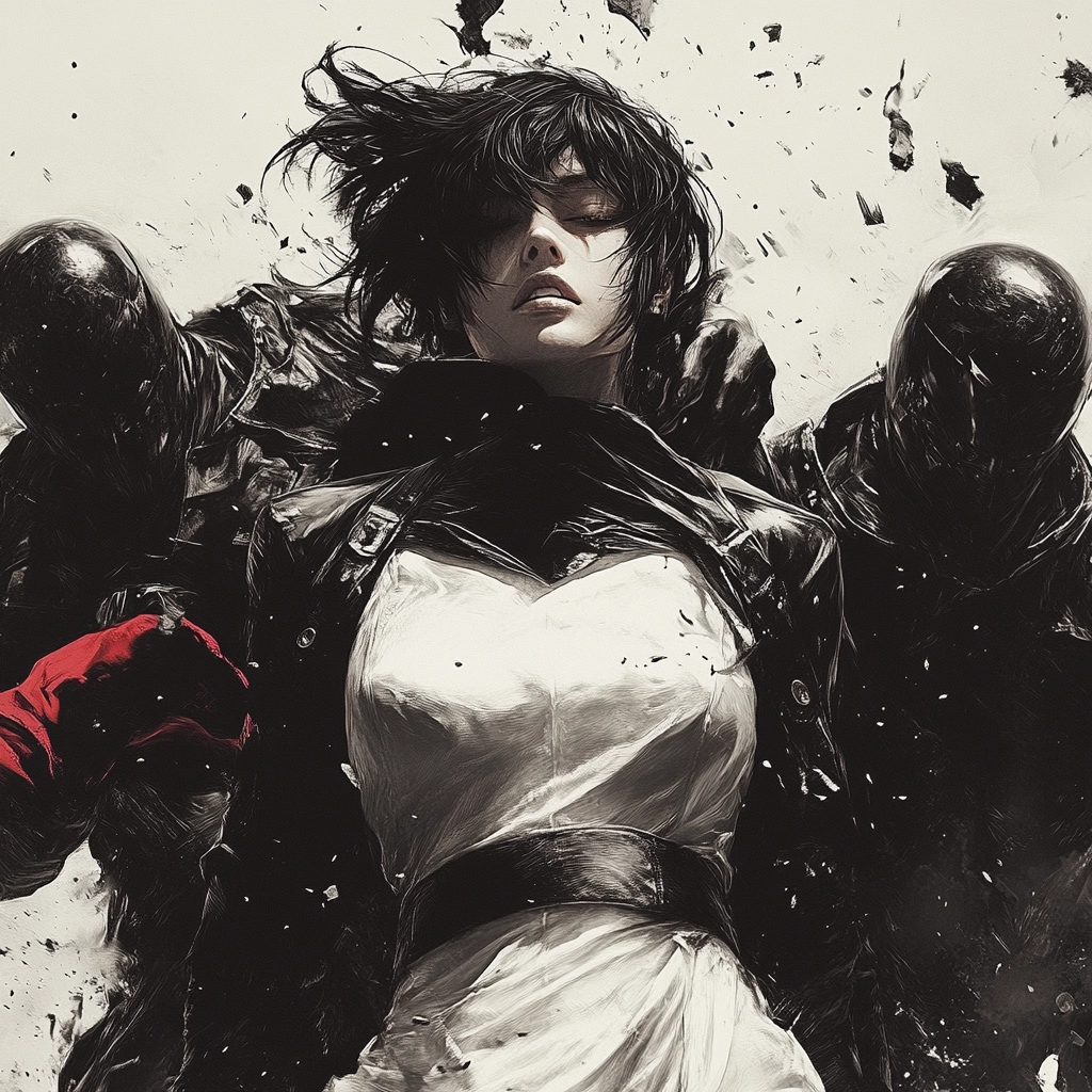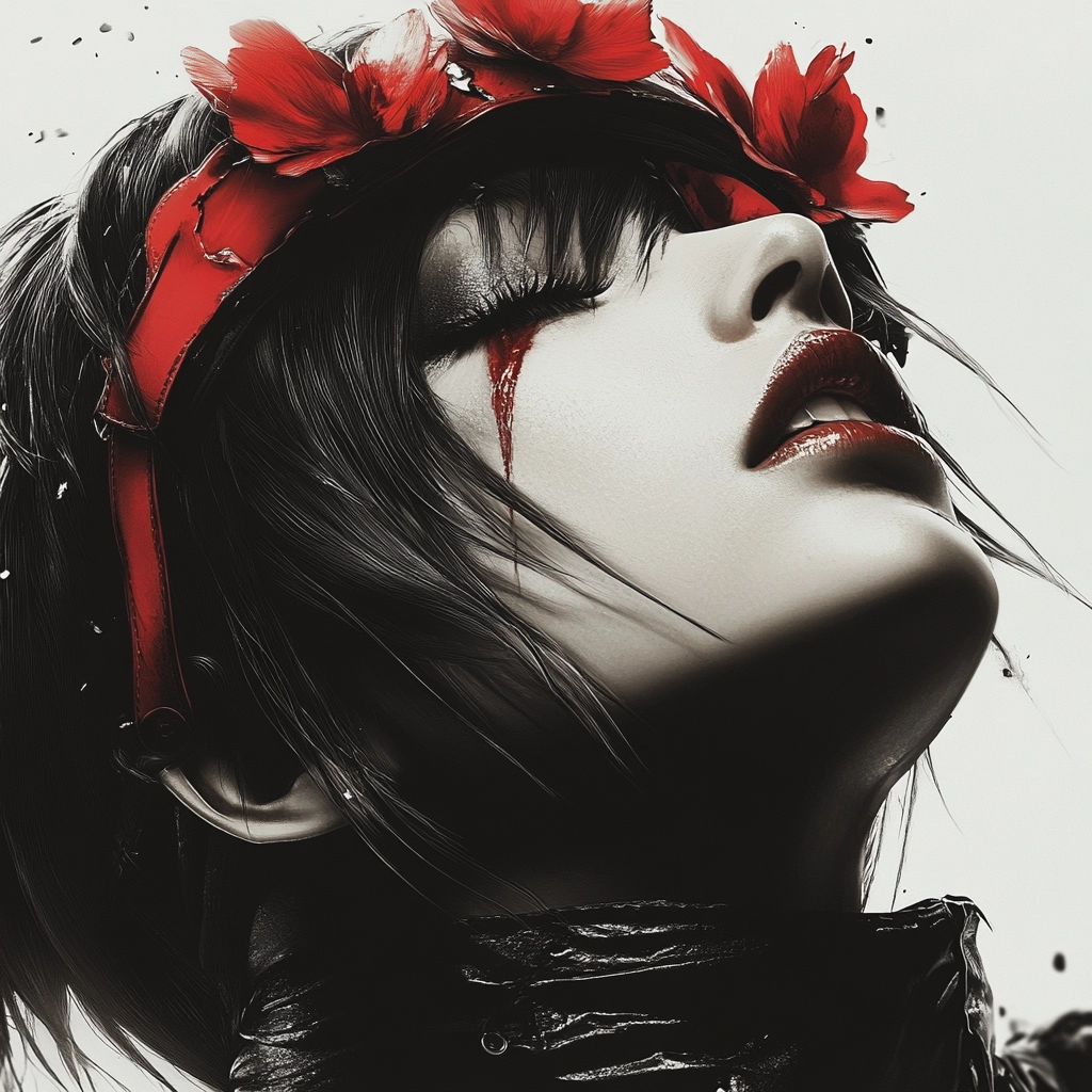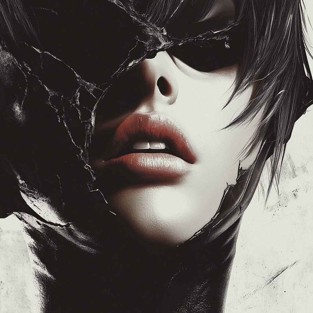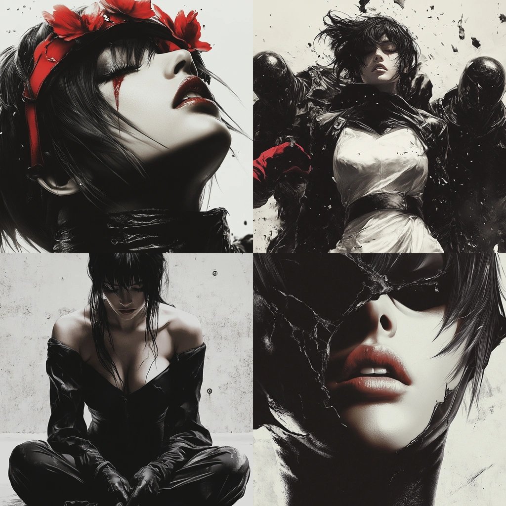 Defined use of stark lighting, creating sharp contrasts between black and white while maintaining a striking presence of red accents; texture is smooth, enhancing the overall sleekness and dynamic spatial clarity.