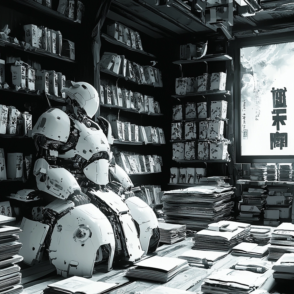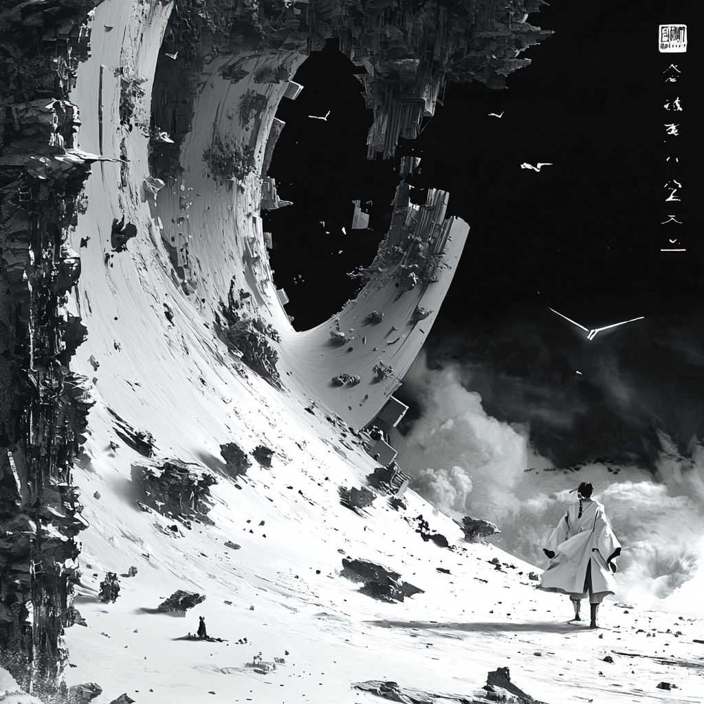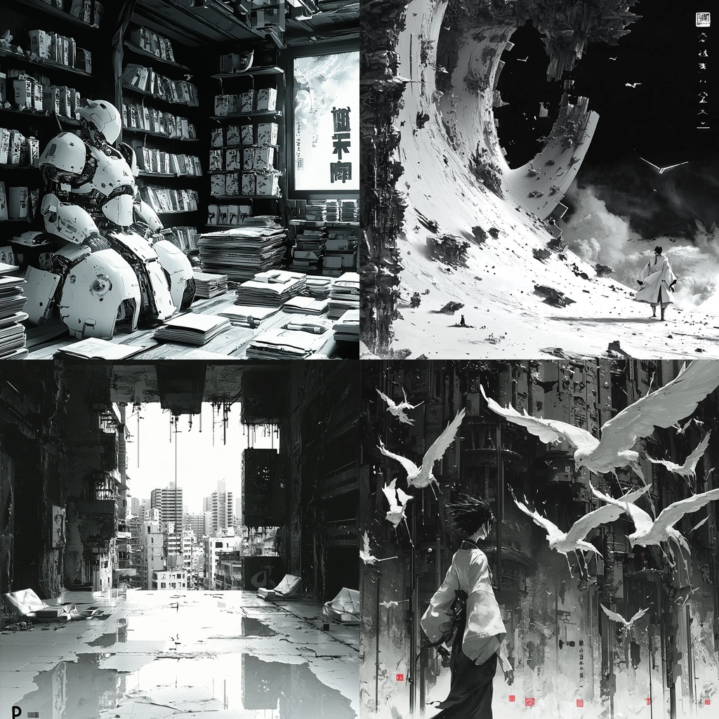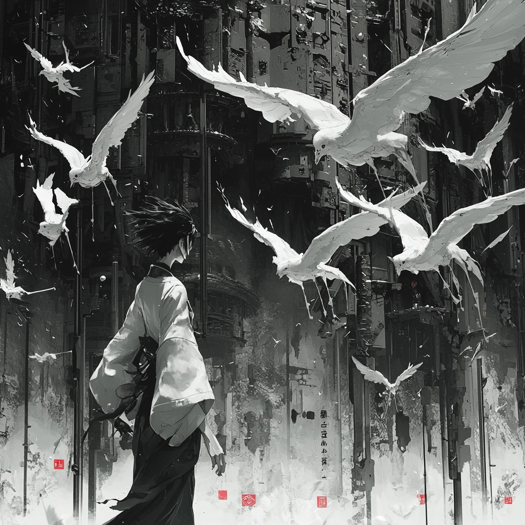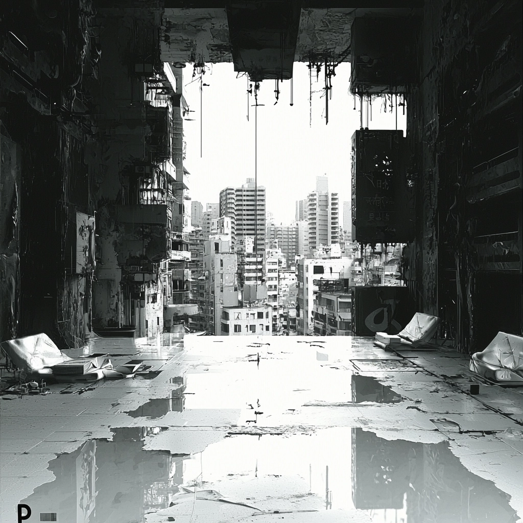 Dynamic play of black, white, and gray tones evokes a sharp urban fusion narrative.