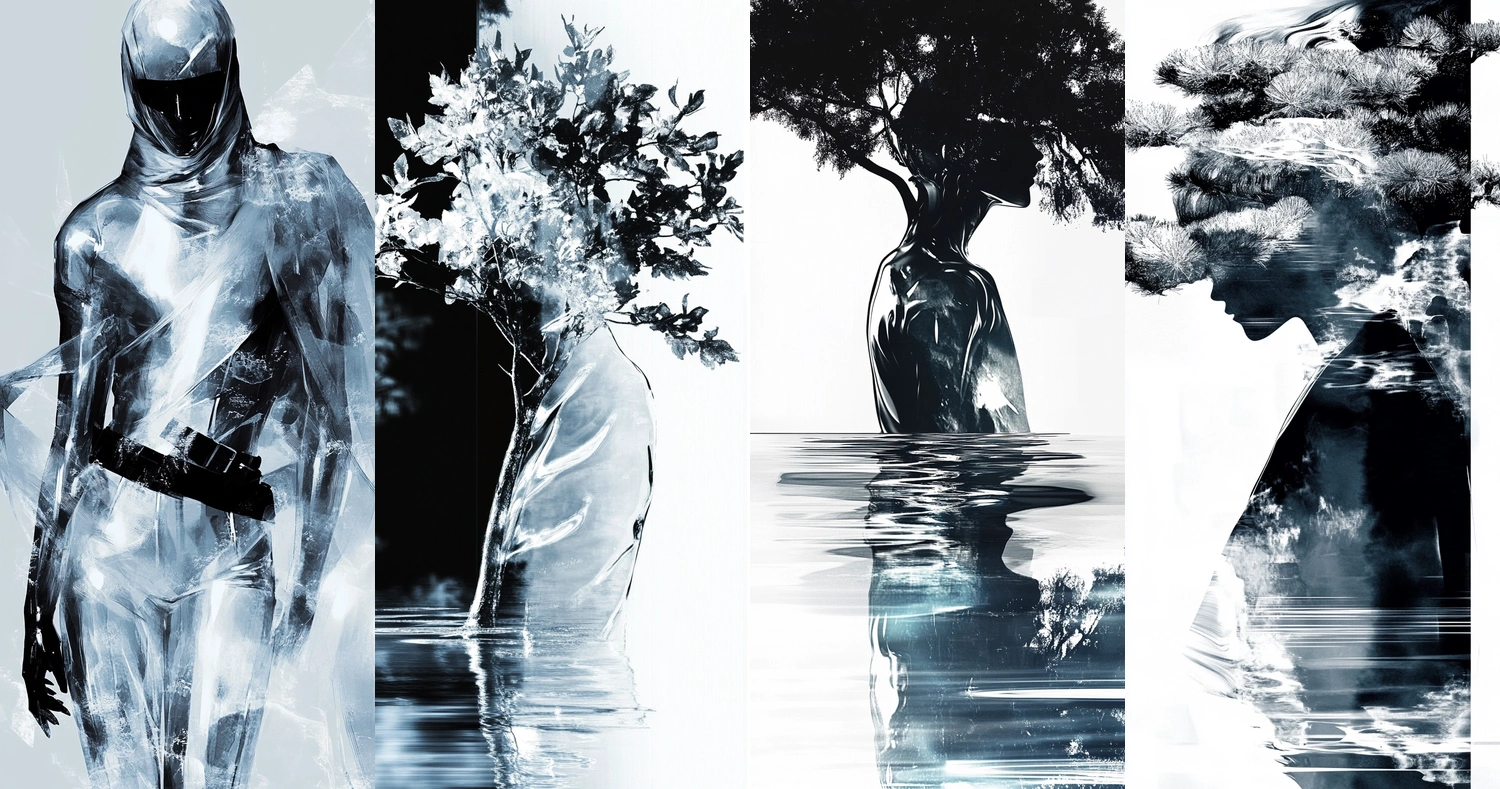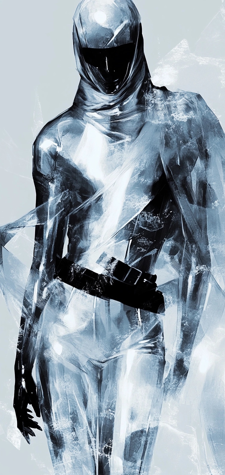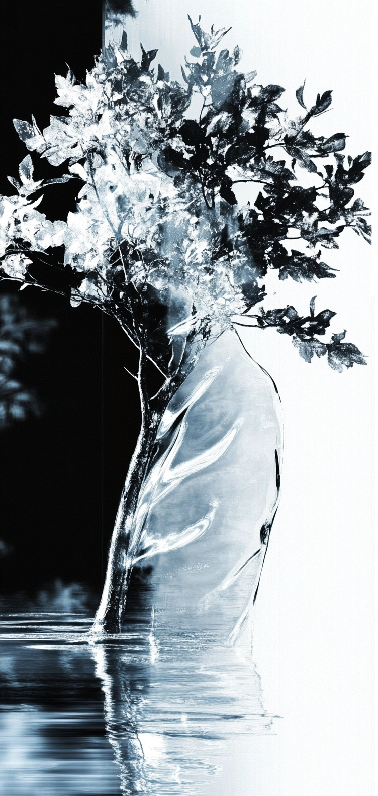 The artwork features striking lighting effects that accentuate the contours and shapes, with a monochromatic palette creating stark contrast. Reflections and transparency contribute to a dynamic spatial sense, while the smooth textures enhance the overall visual impact.