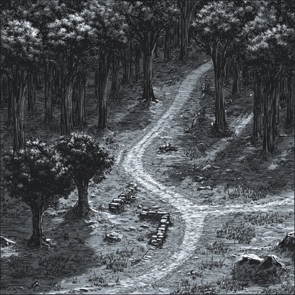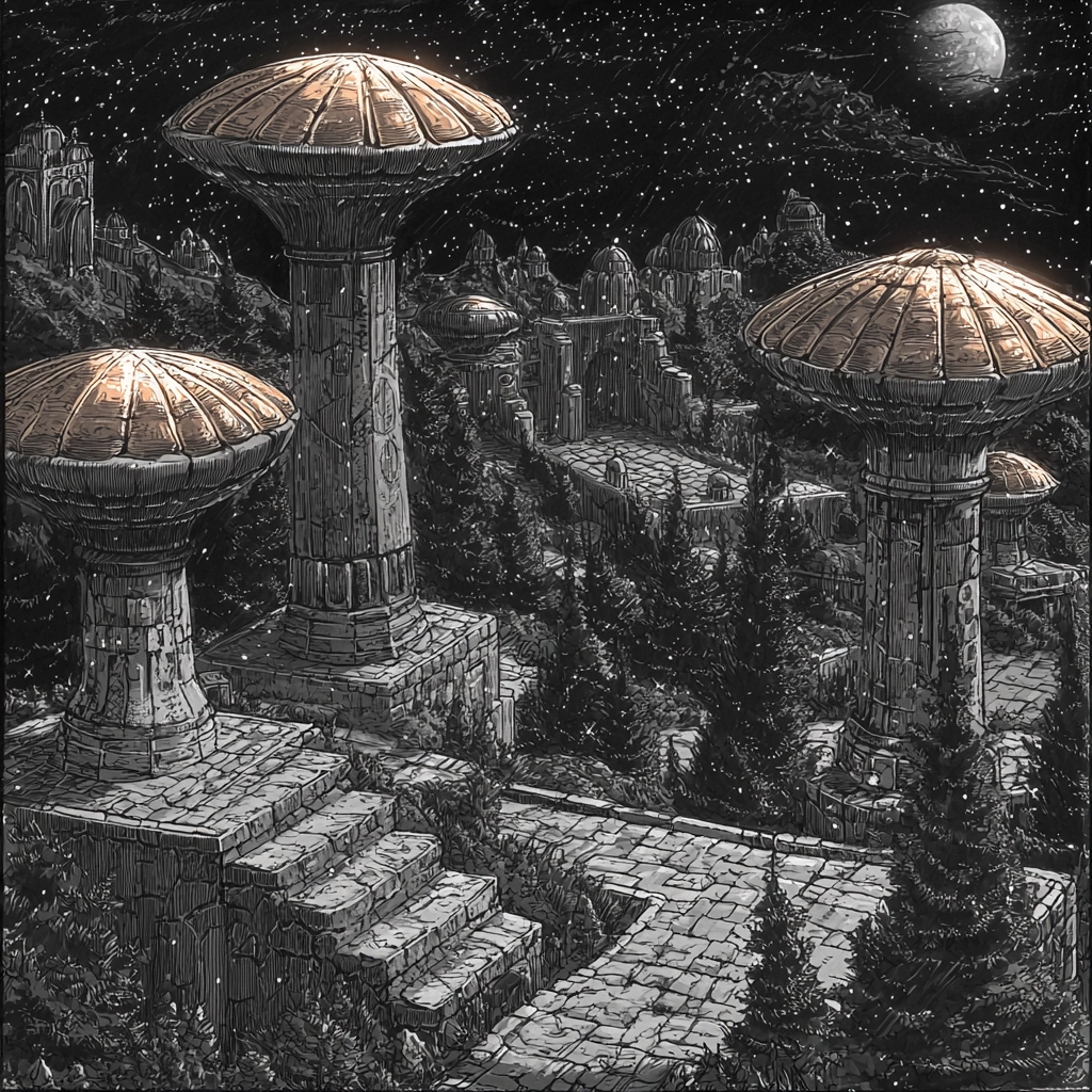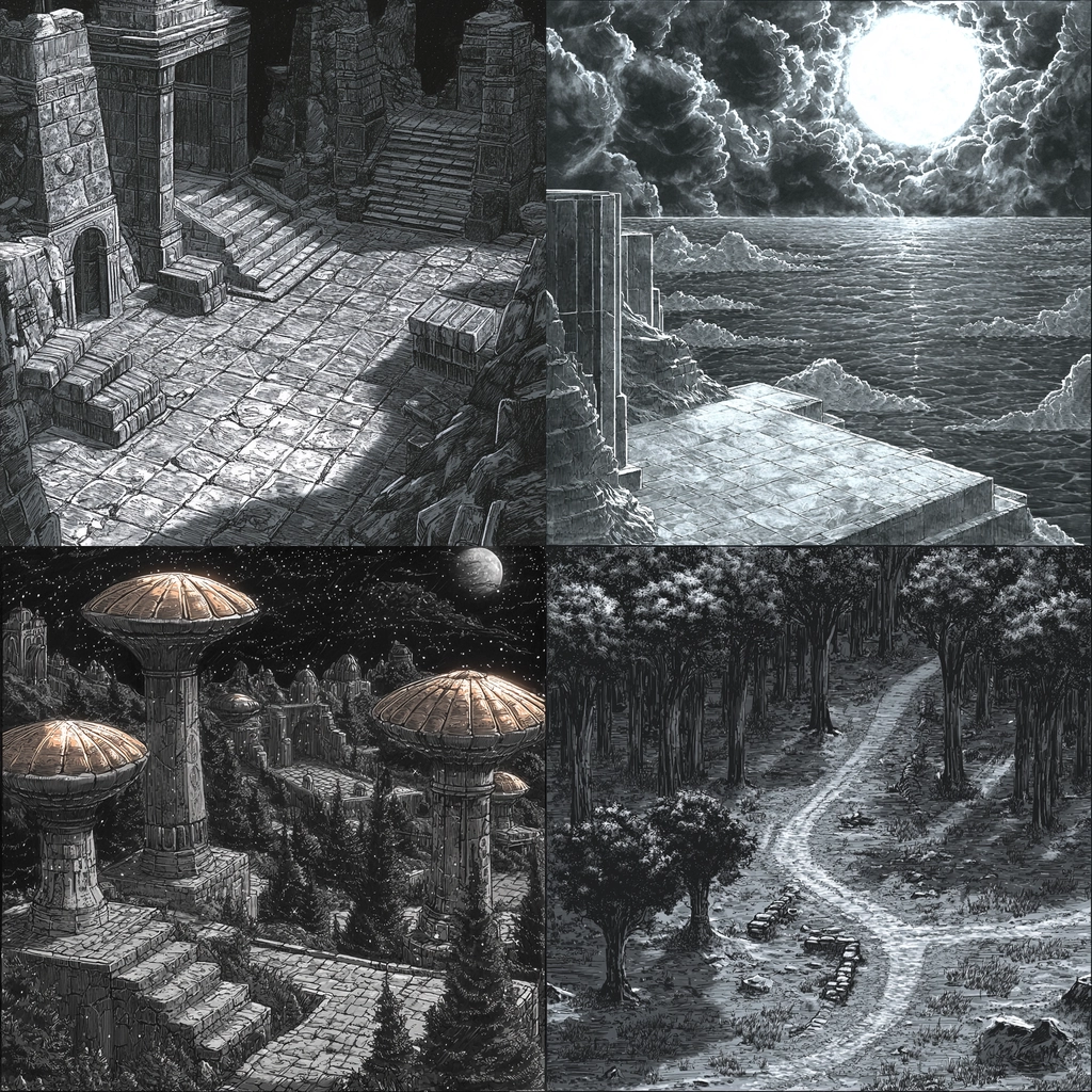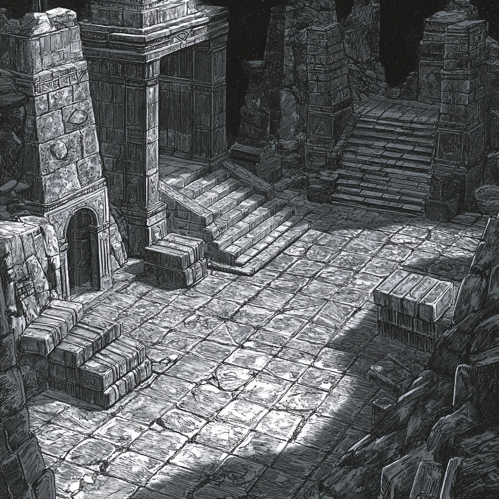 The interplay of light and shadow creates depth and texture, emphasizing architectural forms and natural elements. The monochromatic palette enhances the clarity of lines and shapes, producing a balanced composition with subtle visual tension.