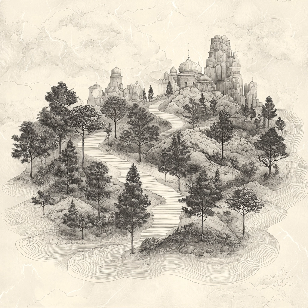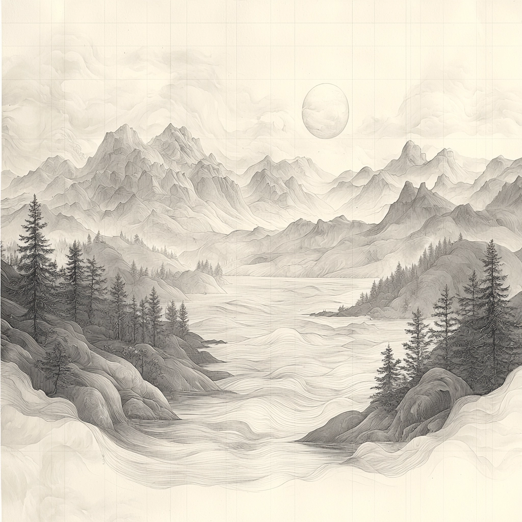 Subtle lighting highlights intricate details, creating a soft interplay of shadows and highlights. The grayscale palette emphasizes texture and fine lines, giving depth to each element. Spaces have a layered quality, with strong sense of balance and harmony.