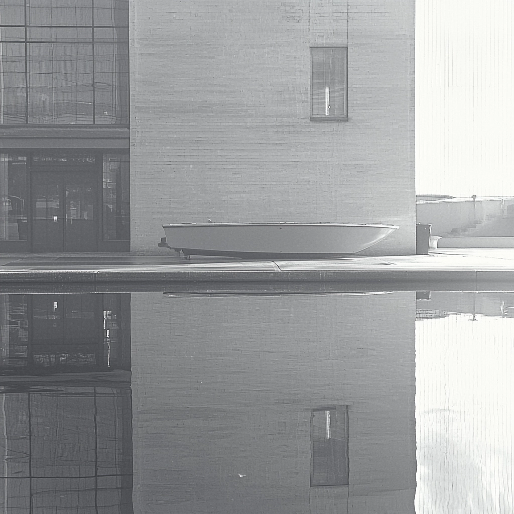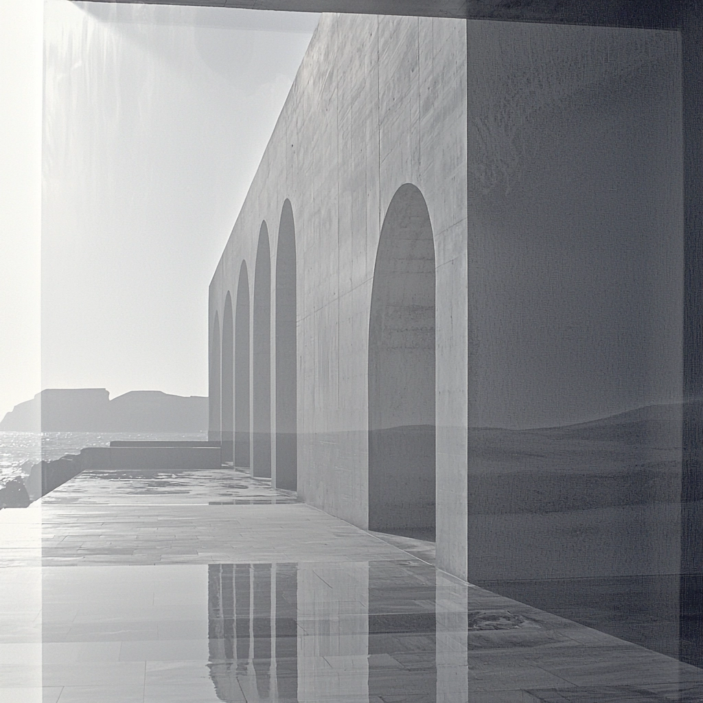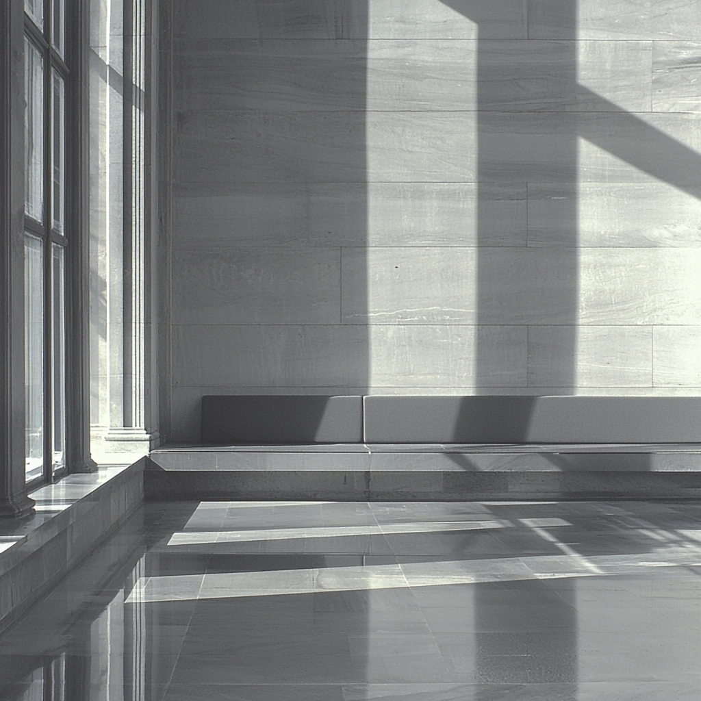 The lighting emphasizes large, geometric forms and reflects smooth surfaces, creating gradients that enhance the spaciousness. The monochrome palette accentuates contrast and texture, offering depth to the rigid, symmetric composition.