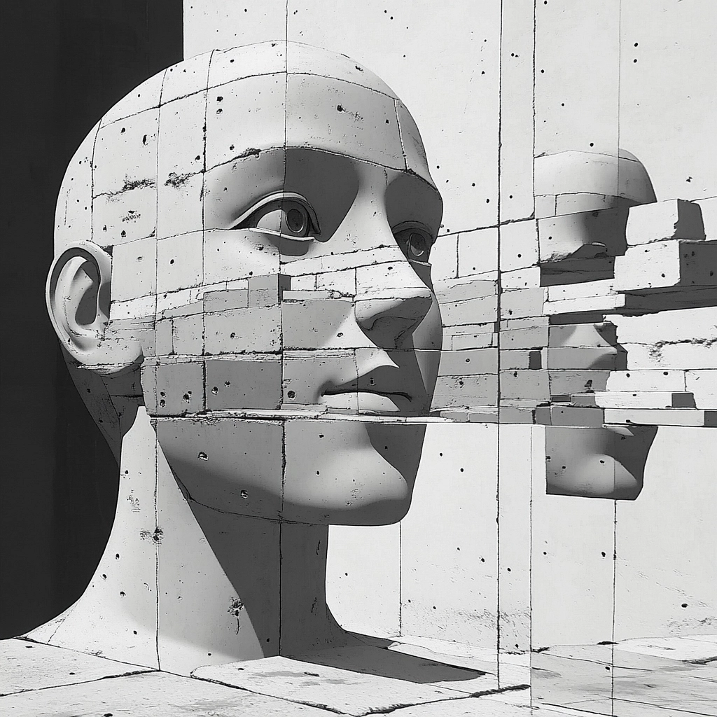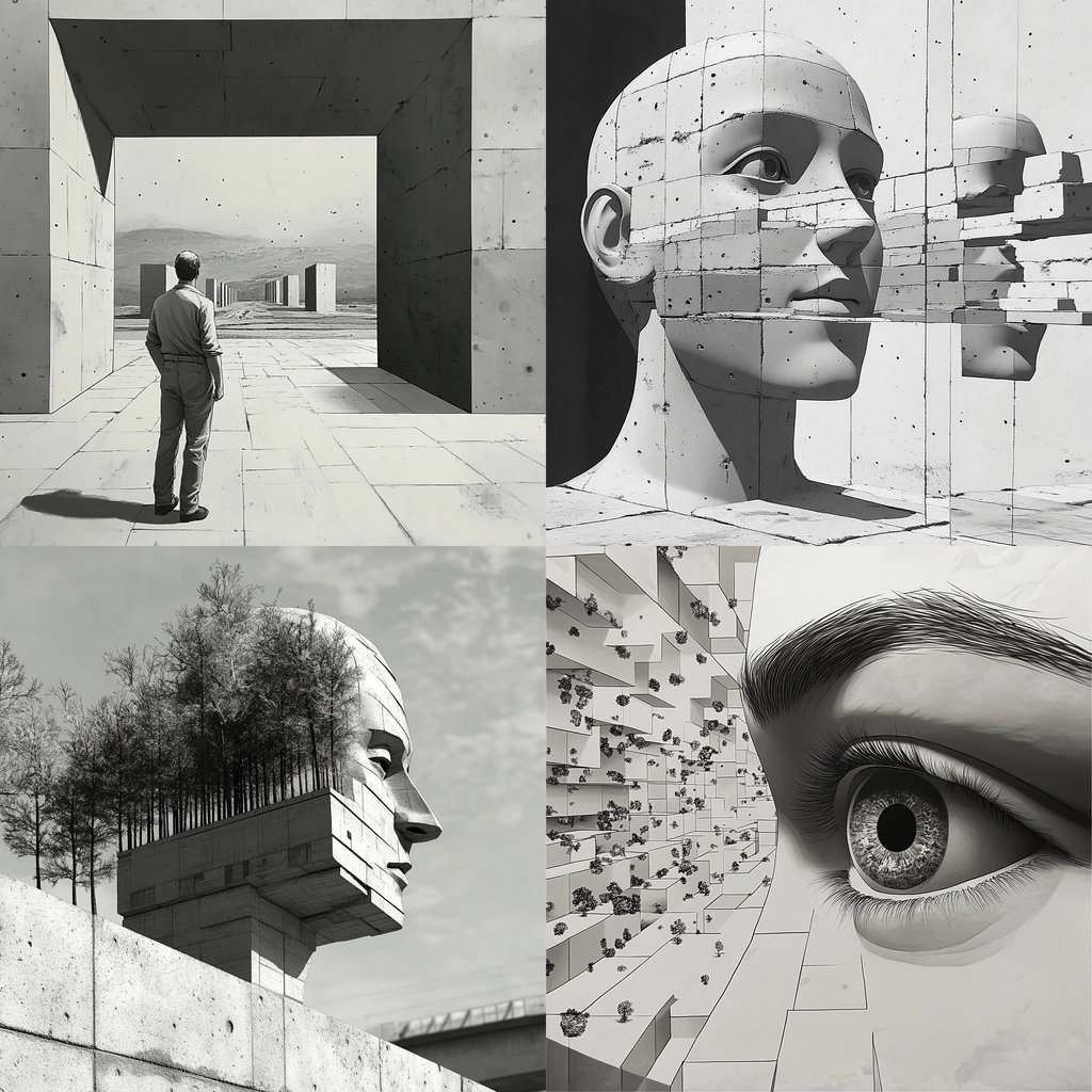 Hard-edged lighting and shading emphasize the geometric forms and spatial depth, with smooth textures highlighting the surreal and architectural compositions. The use of grayscale enhances the contrast and linear precision, creating a sense of both clarity and abstraction.