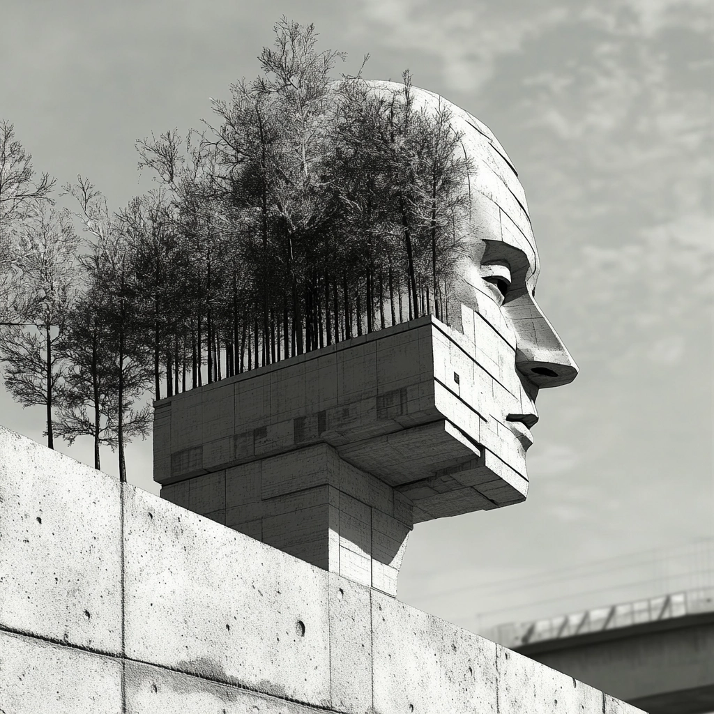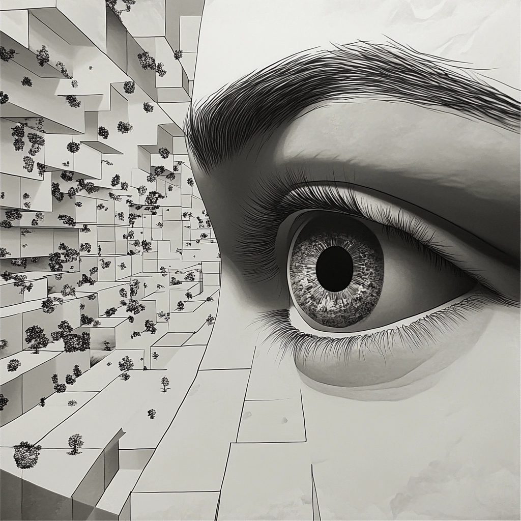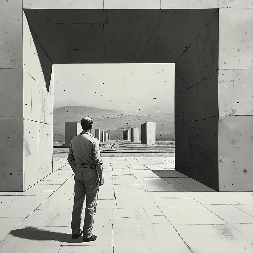Grayscale tones create a stark, surreal atmosphere with architectural elements.