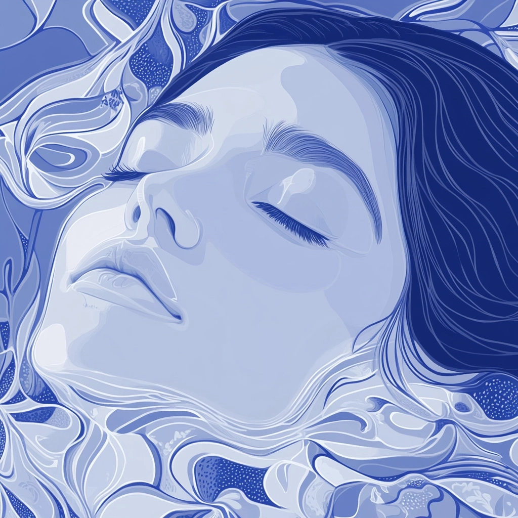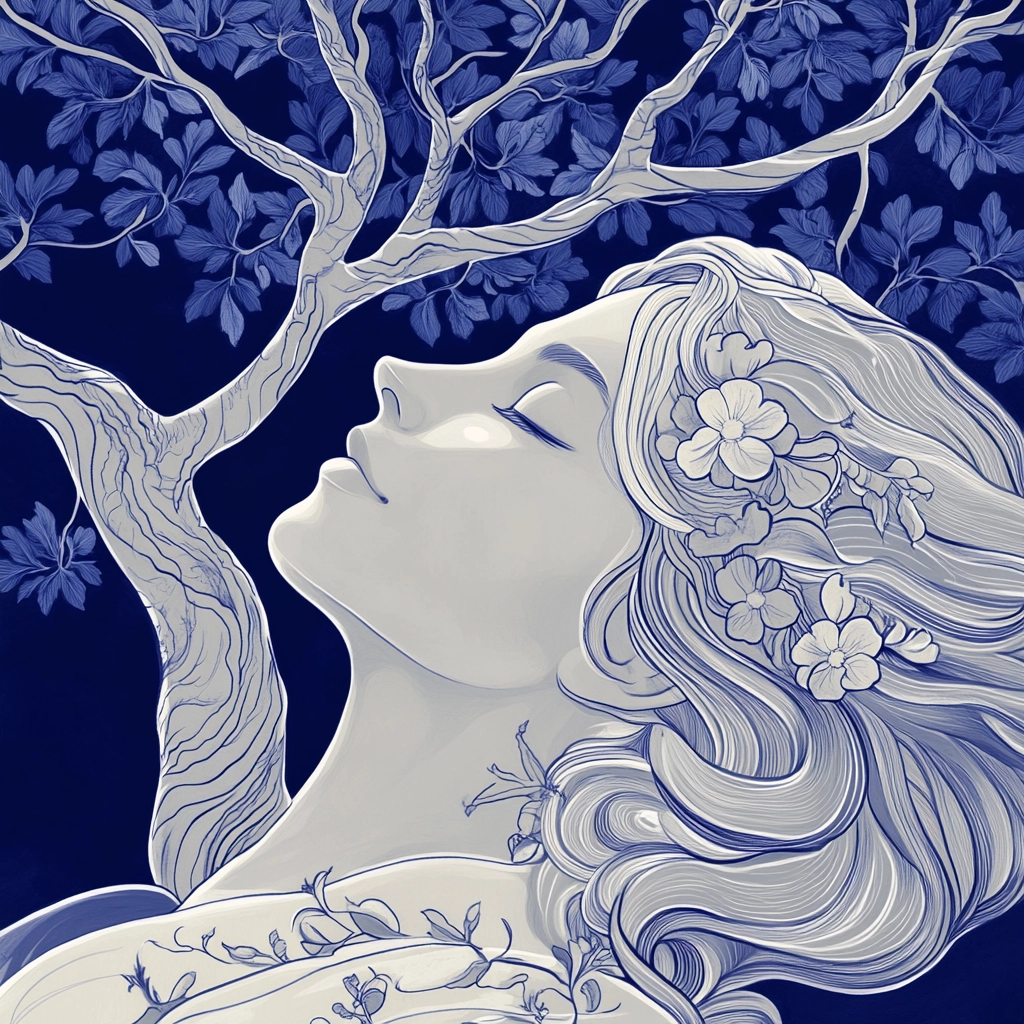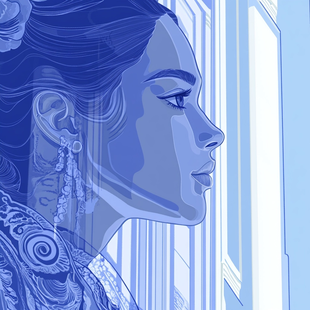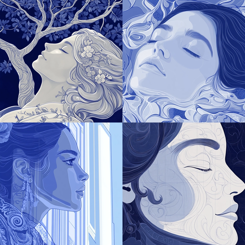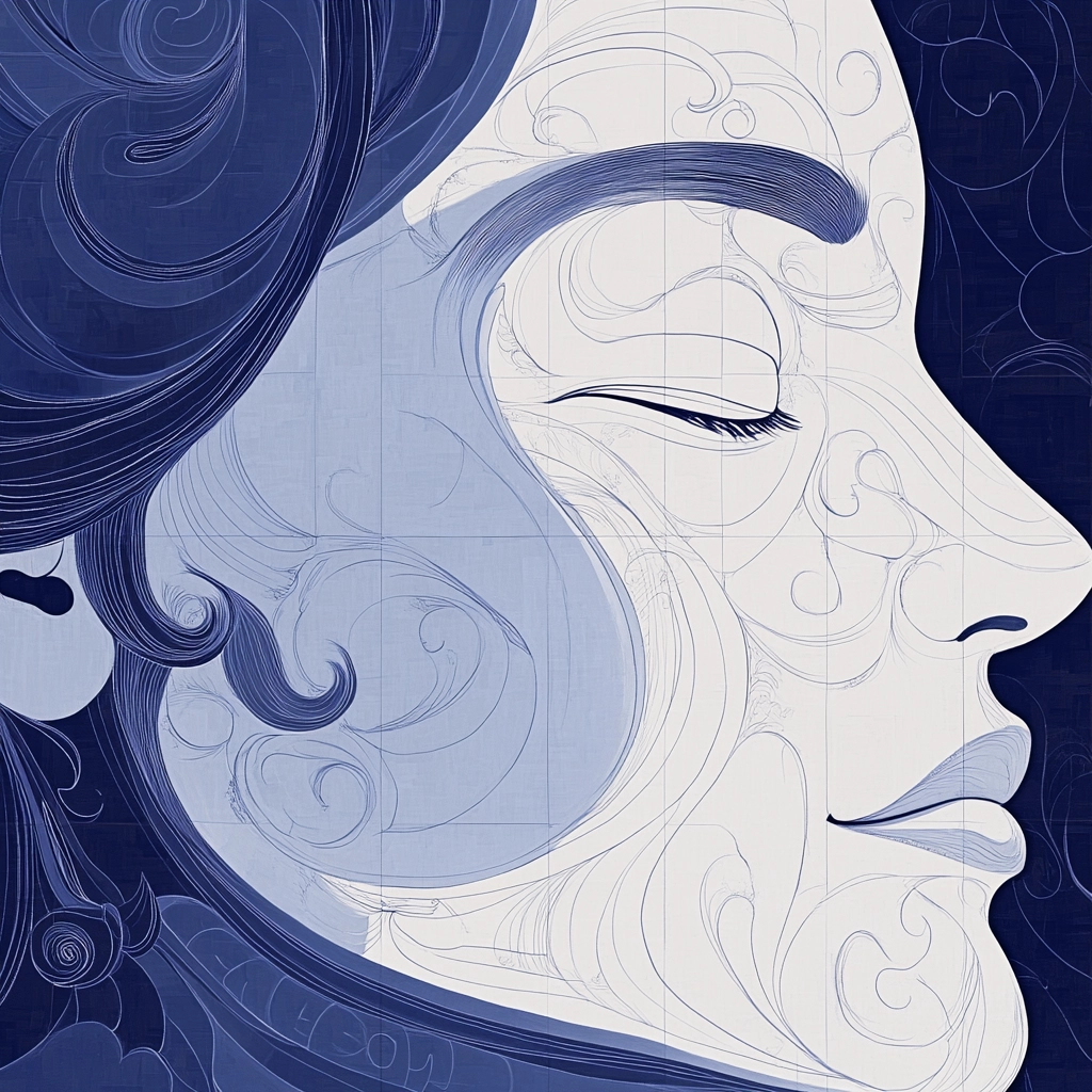 Intricate line work and floral motifs dominate the cool-toned blue and white composition, emphasizing fine details and decorative patterns.