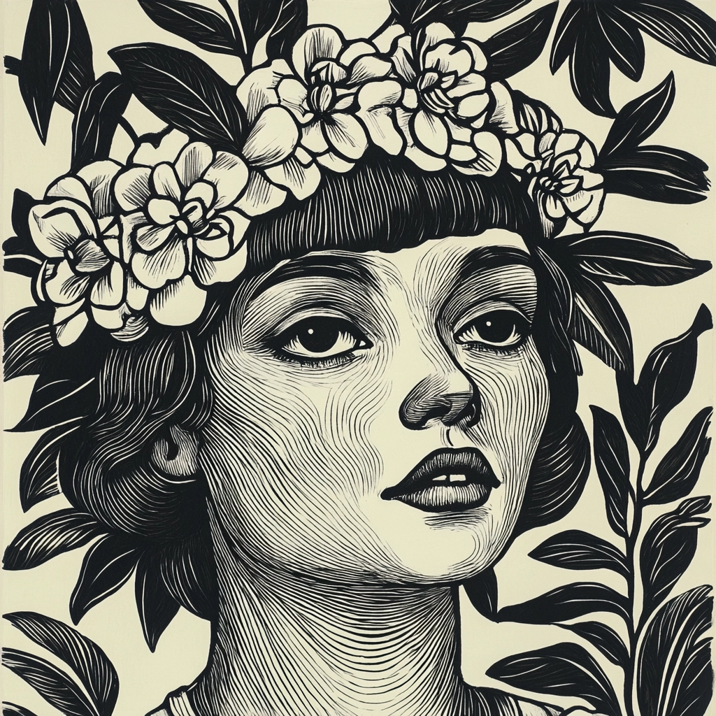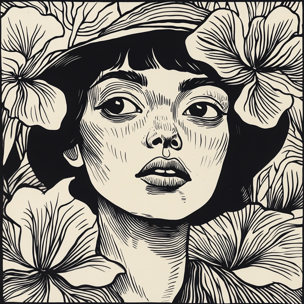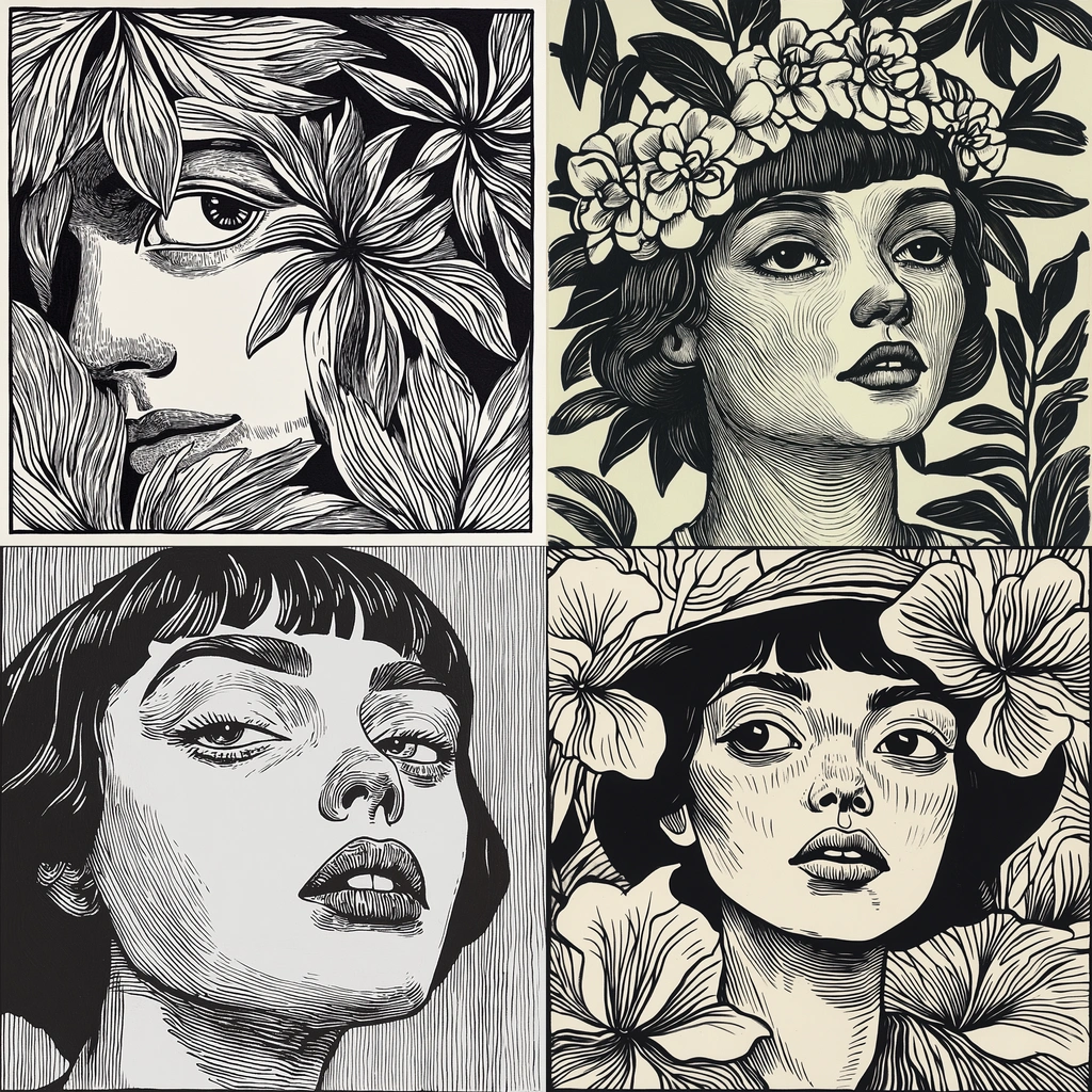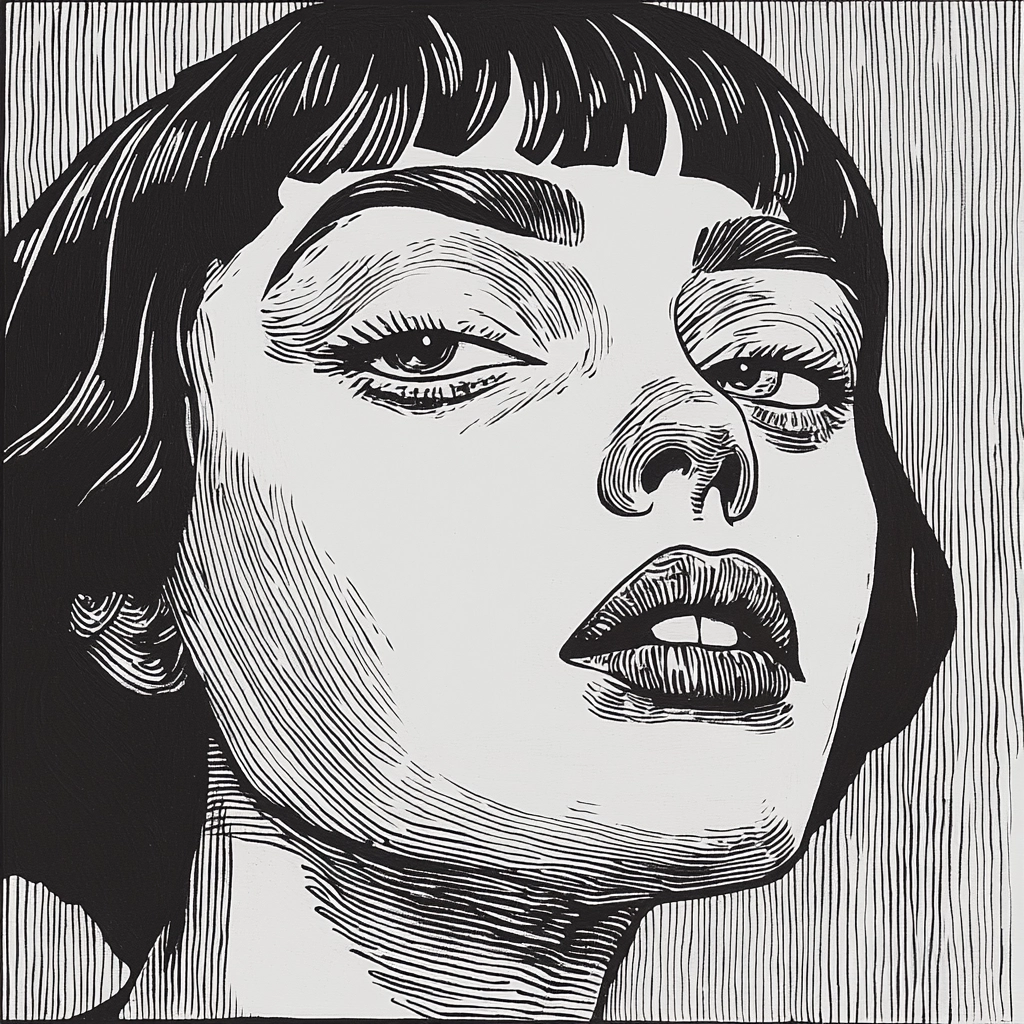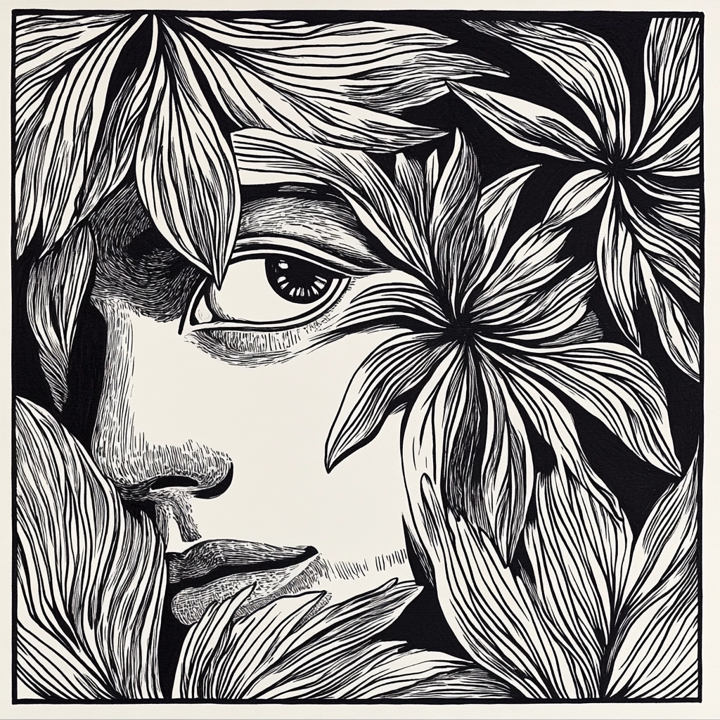 The artwork features stark contrasts with detailed line work creating intricate patterns. The black and white theme enhances the linear designs and imparts a flat spatial quality, while textures are emphasized through dense line use.